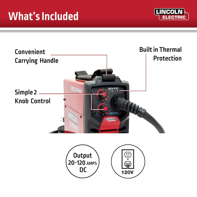 - WELDING CAPABILITES: Flux-cored welding up to 120Amps and a maximum thickness of 1/4in
