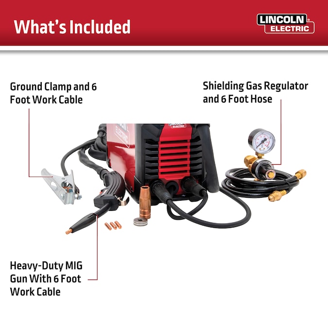 - Includes: MIG & Flux-Cored Welding Machine, Ground Clamp with 6 ft Cable, WP100L Gun with 6 ft Cable, 0.025in Contact Tip, 0.030in Contact Tip, 0.035in Contact Tip, Gasless Nozzle, Gas Nozzle, Dual Track Drive Rolls for MIG & Flux-cored welding, Harris Gas Regulator, Instruction Manual
