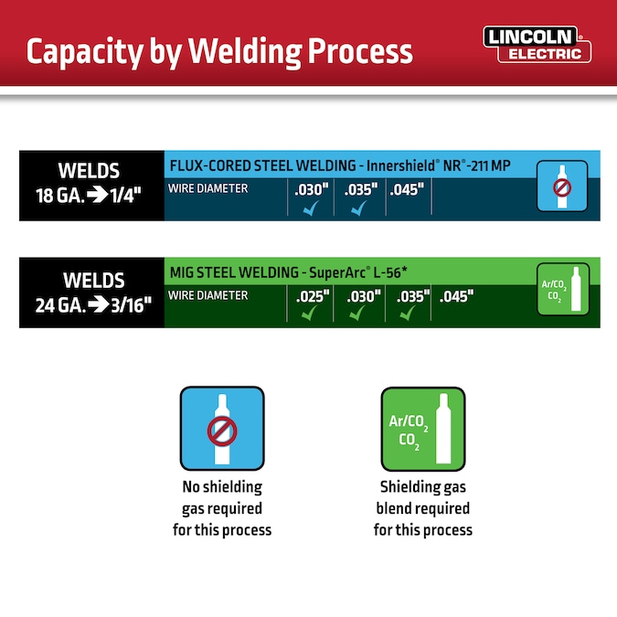 - WELDING CAPABILITES: Flux-cored welding with a maximum thickness of 1/4 in, MIG weld up to maximum thickness of 3/16in