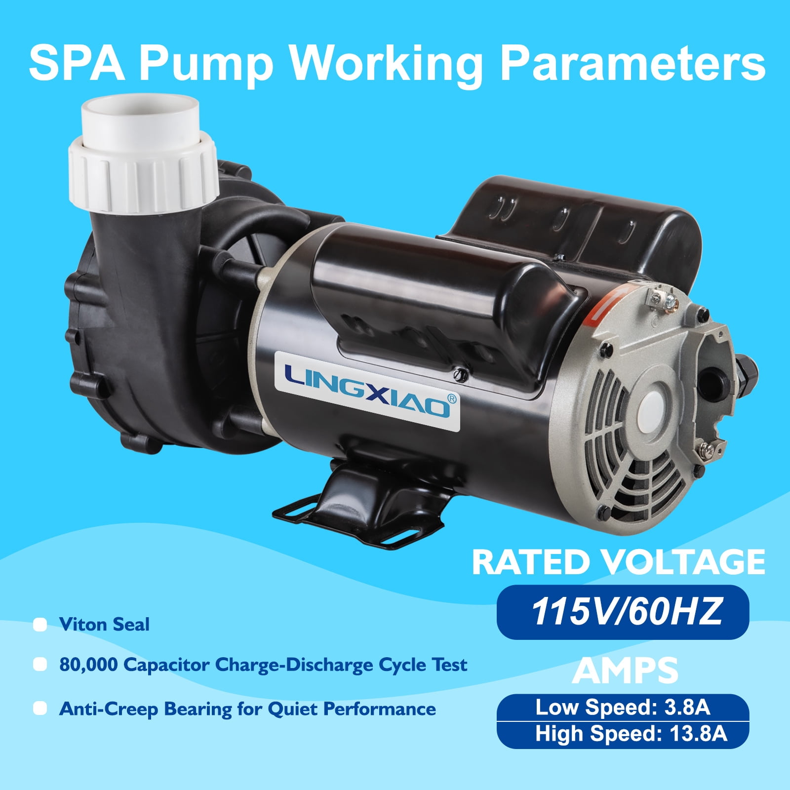 【LINGXIAO 48WUA1501C-II SPA Pump】: Perfect match OEM model: #3420610-1U;#3420610-15; OEM#39583; OEM#02115000-1010;#06115000-1040;#02615000-1010;#02115000-1010;OEM#DJAYFA-0151;#1014025;#1014056;#1014084;#1014002;#1014055;#1014054. 【2 Speed SPA Pump Parameter】: 115V/60HZ, Low speed 3.8A ~ Hight speed 13.8A, 0.45HP & 2.0HP, Connect 2″ plumbing. 【High Performance Motor Design】: 80,000 capacitor charge-discharge cycle tests,and thermal protector from Texas Instruments. Excellent quality copper winding motor and Anti-Creep Bearing for longer & quiet operation. 【Application Suggestions】: Our spa pump can replace the ones from those popular pump suppliers and please verify Amps, Voltage and the size of intake & discharge. And we offer a free set of 2-inch union. 【In the Box & After-Sales】: 1 x 48WUA1501C-II SPA Pump & 2 x 2in Union. We provide 1 year Warranty for all pumps,please confirm the parameters of your old pump when purchasing or Contact LINGXIAO PUMP support for your inquiry and our team will solve your problem within 24 hours.