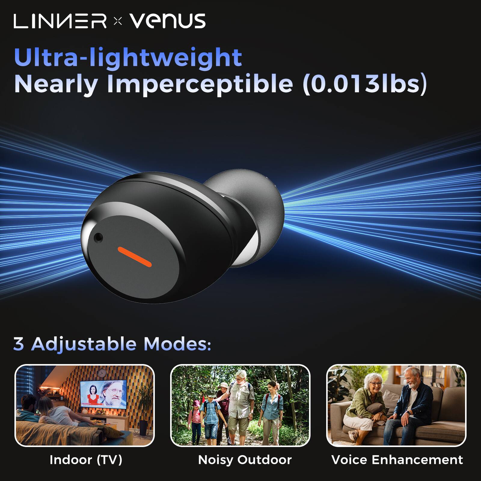Experience crystal-clear sound with LINNER Venus High-Fidelity OTC Hearing Aids, featuring advanced digital technology for precise amplification, smart noise reduction for improved clarity, an ergonomic and discreet design for all-day comfort, user-friendly controls for easy operation, and extended battery life for continuous, worry-free wear.