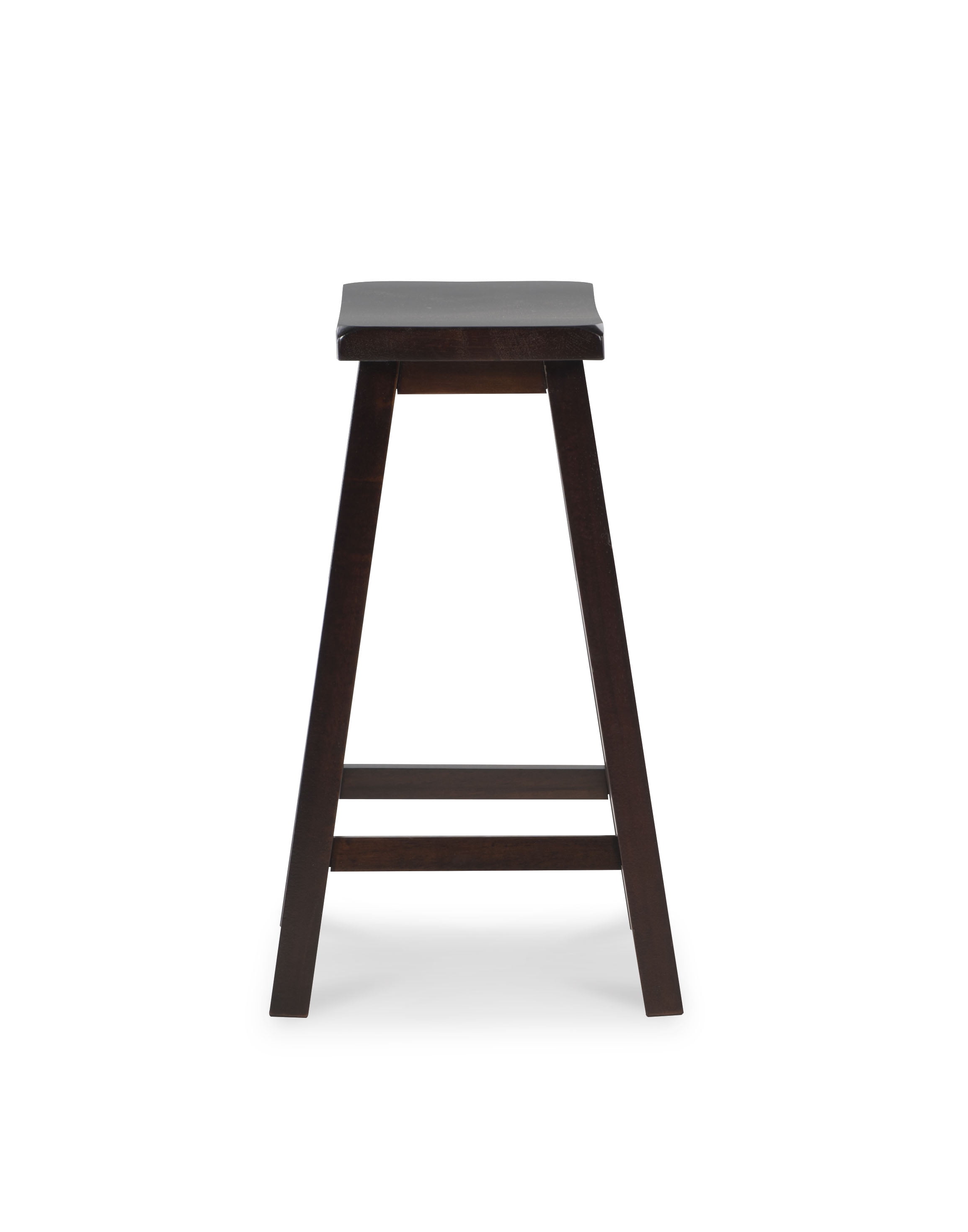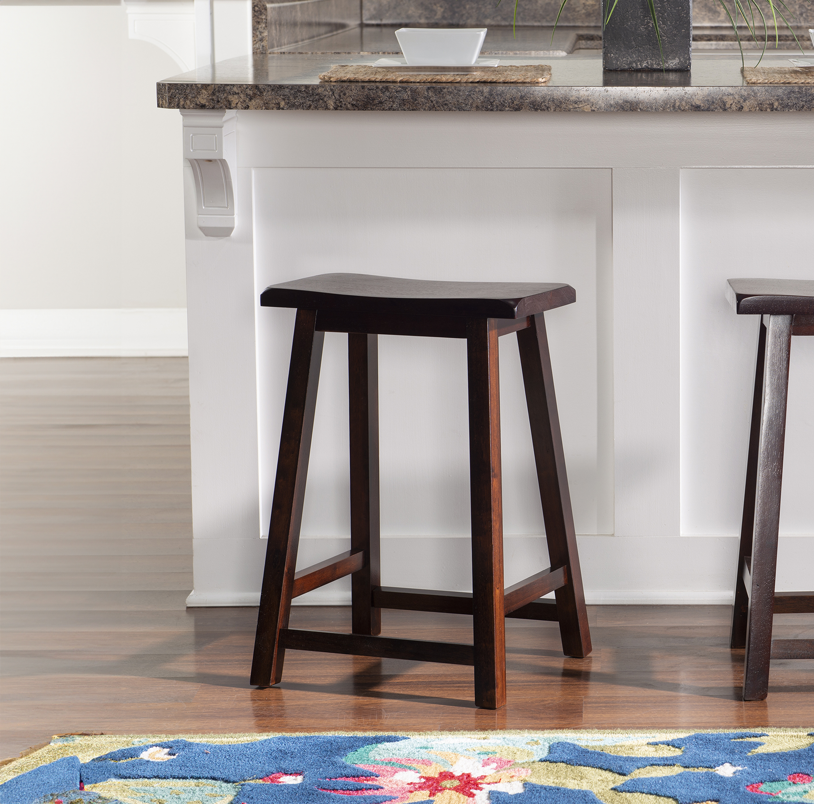 The classic design and style of the 24″ saddle stool easily complements any home’s décor. The sloping seat adds comfort to the stool while the four footrails provide stability and durability. Finished in a dark brown, this piece is an easy addition to any color scheme. Ideal for any home bar, counter or high top table. 275 Pound weight limit. For Indoor use only. Condition: New