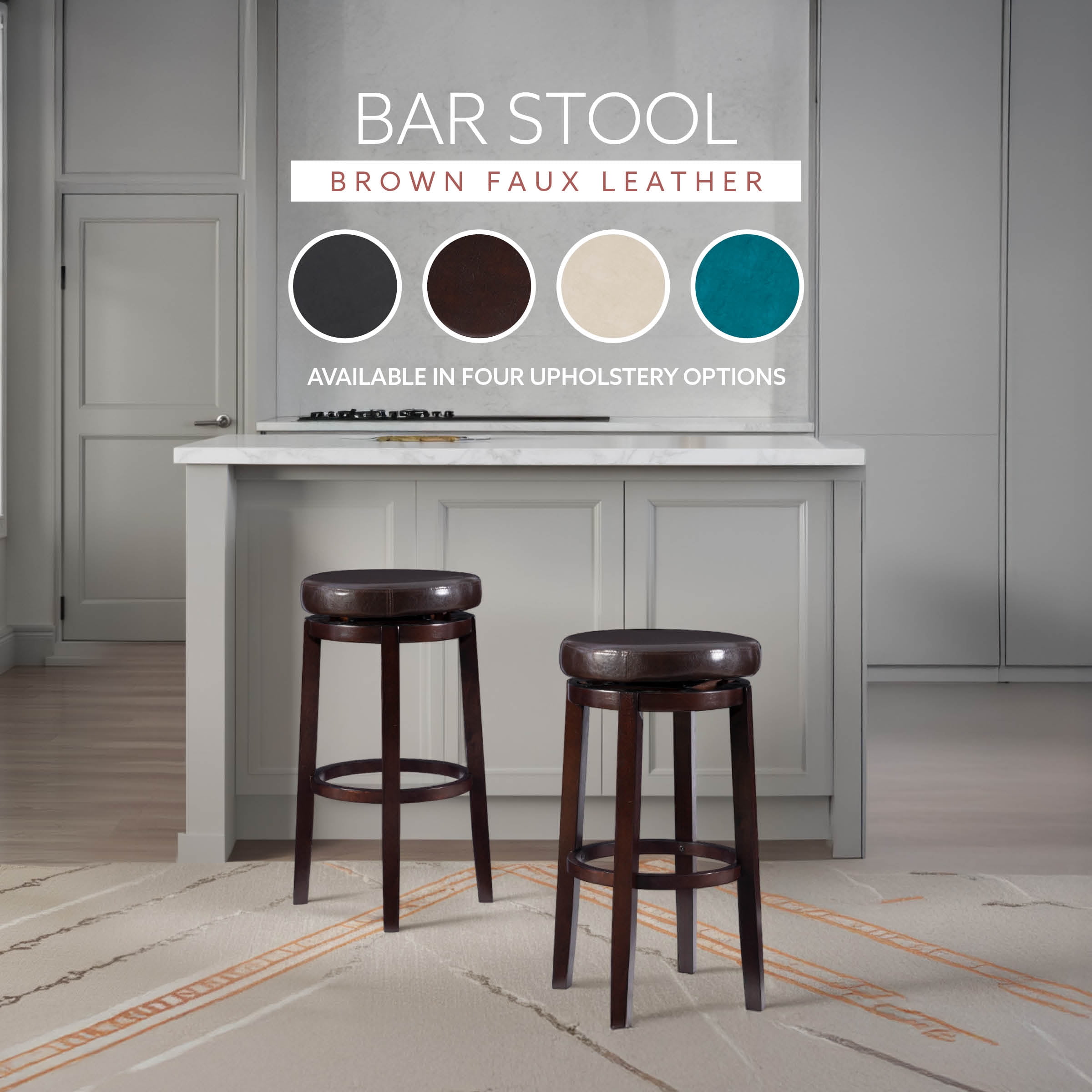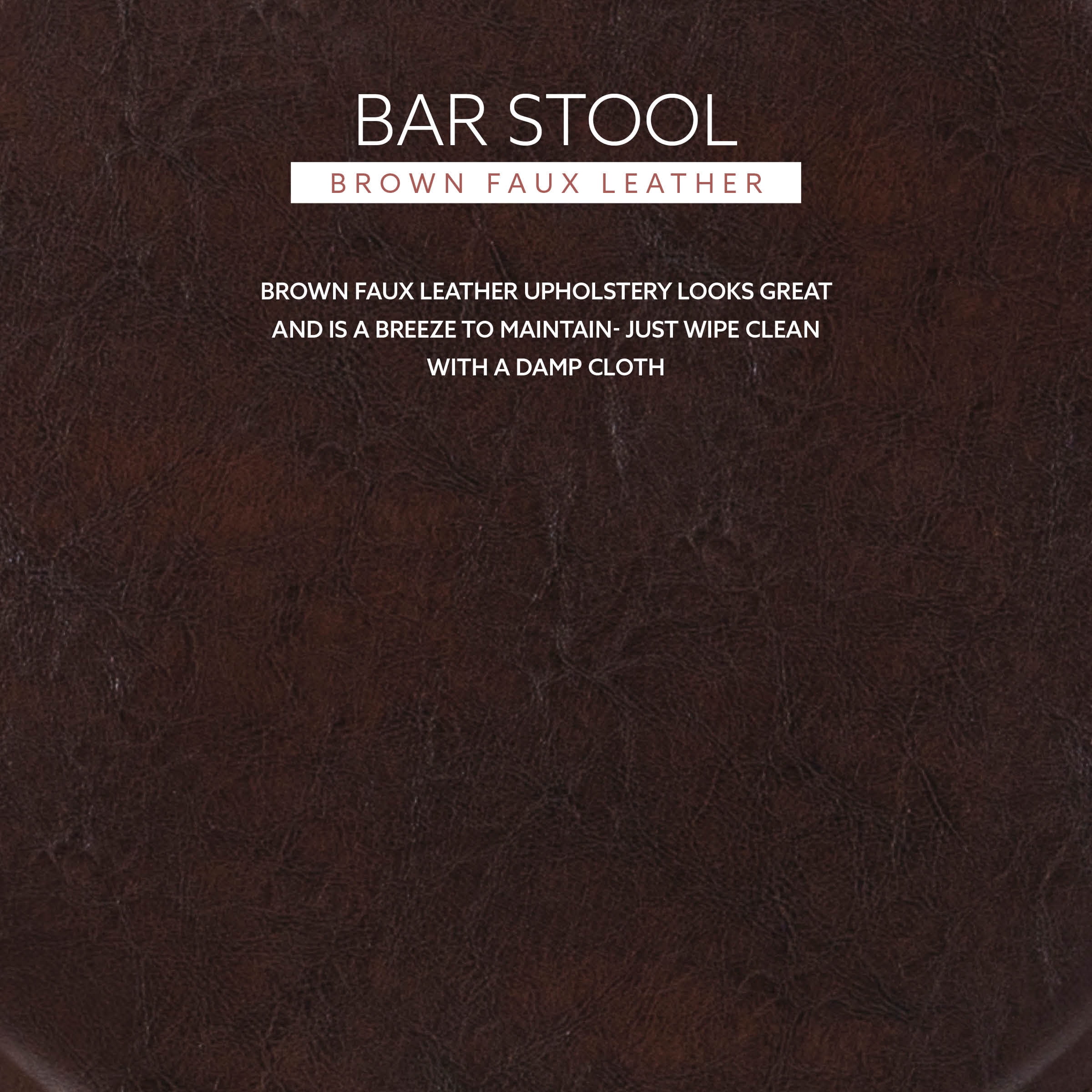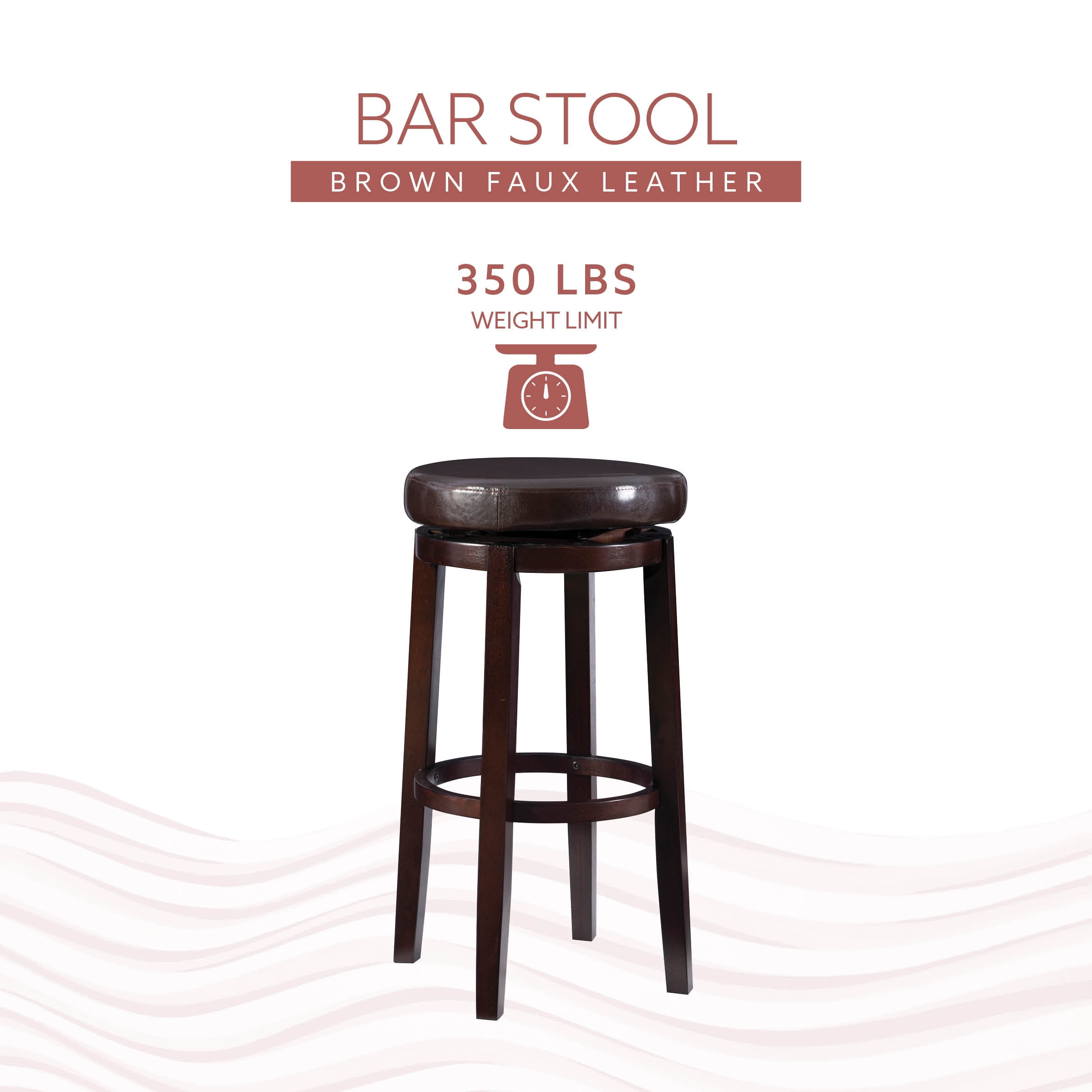 Transitional Design Wipe Clean Vinyl Plush Padding Swivel Seat Sturdy and durable construction 31″ seat height Weight Limit: 225 lbs Assembled Dimensions: 18.50″w x 18.50″d x 31.10″h Ships in 1 box For indoor use only