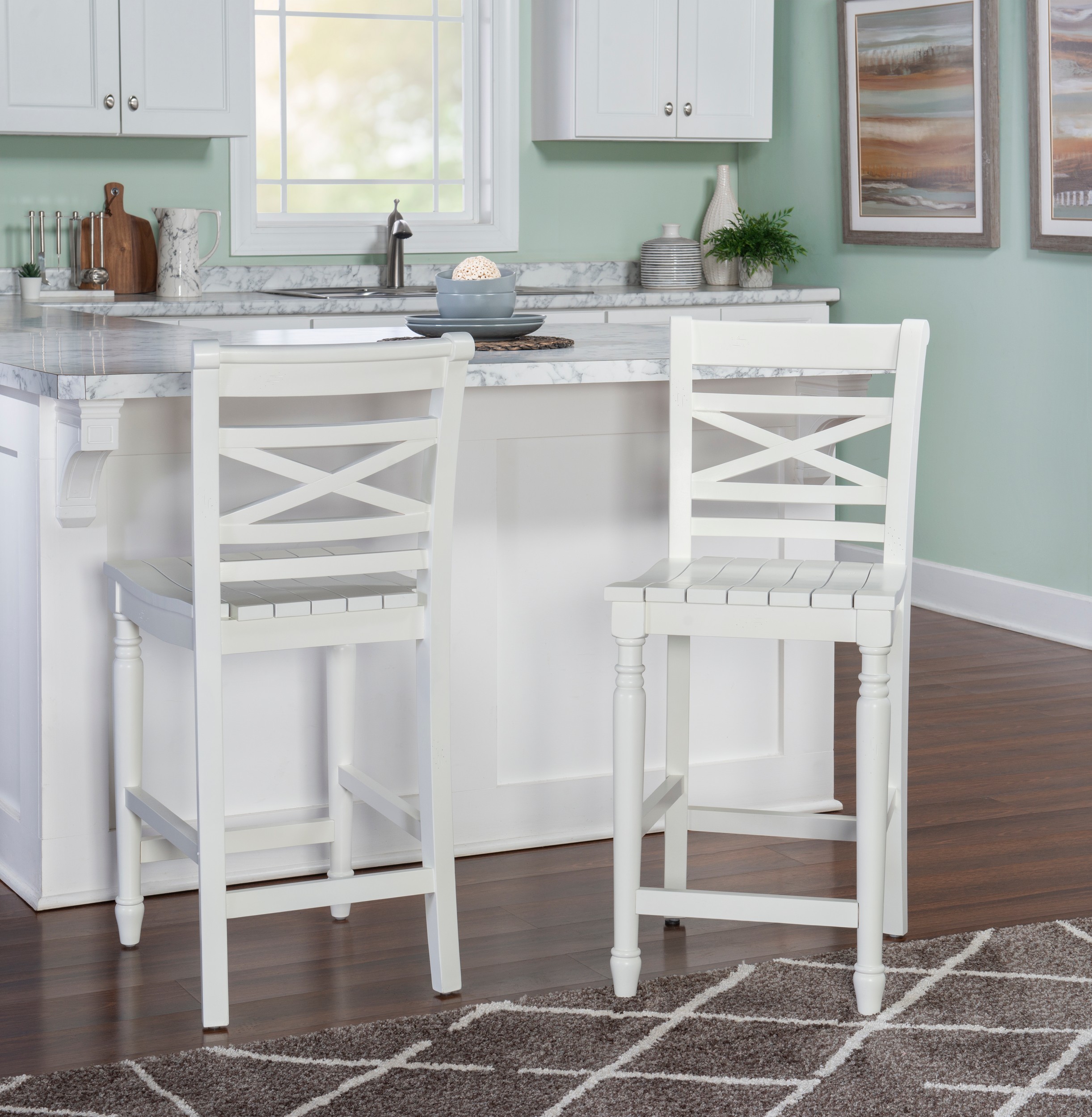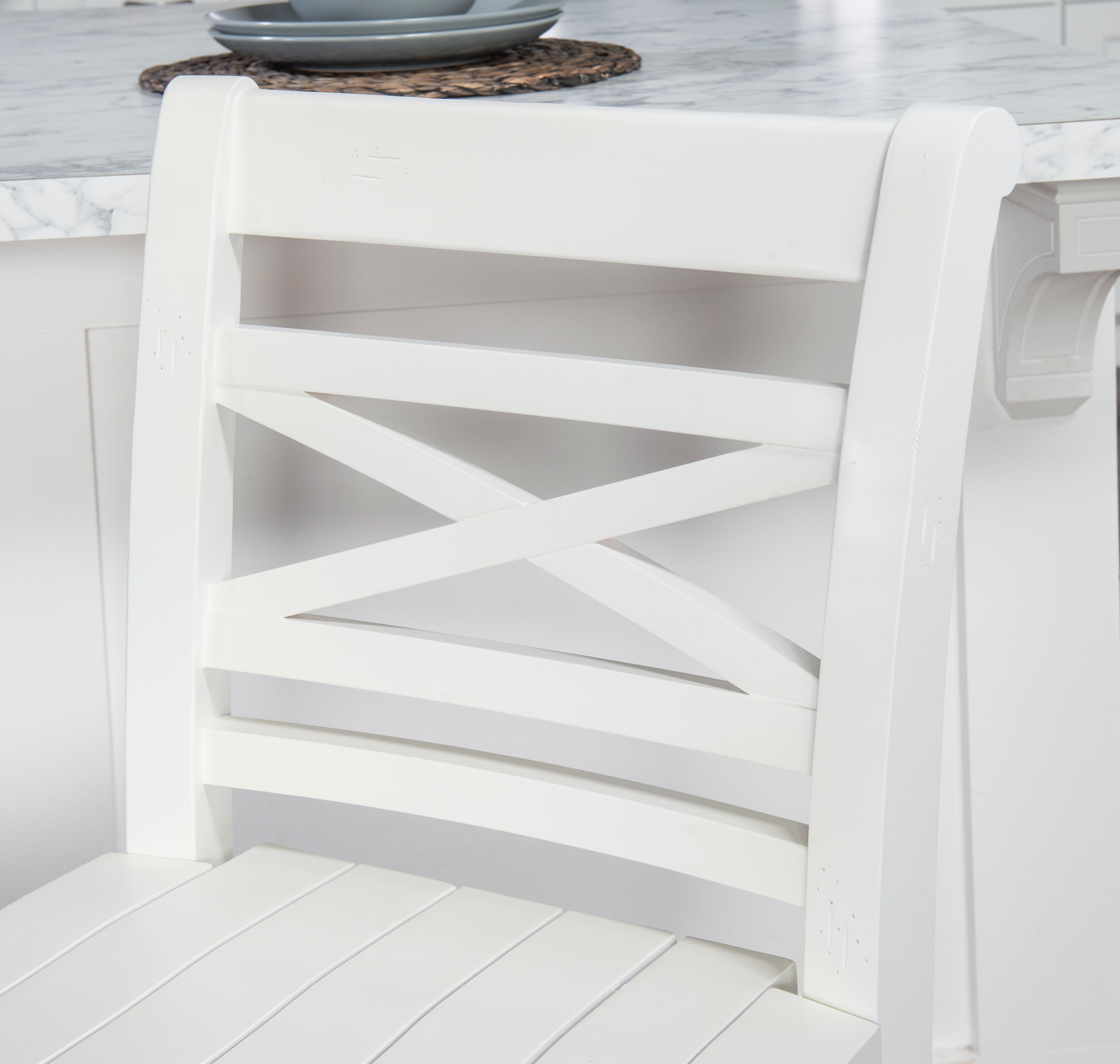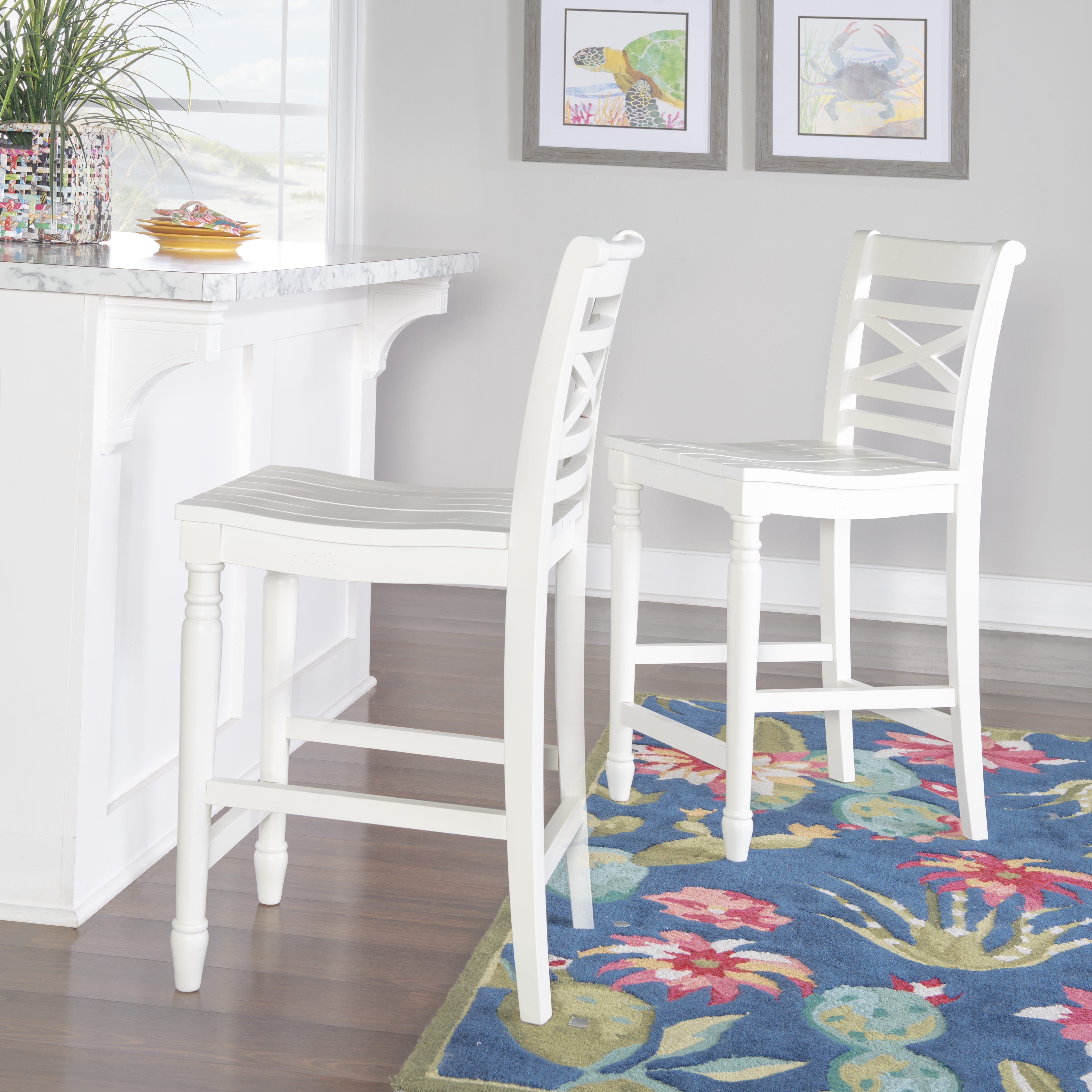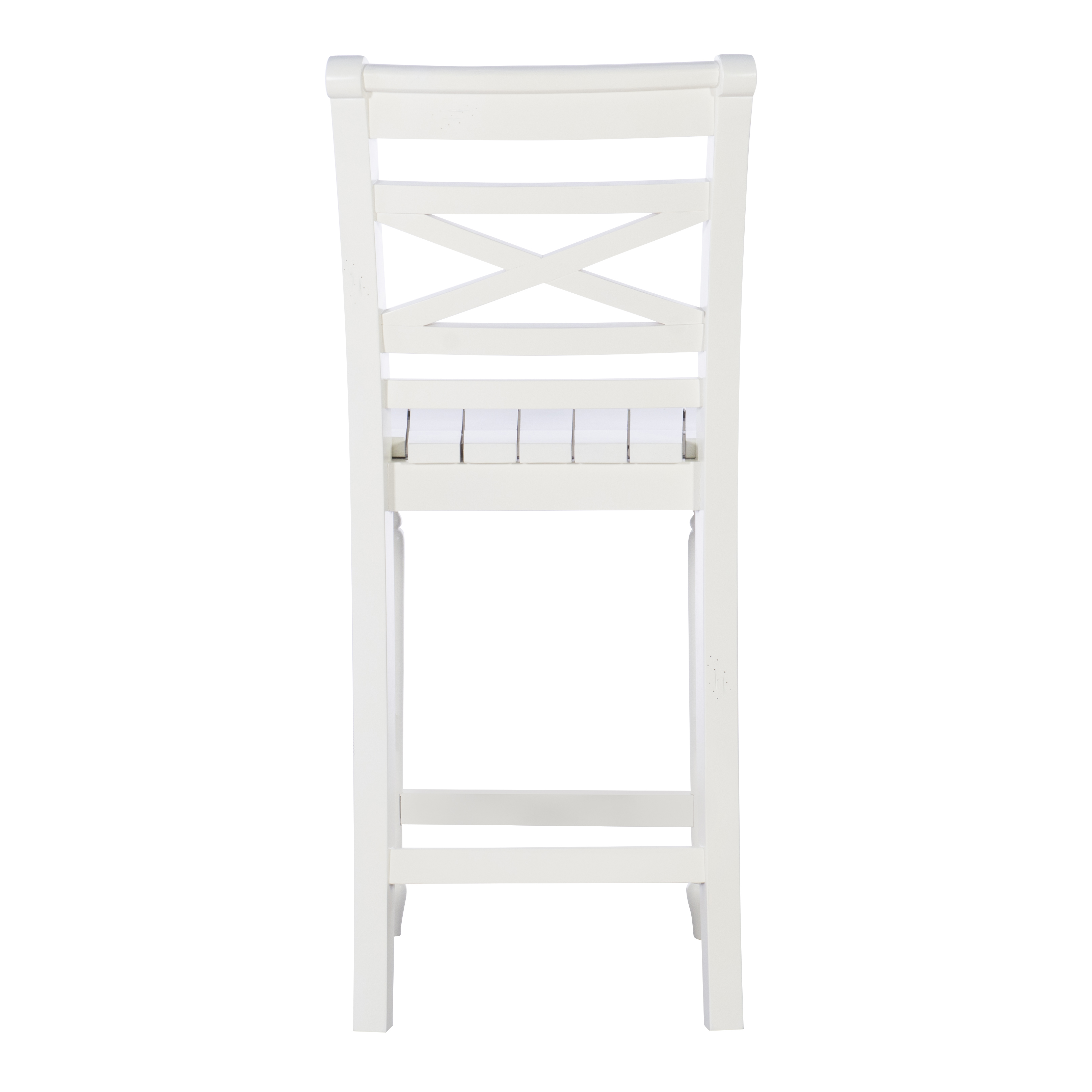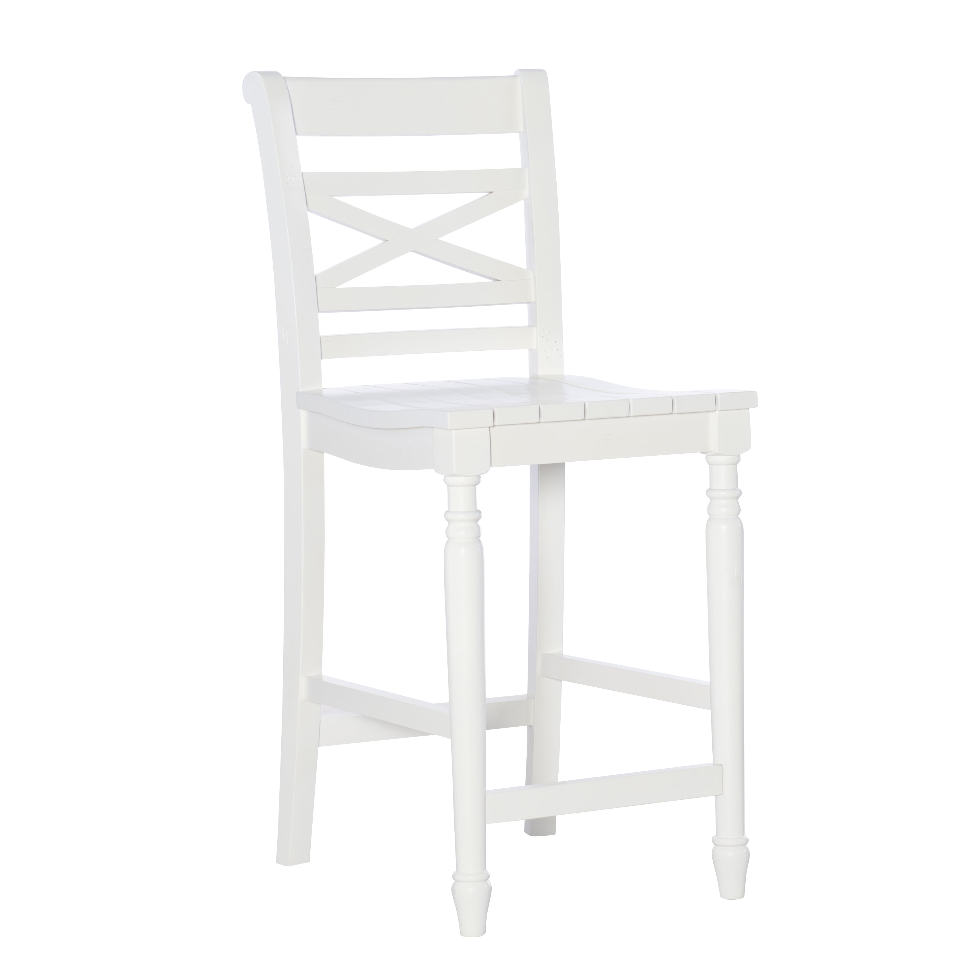 A piece of furniture that brightens up a home, this neatly crafted counter stool enhances casual room decor with its classic lines and details. The stool features a planked seat, a white finish and a tall back with an X design detail that gives it some extra style while providing support. Turned legs add to the look while stretchers provide additional stability. And the stool, with durable solid rubber wood and plywood construction, comes with a hefty 275 lb. weight capacity. Features: Crafted from Rubberwood and Plywood White Finish Compatible with counters and counter height tables ranging 34″ to 36″ high Tall back provides support with a central X detail Comfortable seat made of planked wood Circular wood brace acts as a footrest and sturdies the stool Counter Height Specifications: Assembly Required: Some Assembly Required Product Dimensions: 17″w x 21.33″d x 39.25″h Product Weight: 20.95 lbs Seat Height: 24.25″ Seat Dimensions: 17″ x 18.25″ Weight Capacity: 275 lbs