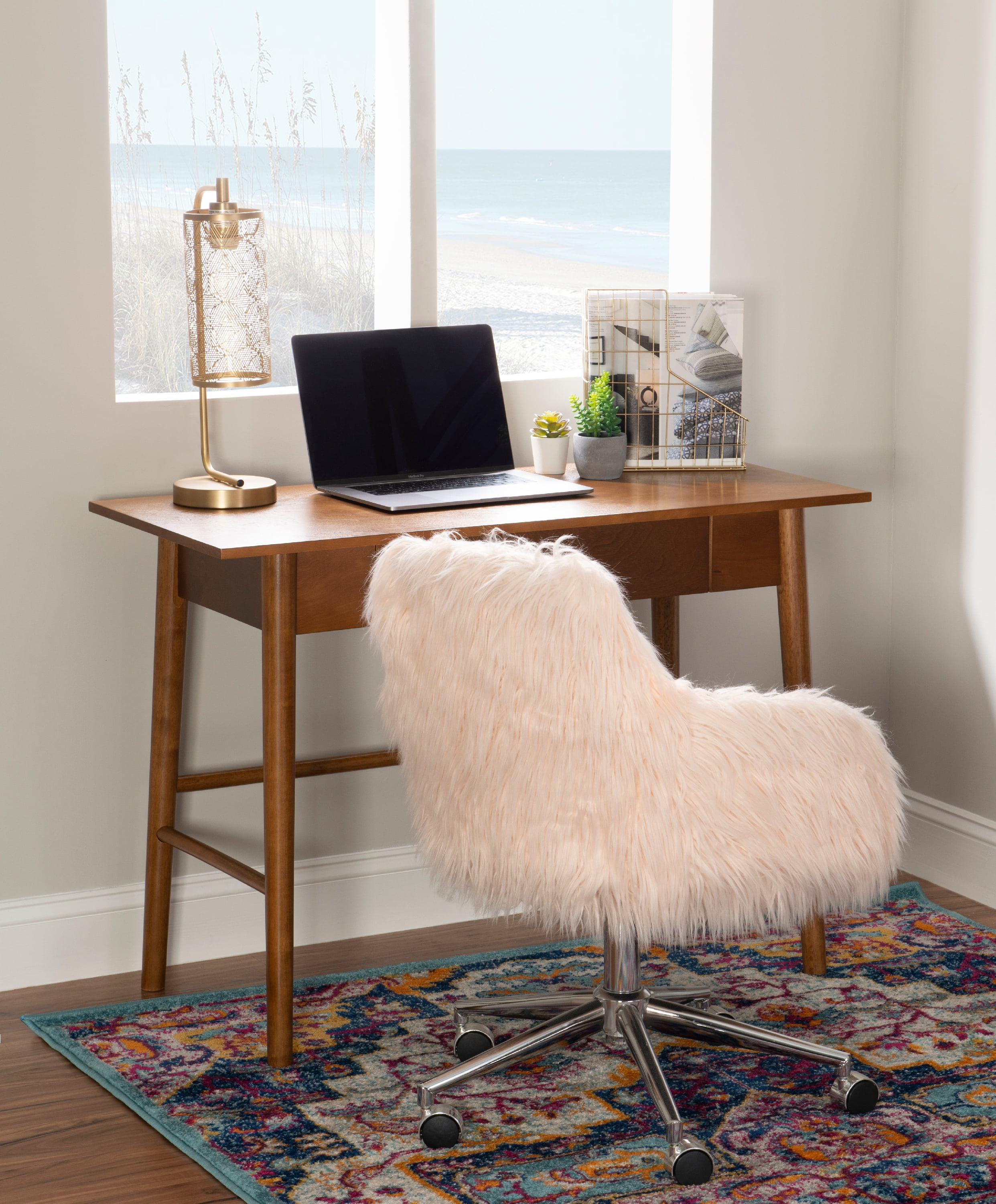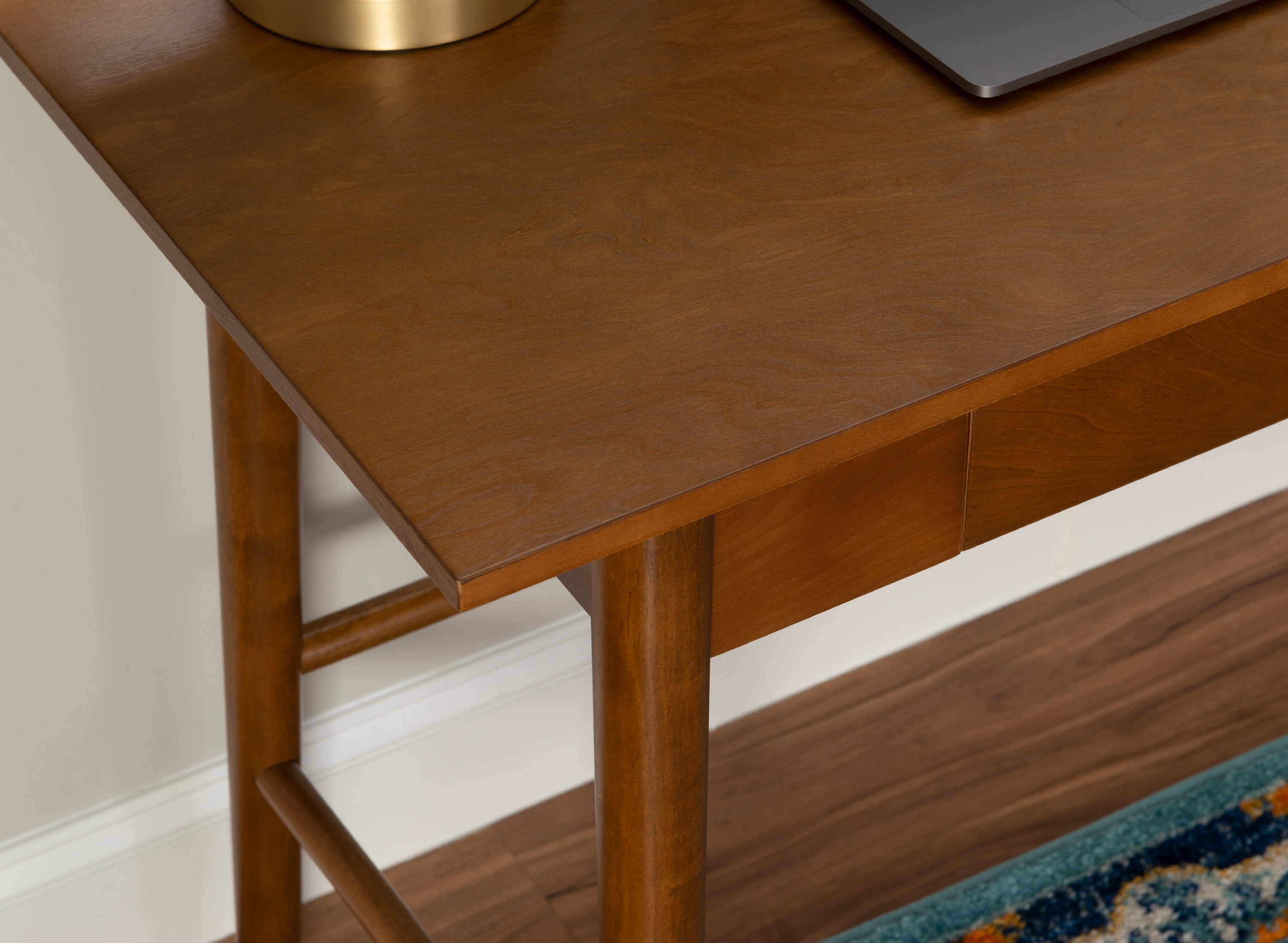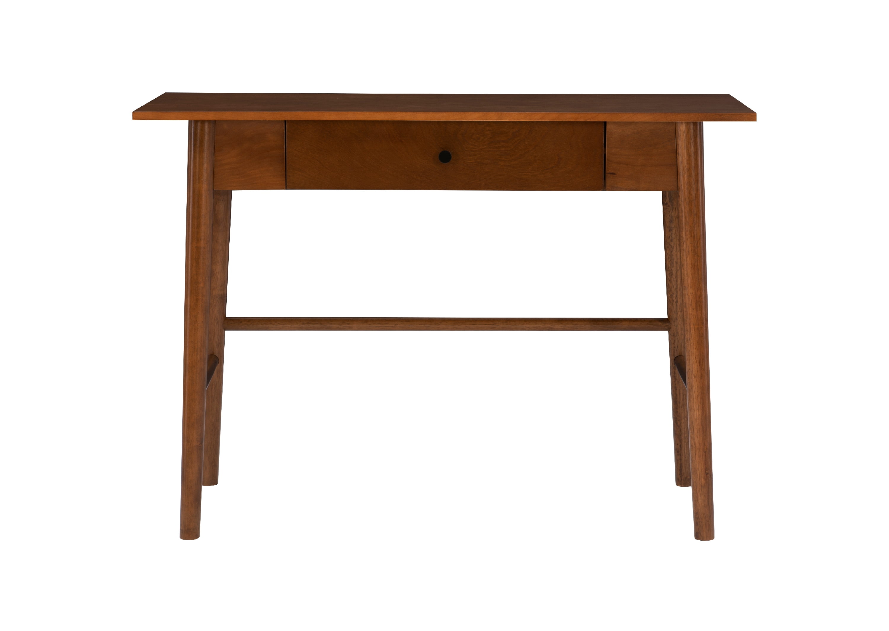 Introduce the robust look of mid-century modern style into your home with this handsome Linon Ashville Single Drawer Mid-Century Desk. Dynamic yet timeless, this piece features angled legs that create a sharp effect in any style of home. A center drawer keeps office supplies neatly organized. With its sleek walnut finish, this piece offers a rich warmth that complements any color scheme. Create your ideal work space with cohesive style by pairing this piece with others in the collection.