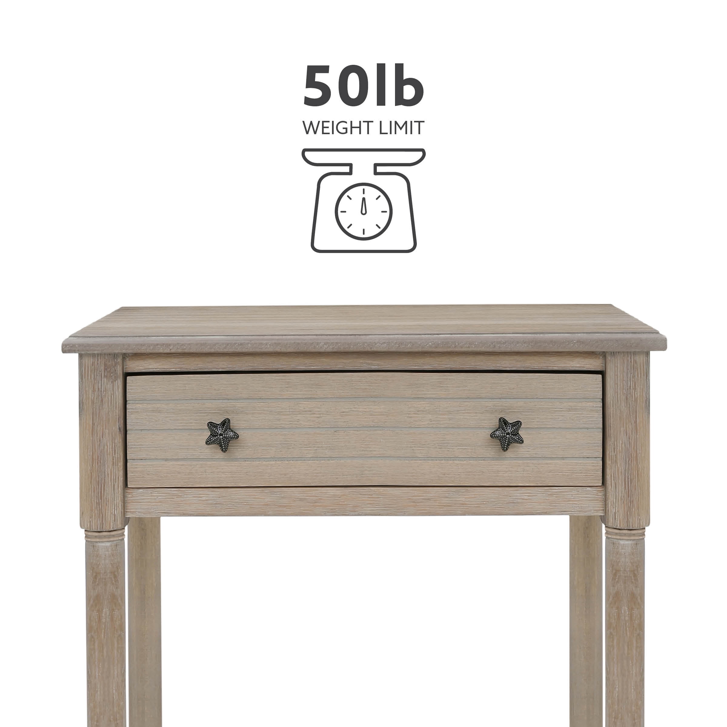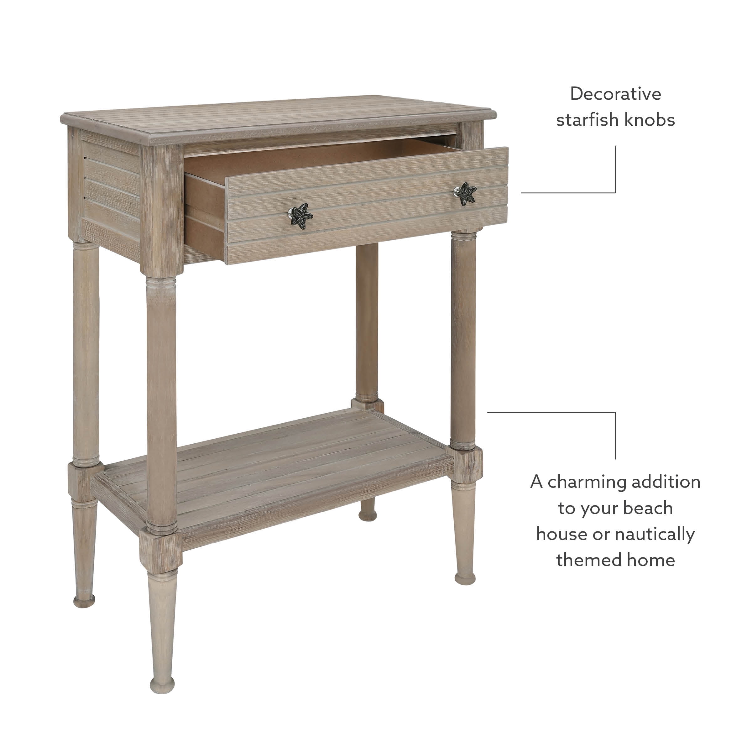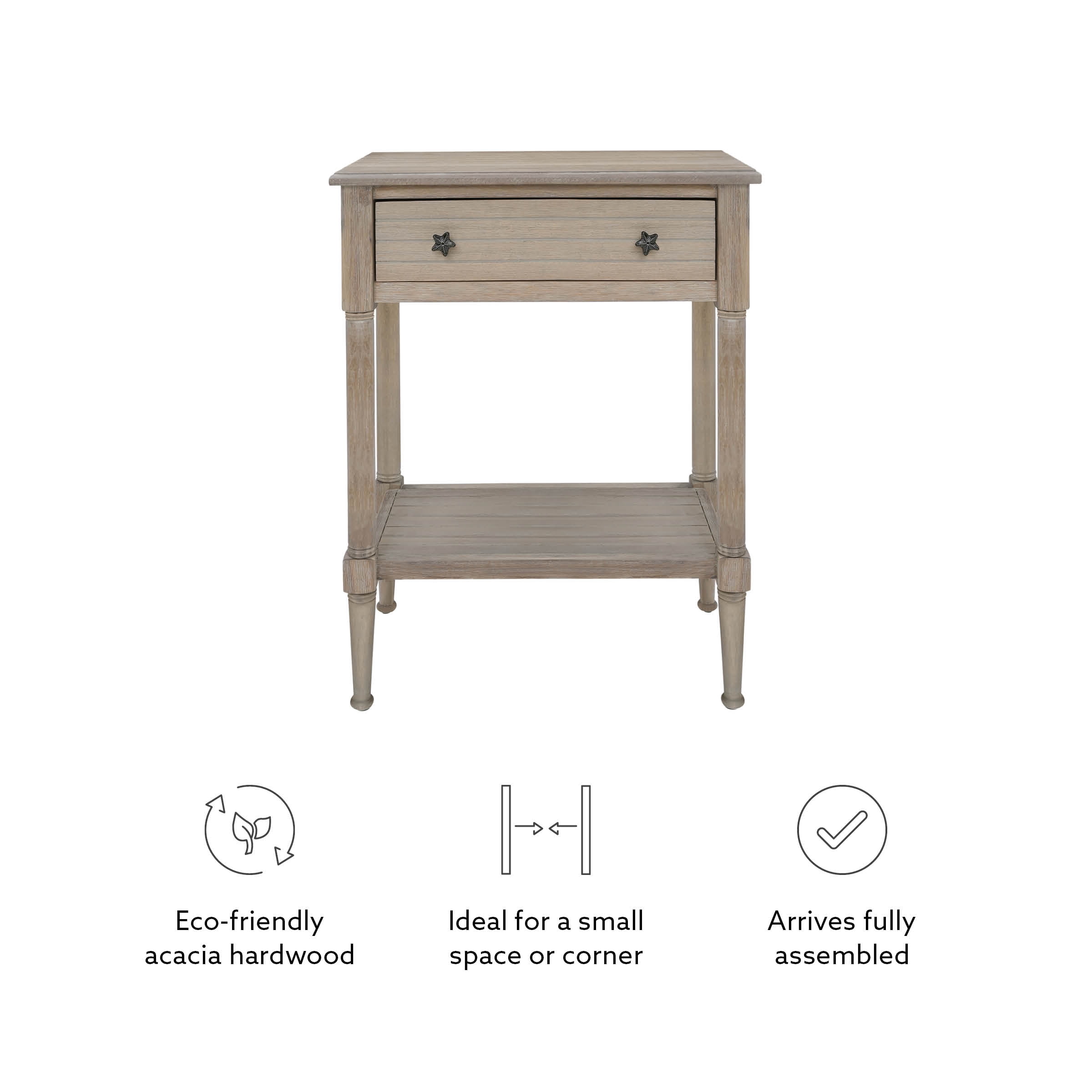 The coastal style is highlighted by a beadboard exterior rustic natural finish and charming rustic metal starfish drawer pulls A charming addition to your beach house or nautically themed home Pairs well with both contemporary and traditional decor Conveniently stow essentials like pens remotes and coasters out-of-sight in the roomy drawer Measuring 24 by 13 inches this table provides an ideal display space with plenty of extra storage on the shelf below The 30.25 inch height is perfect for a nightstand or living room side table Enjoy years of stylish durability provided by quality craftmanship and eco-friendly acacia hardwood with mdf construction Assembly is simple with the included easy-to-follow instructions Inner Drawer Dimensions: 18.25″ W x 9″ D x 3.25″ H Shelf Dimensions: 21.25″ W x 11″ D Assembled Dimensions: 24″ L x 13″ D x 30.25″ H Weight Capacity: 50 lbs. Ships in 1 box