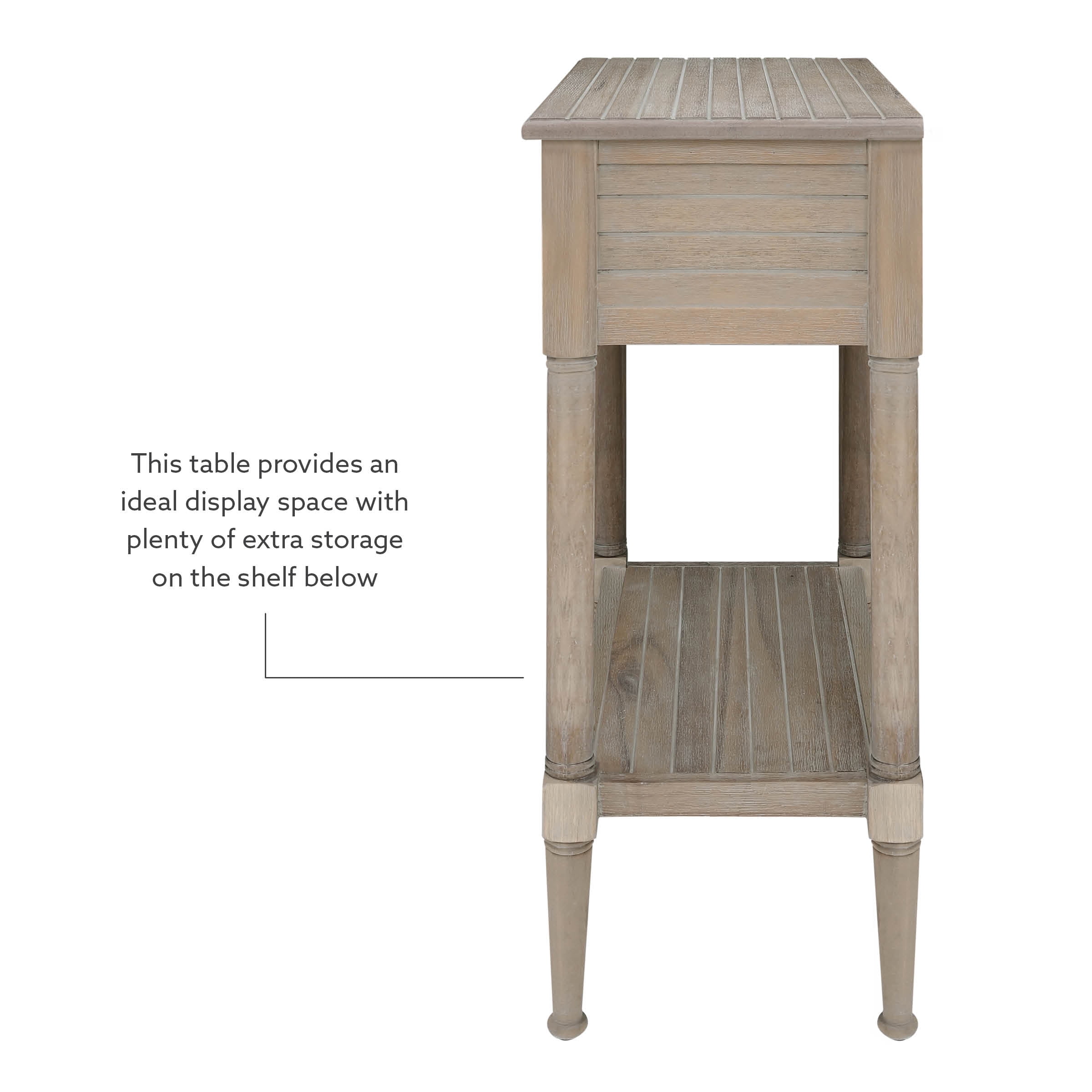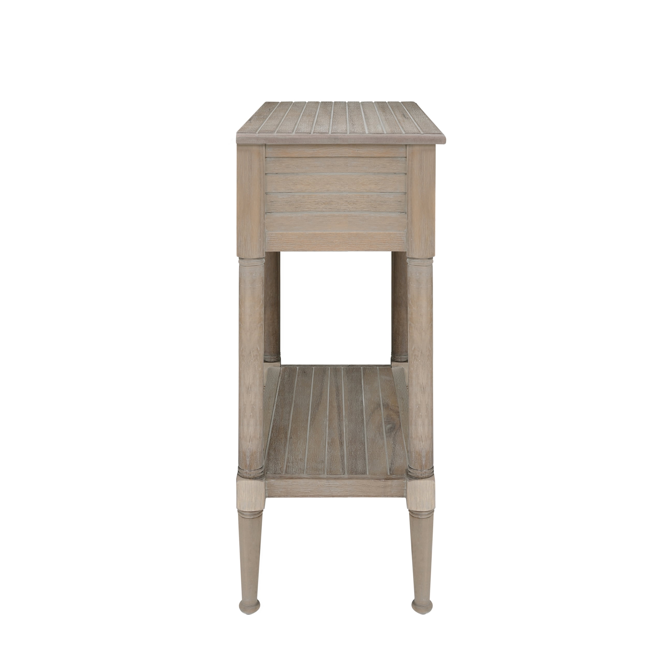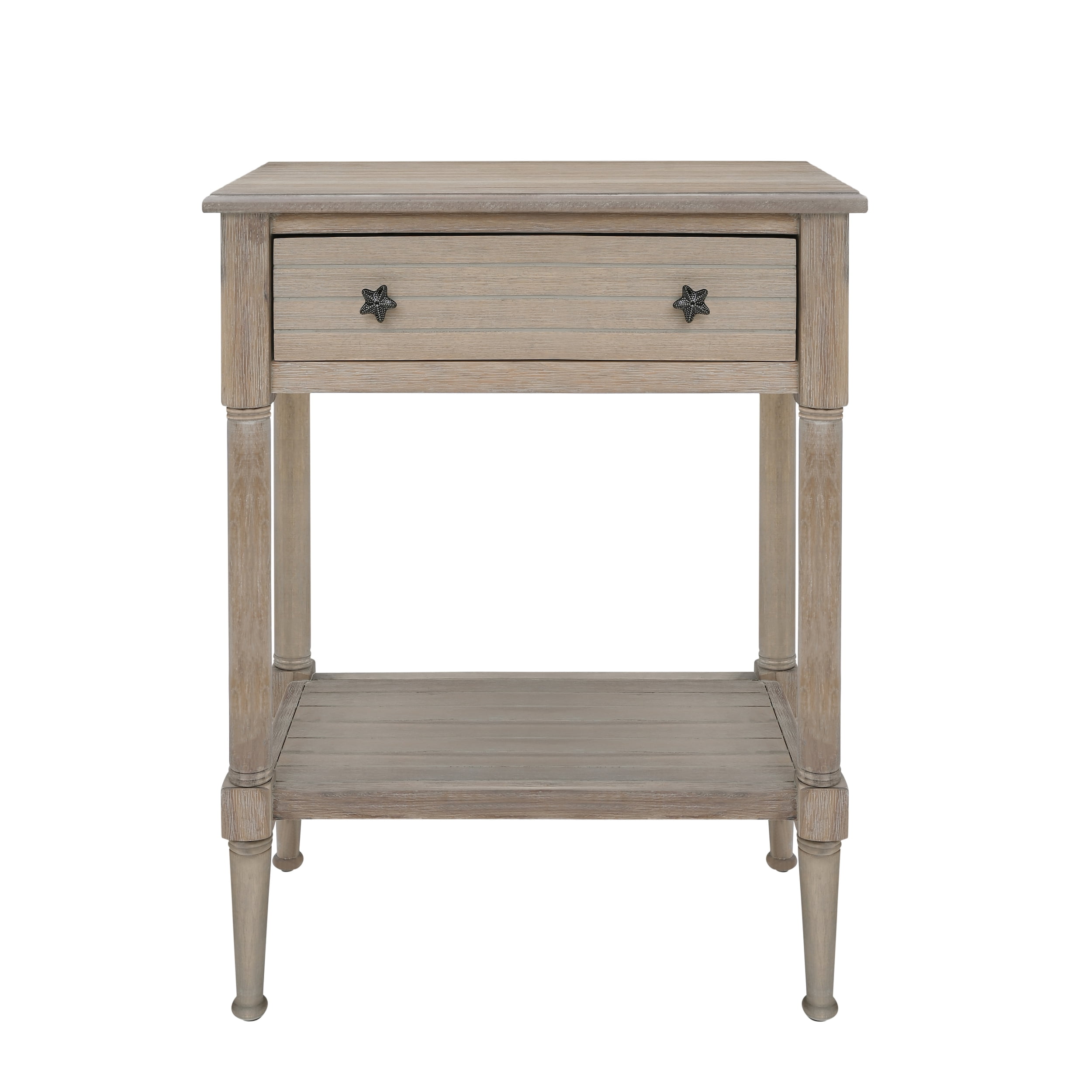 The coastal style is highlighted by a beadboard exterior rustic natural finish and charming rustic metal starfish drawer pulls A charming addition to your beach house or nautically themed home Pairs well with both contemporary and traditional decor Conveniently stow essentials like pens remotes and coasters out-of-sight in the roomy drawer Measuring 24 by 13 inches this table provides an ideal display space with plenty of extra storage on the shelf below The 30.25 inch height is perfect for a nightstand or living room side table Enjoy years of stylish durability provided by quality craftmanship and eco-friendly acacia hardwood with mdf construction Assembly is simple with the included easy-to-follow instructions Inner Drawer Dimensions: 18.25″ W x 9″ D x 3.25″ H Shelf Dimensions: 21.25″ W x 11″ D Assembled Dimensions: 24″ L x 13″ D x 30.25″ H Weight Capacity: 50 lbs. Ships in 1 box