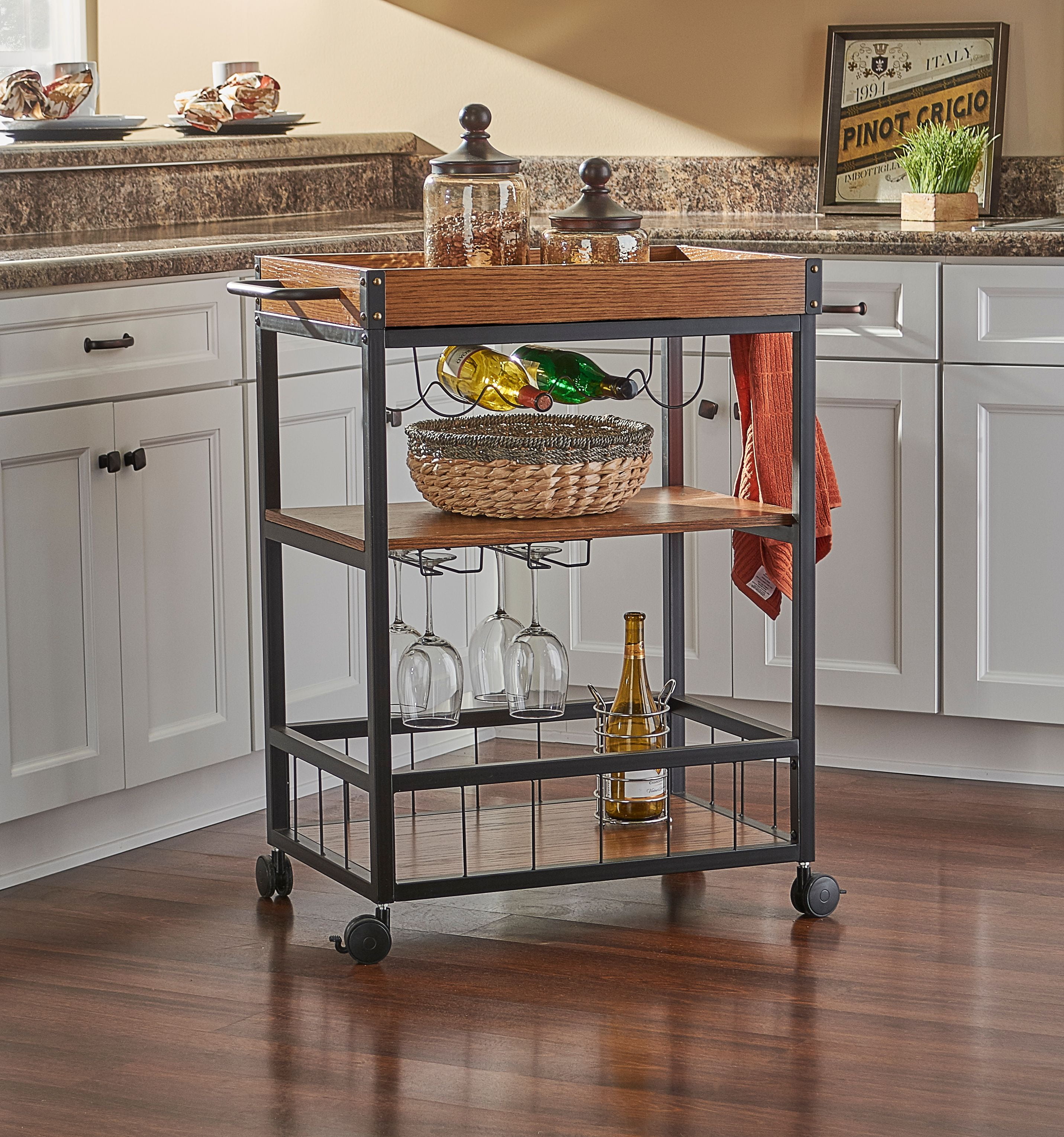 Color: Brown/Black Bullet Feature 3: Wine bottle and glass storage Bullet Feature 2: Three shelves for ample storage Bullet Feature 1: Rustic industrial style and design Bullet Feature 5: Black metal finish Bullet Feature 4: Easy roll casters for mobility Weight (lbs.): 42.90 lb Length (in.): 18.5 Width (in.): 30.75 Height (in.): 36.5