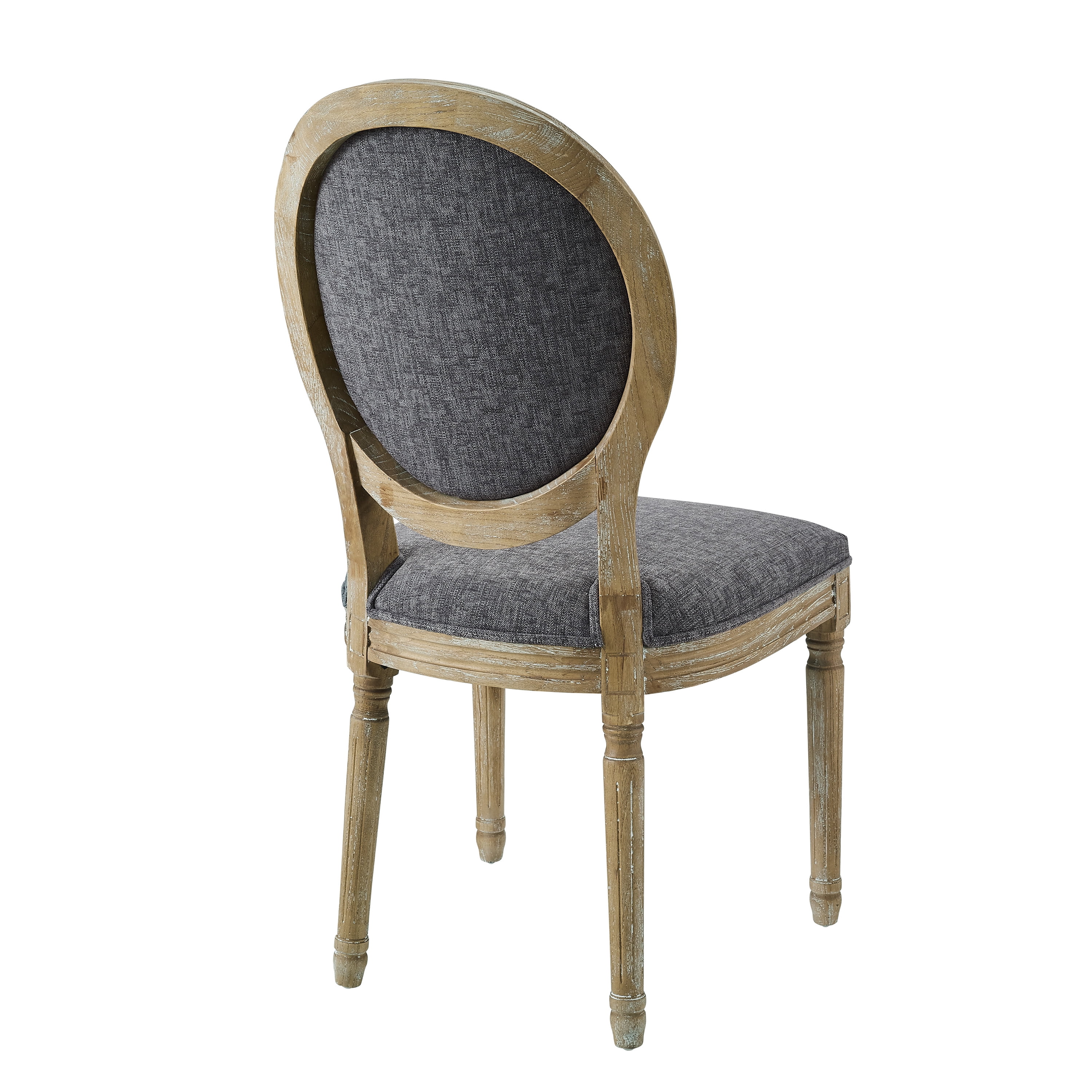 Crafted from Elm, Foam and Fabric Charcoal Gray Fabric Upholstery (55% Cotton, 45% Polyester) Set of Two French Inspired Design and Style Decorative Legs Oval Back Light Natural Brown Finish