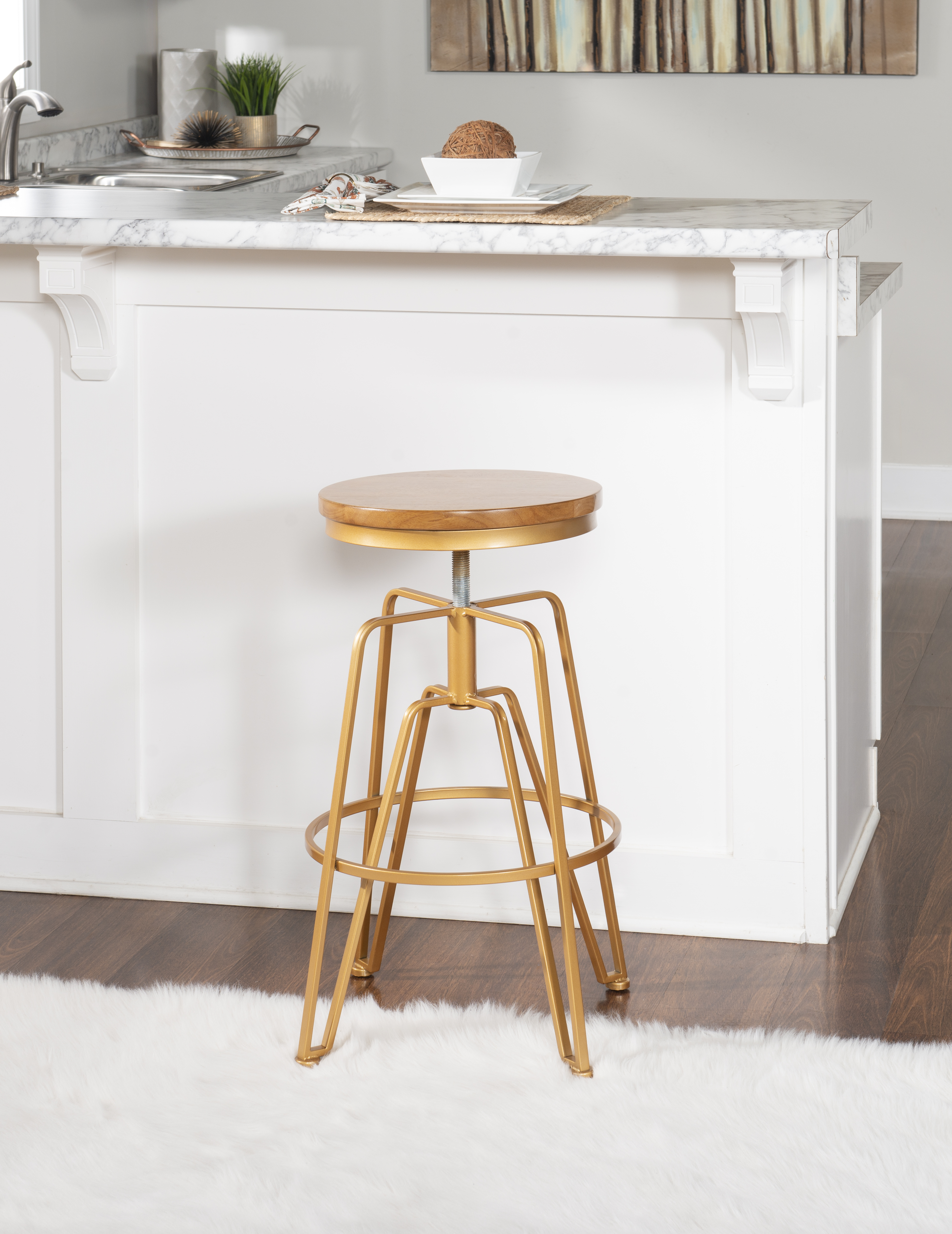 The Wood and Metal Adjustable Stool is perfect for adding transitional styled seating to a pub table or counter. The wood top and matte gold iron base easily complements a variety of décor schemes from modern to farmhouse. Spin the wood top and the stool easily adjusts from 25″ to 29″. The bottom foot railing aids in the sturdiness and durability of the piece.About Linon Home DecorLinon Home Decor is a family-owned-and-operated company based on the East Coast that has been in business for over 50 years. With an established reputation in the market for providing the best on-trend products at the right price, Linon offers excellent quality, style and functional furnishings for every room in the home. Linon’s domestic and international teams provide customers with the most reliable on-time delivery and customer service possible.