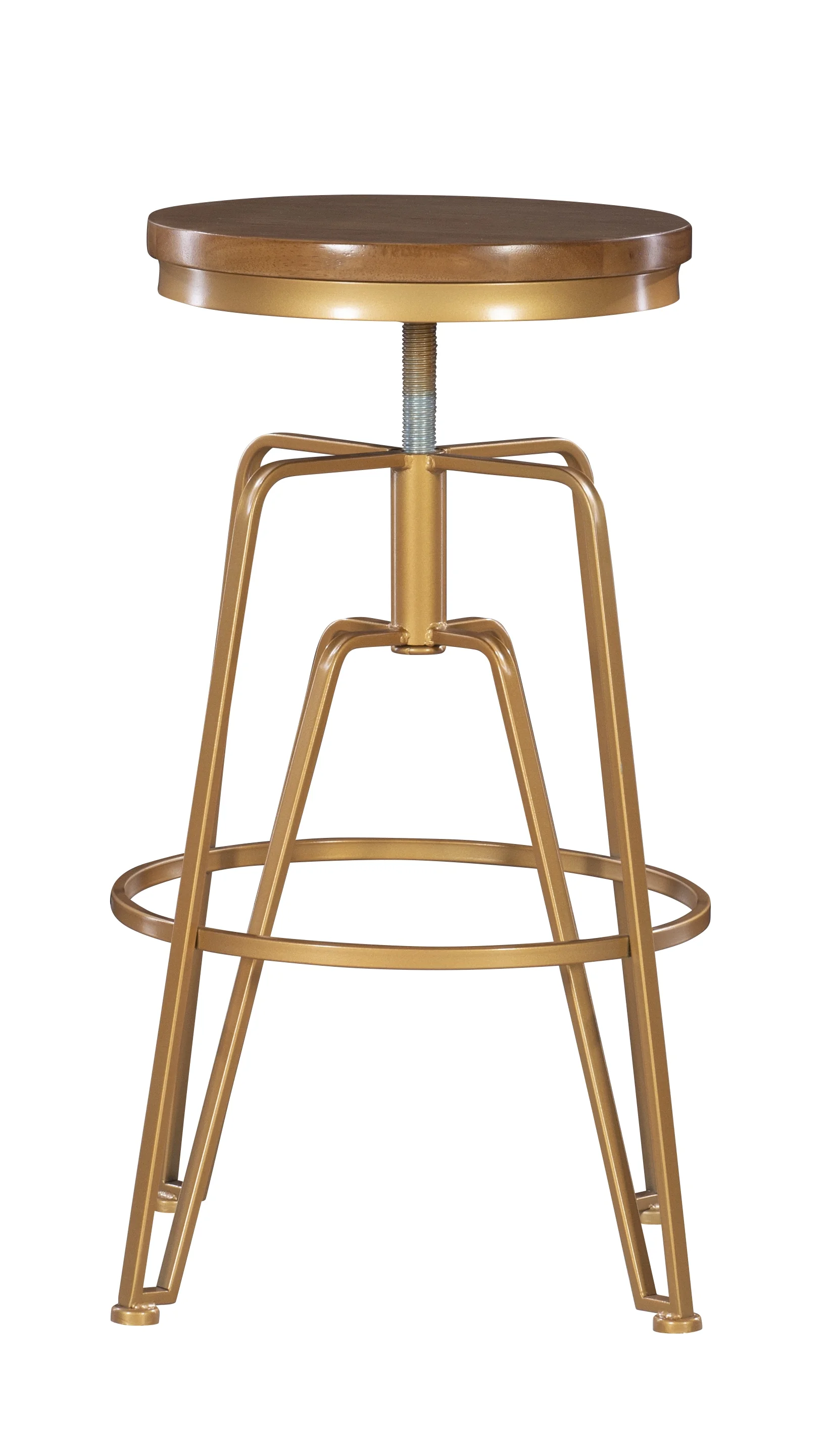 Contemporary/Modern Design and Style Top Spins to Adjust Seat Height Wood Top, Matte Gold Iron Base 14.625″ Seat Diameter, 1″ Thick Adjustable Seat: 25″-29″ Foot Railing From Floor: 10.75″h Assembled Dimensions: 15.75″w x 15.75″d x 25″-29″h Weight Capacity: 275 lbs Fully Assembled Ships in 1 box