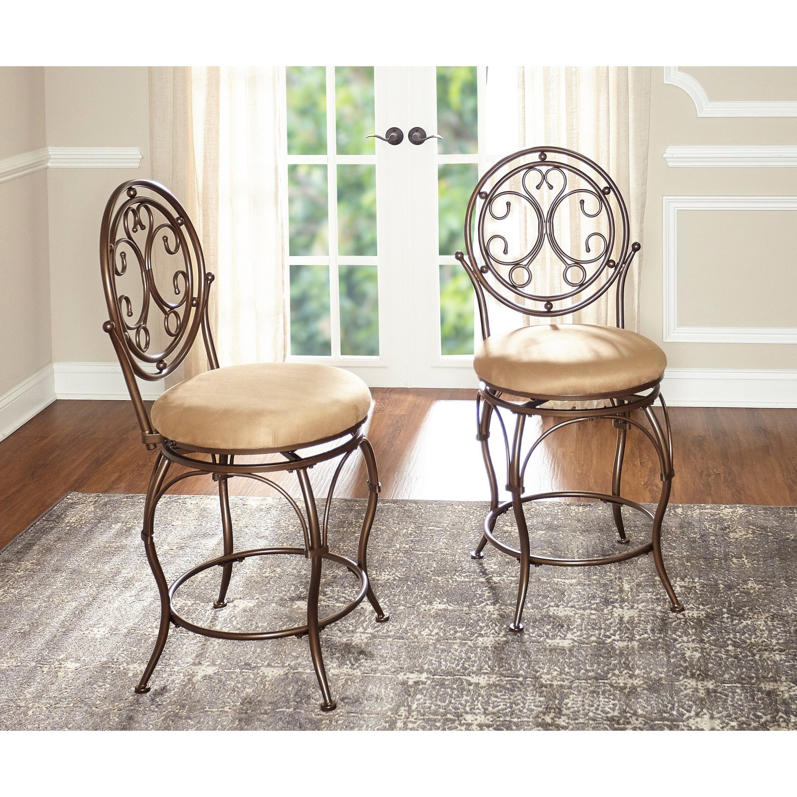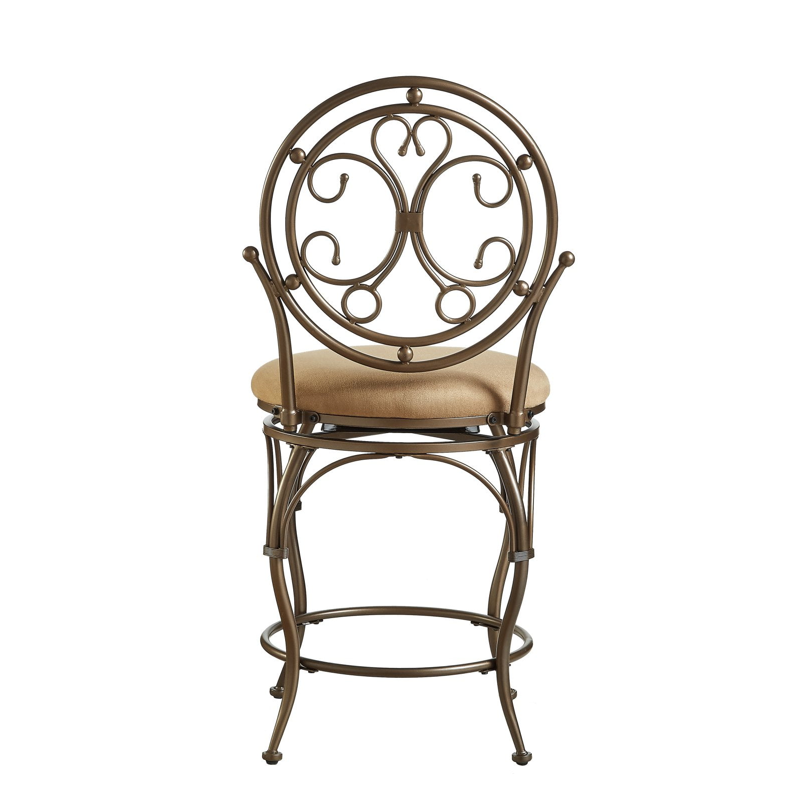 Refined design and elegant detail make this counter stool a beautiful home addition even before you consider the comfort this oversized 400 lb. Capacity furniture piece provides. The warm bronze finish, charming scroll back styling and plush tan microsuede upholstered seat make this metal stool even more inviting. With a 24″ high seat, pair it with a counter or counter height table in the 34″ to 36″ tall range or place it in a room as a lovely accent that’s handy for entertaining. For Indoor use only. Condition: New