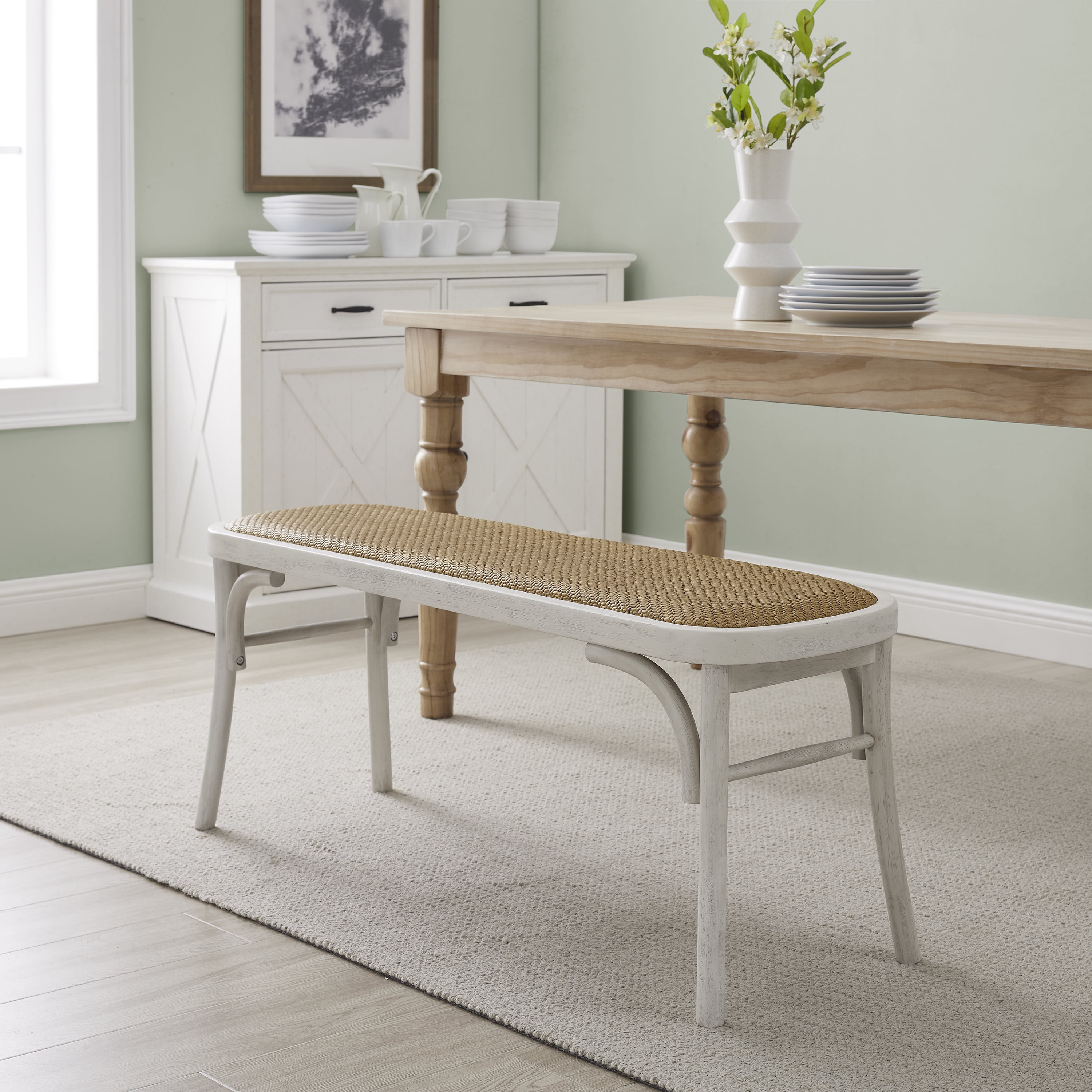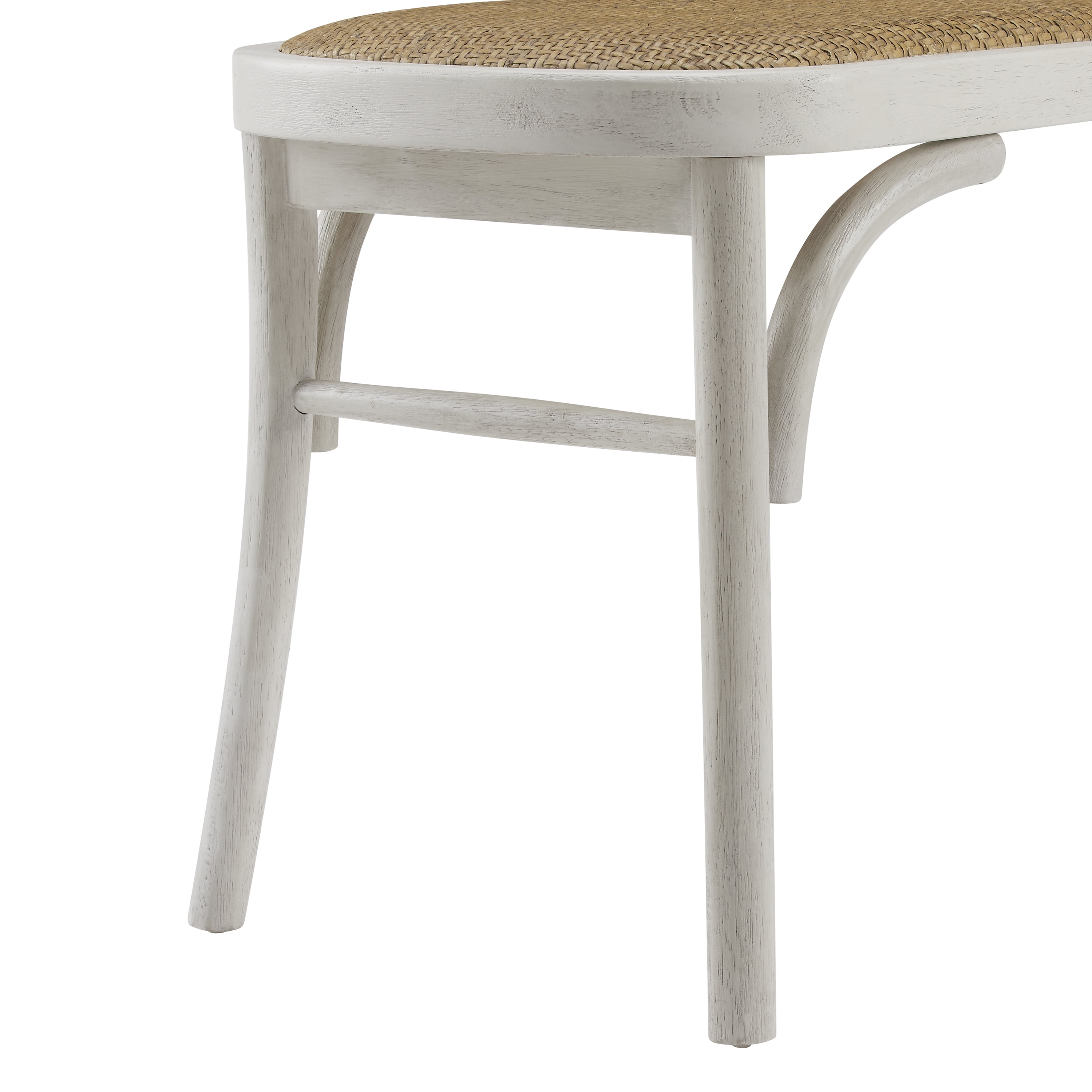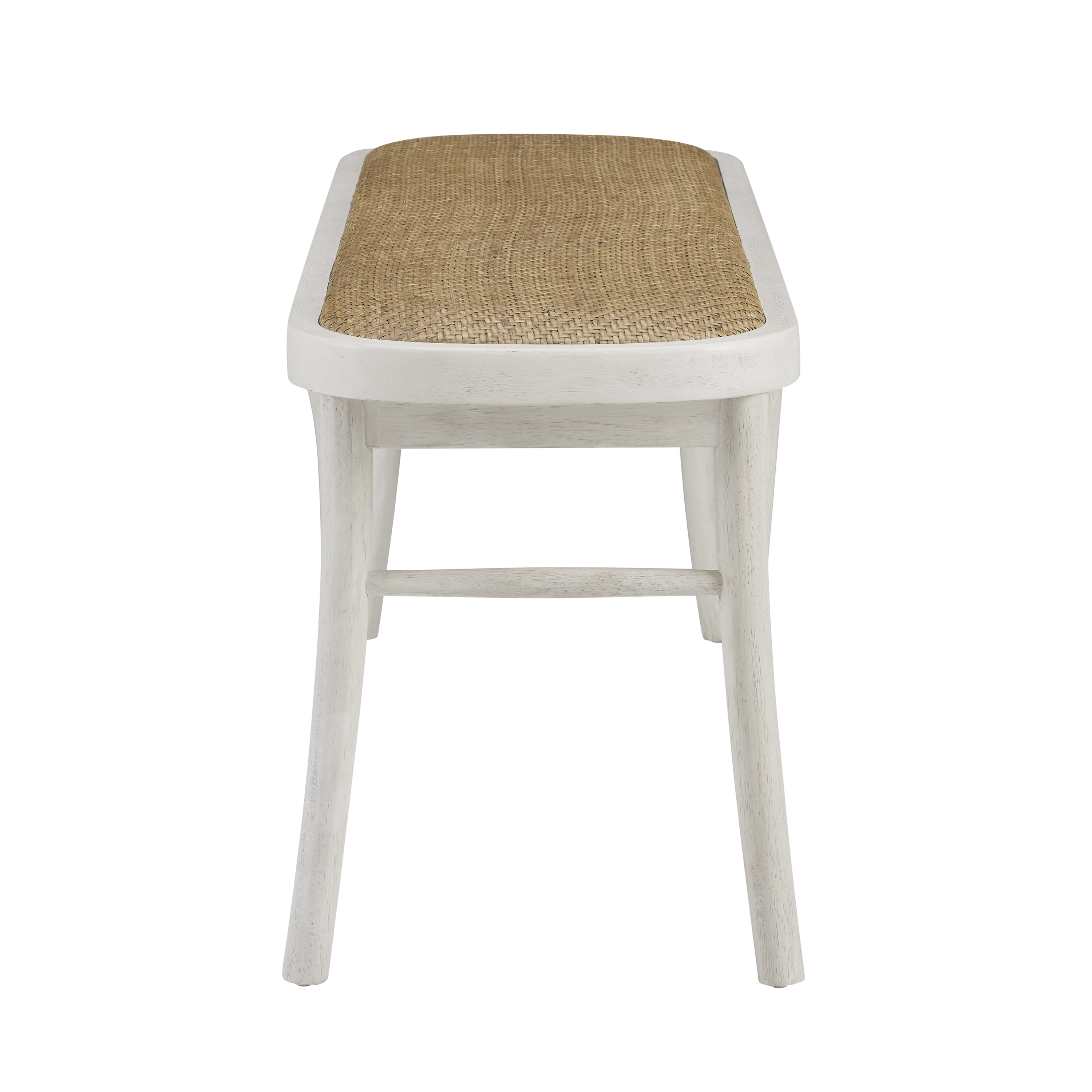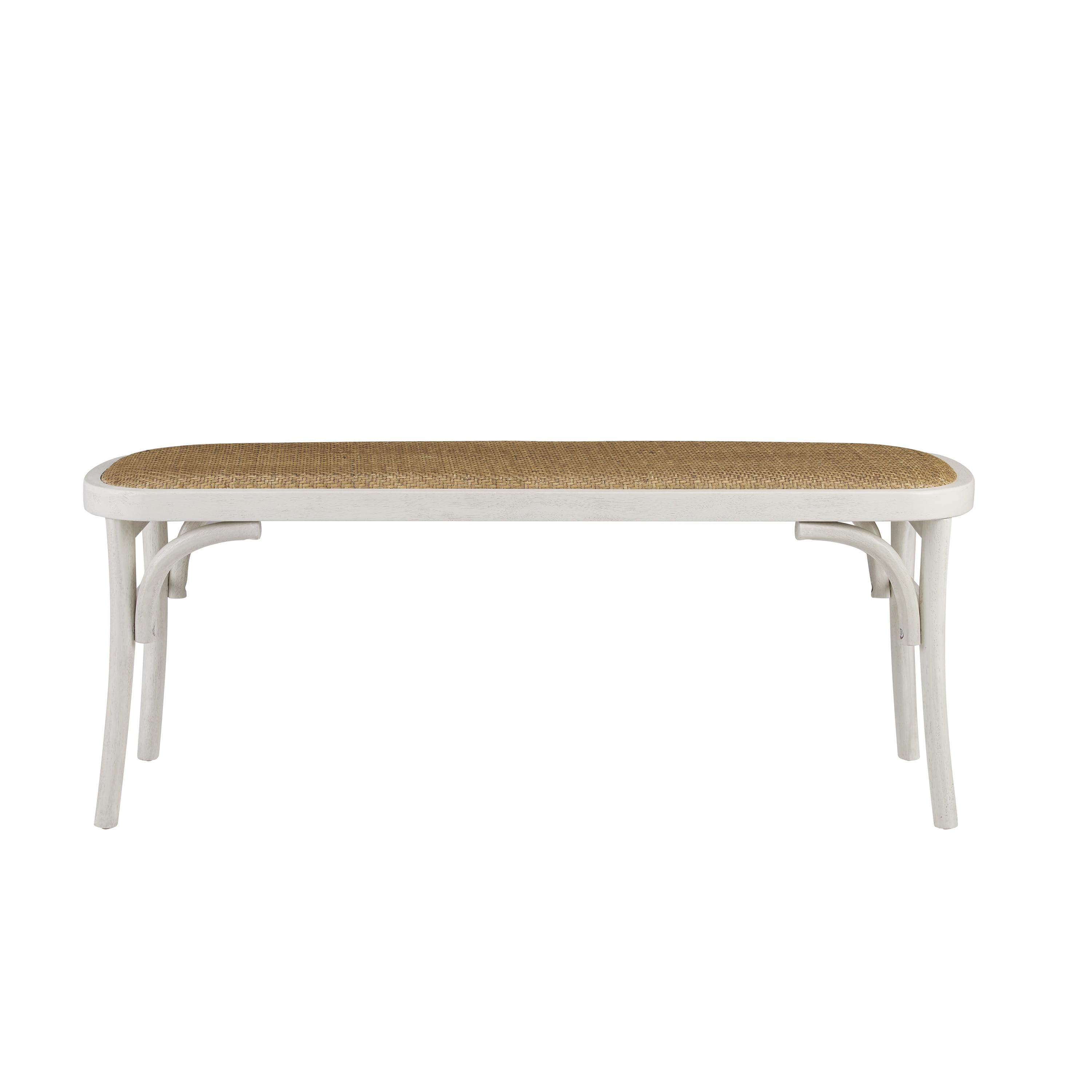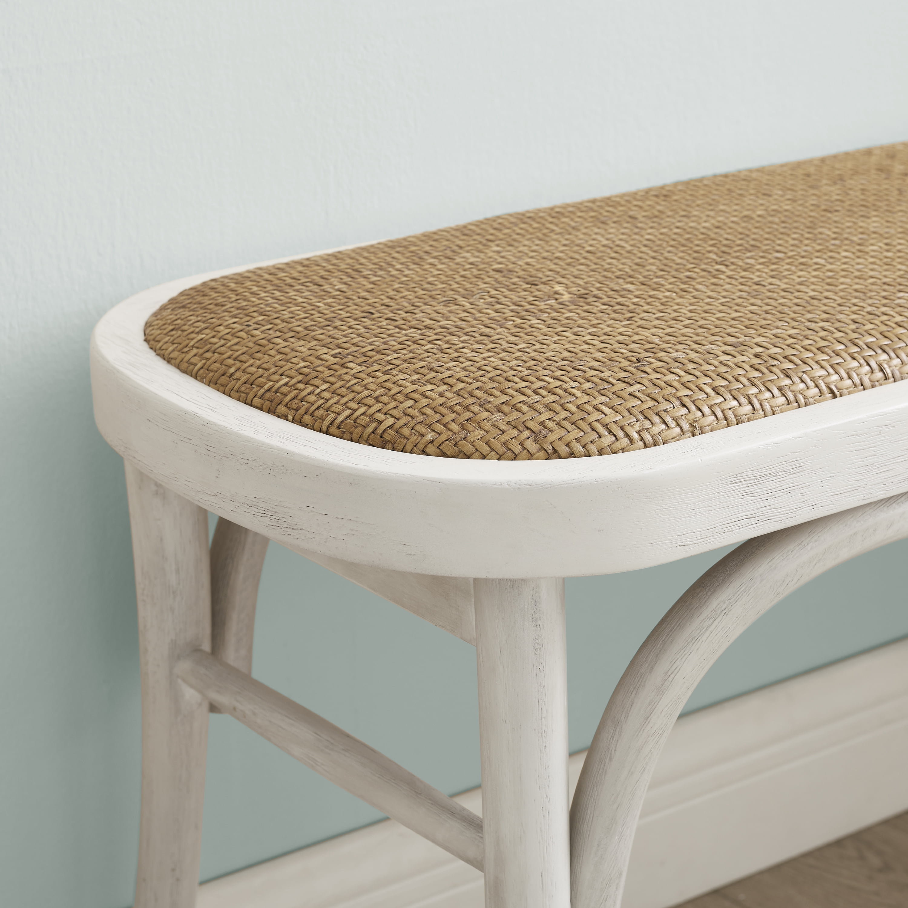 Perfect for an entryway foot of bed or as a dining bench Woven natural rattan seat over subtle cushion provides comfort Made of solid wood for a lightweight yet sturdy design Painted white finish provides a subtle vintage look and contrasts beautifully with the rattan seat Antique style evokes the aesthetic of a french café Supports up to 275 lbs Arrives with some assembly required Assembled Dimensions: 48″ L x 14.38″ D x 19″ H Ships in 1 box