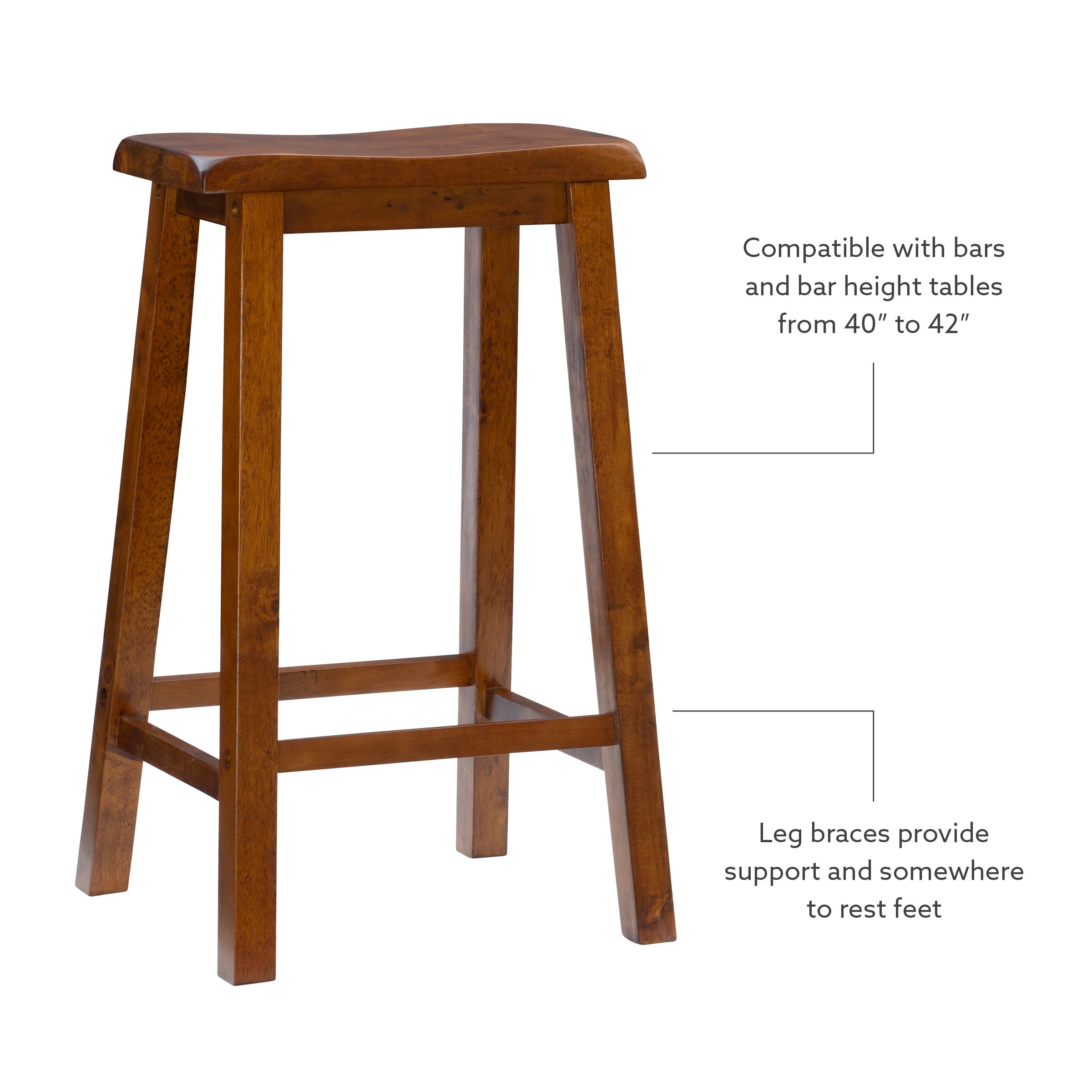 Crafted from Rubberwood Distressed “Honey Brown” Finish Compatible with bars and bar height tables and counters ranging 40″ to 42″ high Honey brown stained finish suits casual and classic decors Leg braces provide support and somewhere to rest feet Transitional style with modern and country influences suits most any room Sturdy solid wood angled legs and 29″ seat height