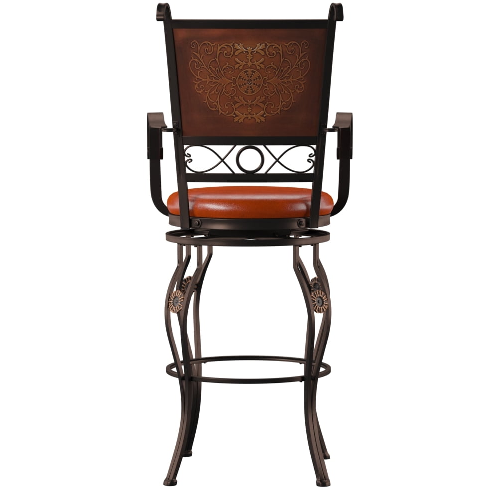 Crafted from Steel, Particleboard, Plywood, Foam and Faux Leather Rich Bronze Powder Coated Finish Compatible with bars and bar height tables and counters ranging 40″ to 42″ high 360 degree swivel spins for easy seat access and following surrounding conversations Warm rust faux leather seat is cushioned, comfortable and easy to clean Round metal brace acts as a footrest and adds strengthens to the stool Bar Height Simple Assembly Required