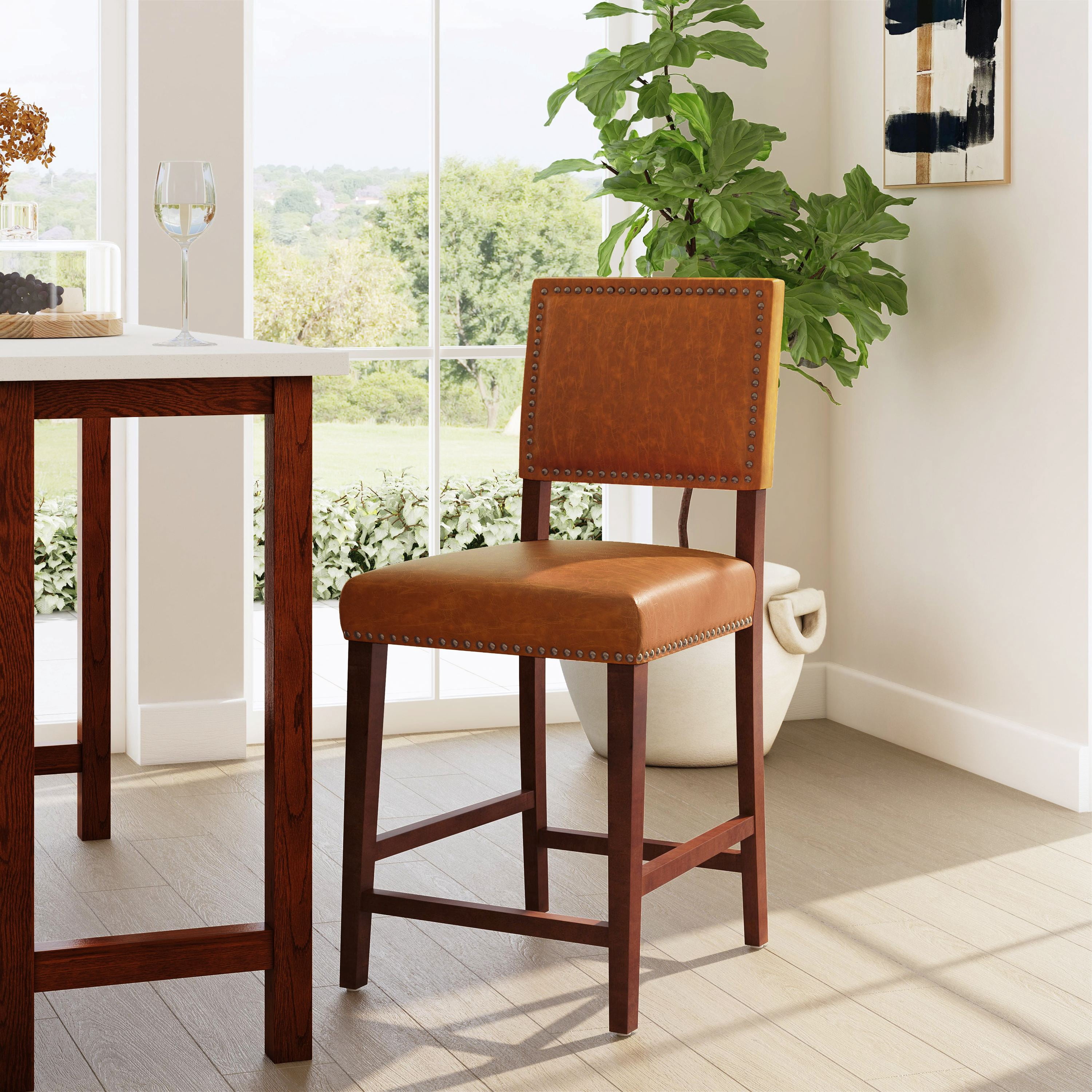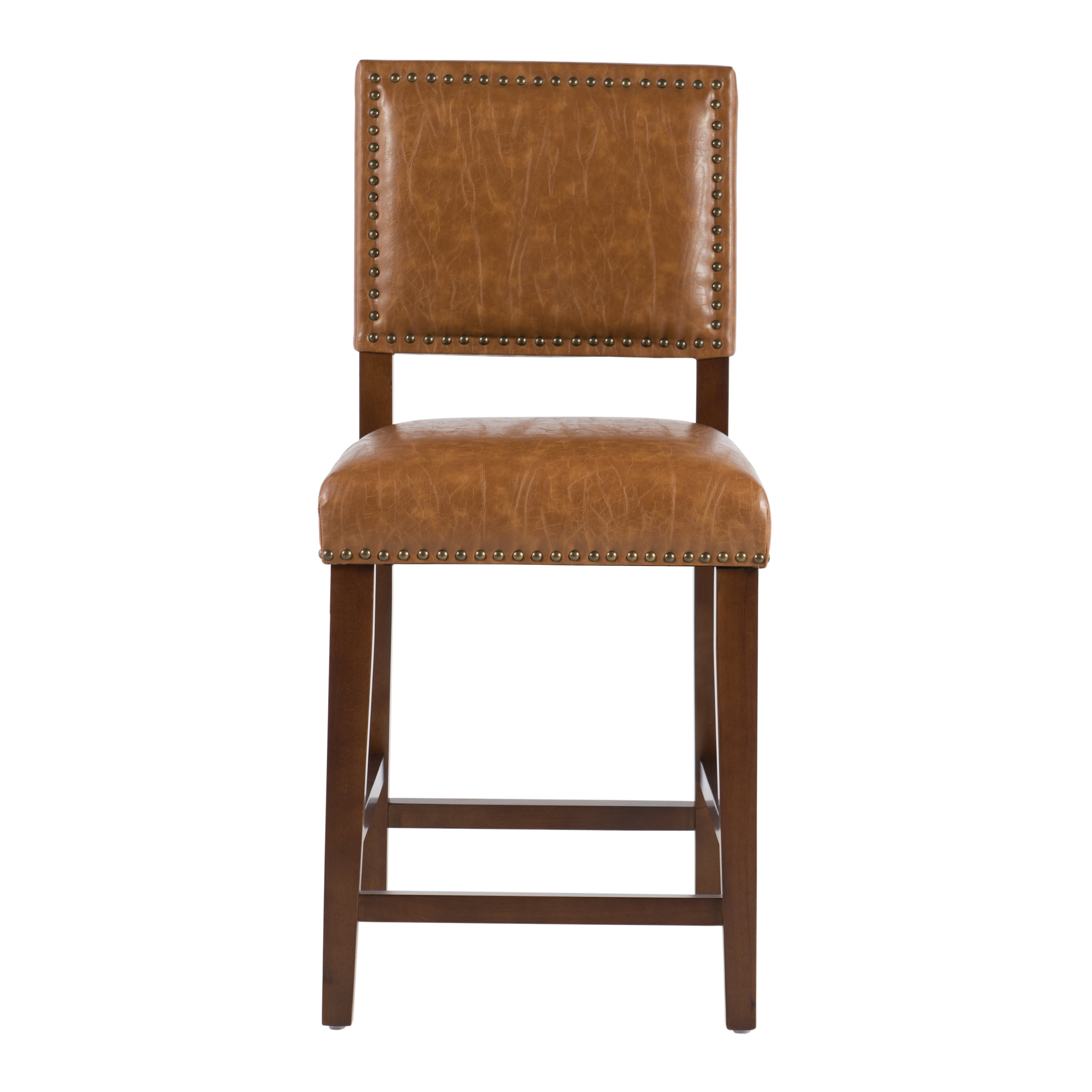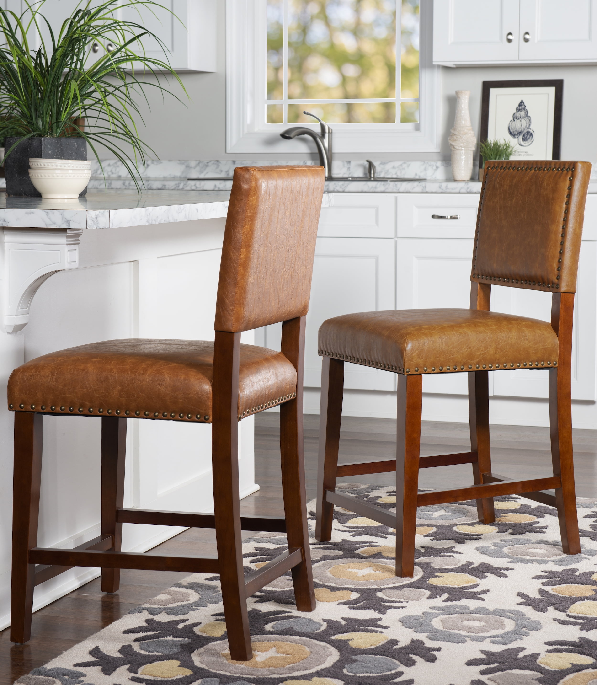 Crafted from Rubberwood, Foam and Faux Leather Easy to clean dark caramel faux leather upholstery, simply wipe clean with a damp cloth Sturdy solid wood frame Durable walnut stained solid wood legs Comfortable thick foam padded seat and backrest Accented with antique bronze nail head trim Ideal for seating at a kitchen counter or kitchen island Suitable with counter heights of 35″ to 39″ Counter Height Backrest and footrests provide proper support making the stool comfortable for long periods of time Buy two or more to make a beautiful design statement in your home You will need one stool for every 30″ of horizontal counter space Easy to assembly, instructions included