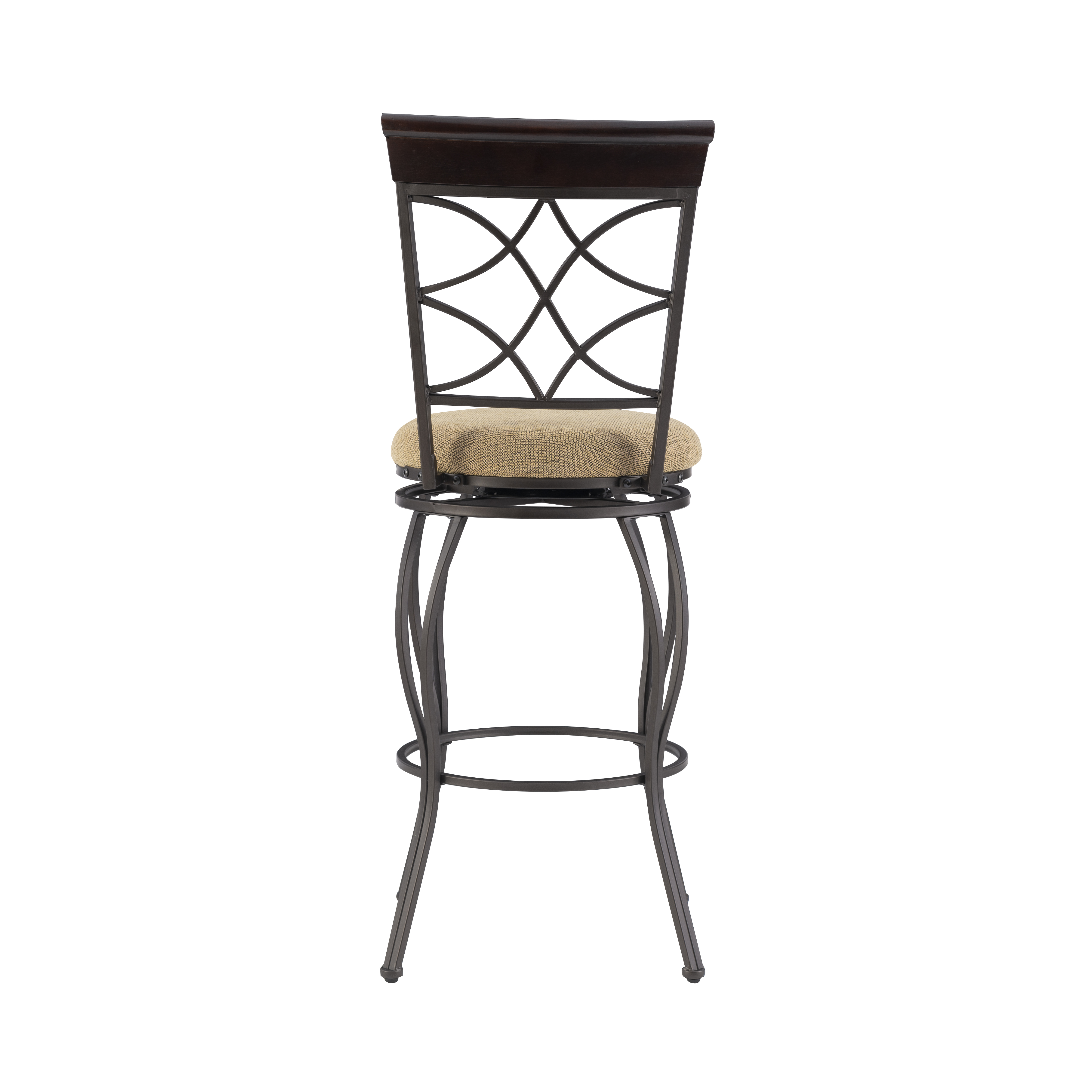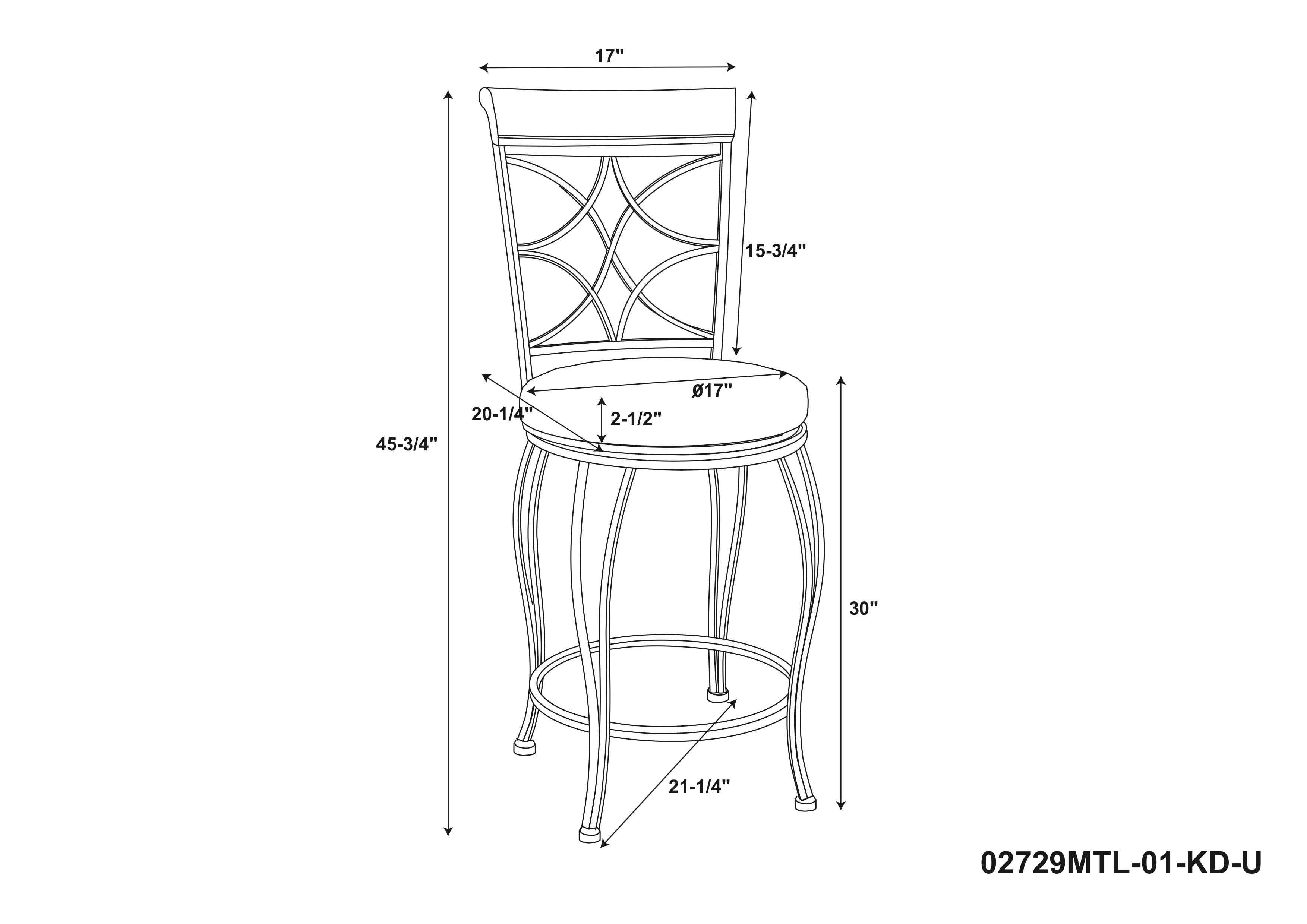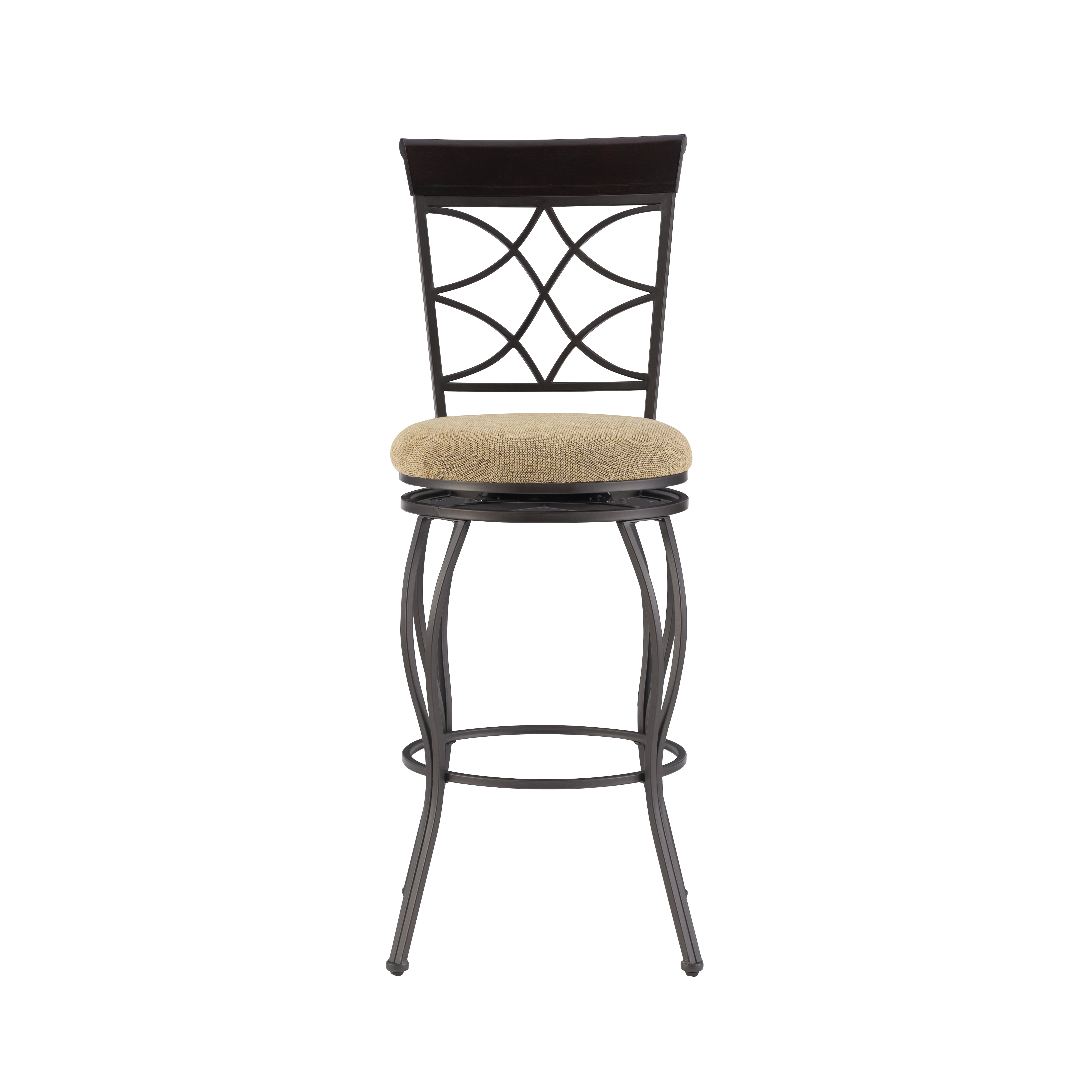 Metallic Brown & Brown Wood Finish Polyester seat cover Crafted of metal and highlighted with subtle curves and a distinctive back The cushion is piled high for extra comfort Seat Dimensions: 30″ seat height,16.5IN X 16.5IN X 2IN Swivel seat Assembled Dimensions: 17″w x 19.75″d x 45.75″h Weight Capacity: 275 lbs Assembly Required Ships in 1 box For indoor use only