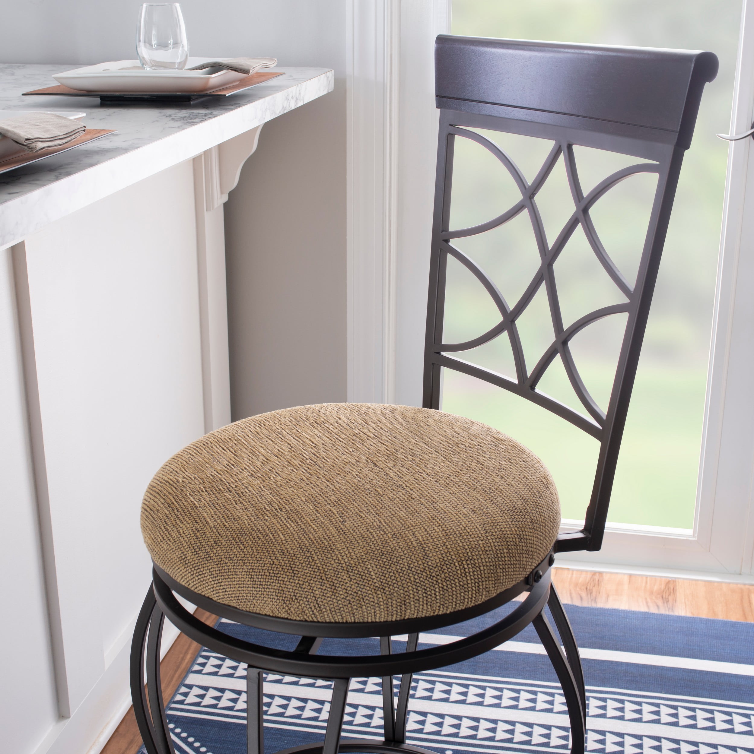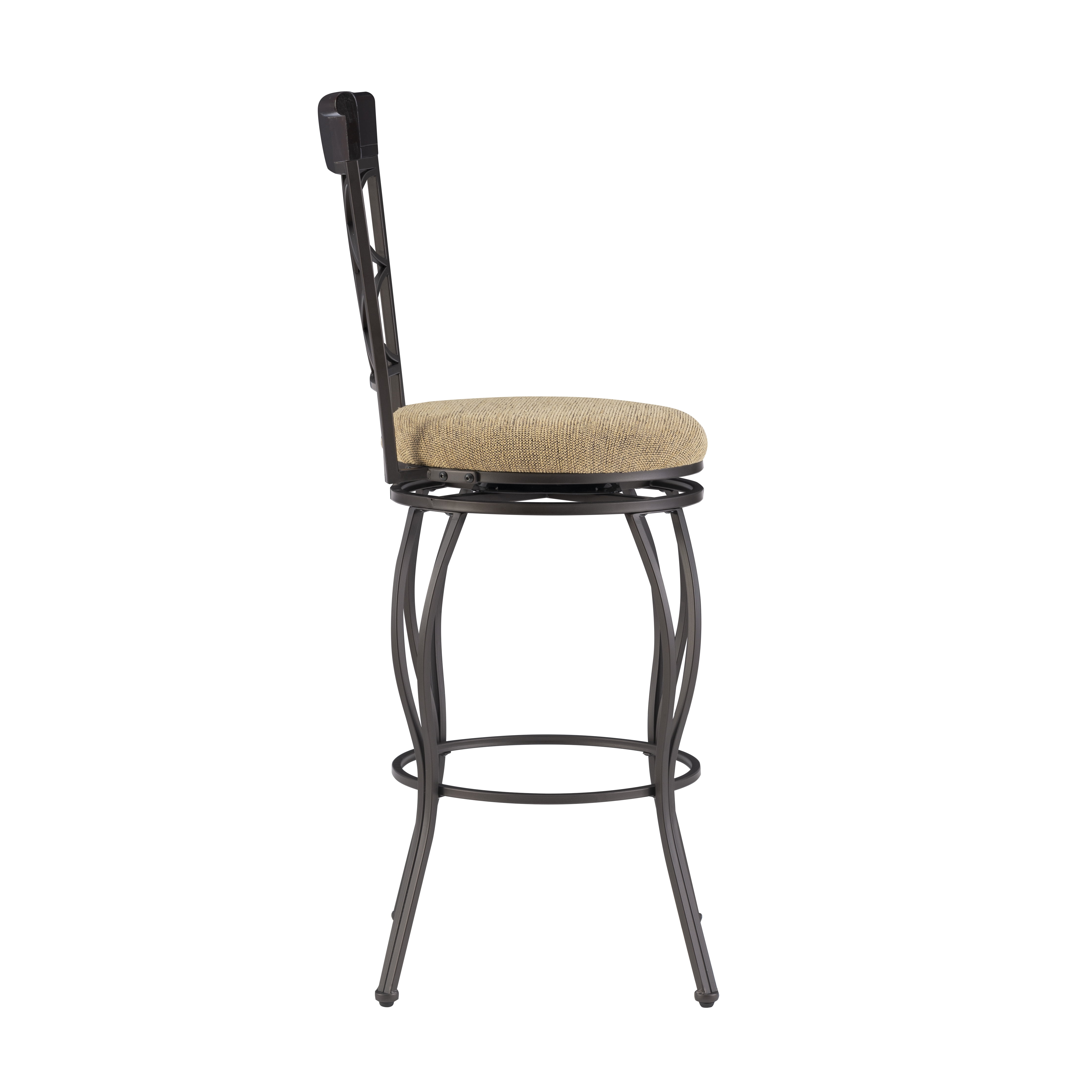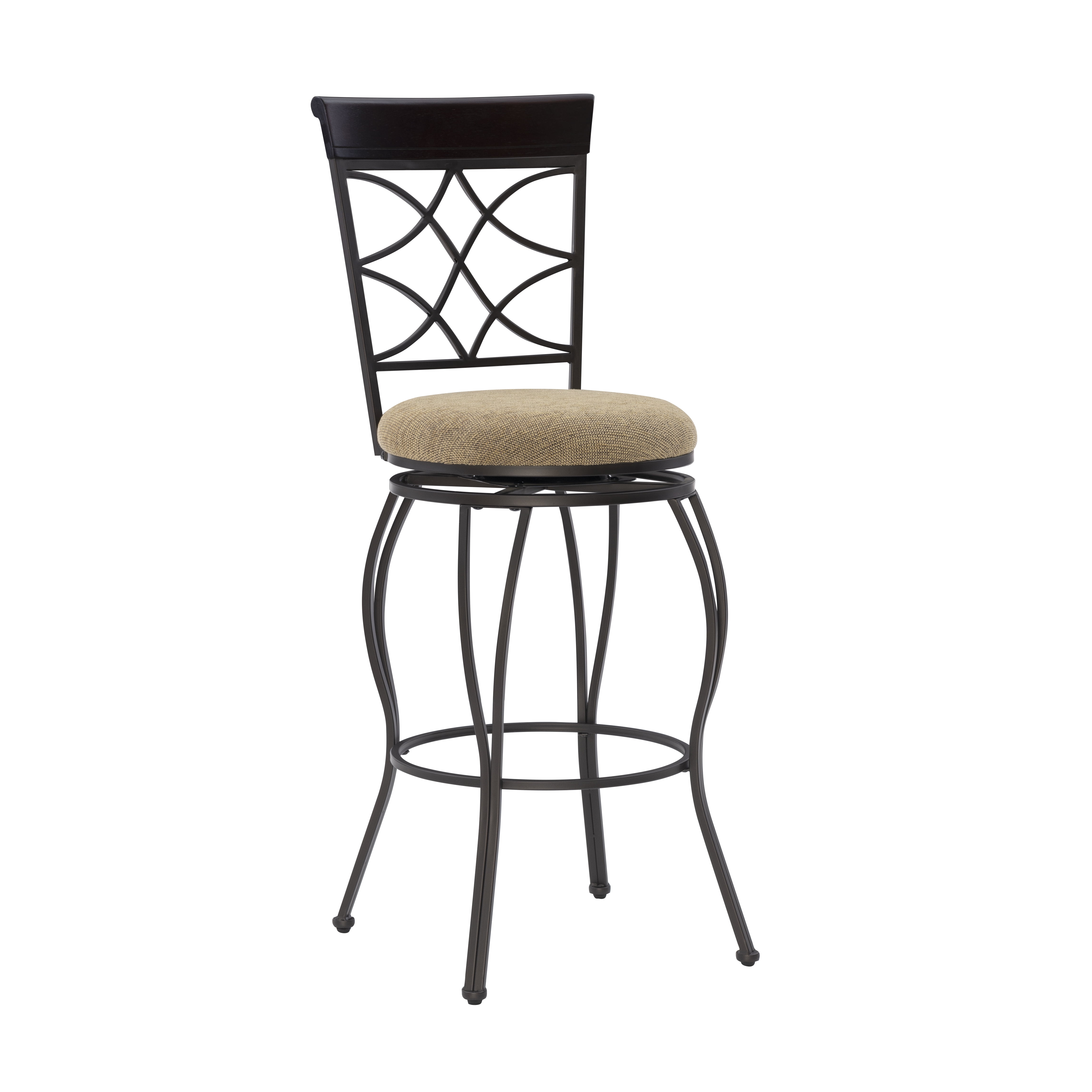 Metallic Brown & Brown Wood Finish Polyester seat cover Crafted of metal and highlighted with subtle curves and a distinctive back The cushion is piled high for extra comfort Seat Dimensions: 30″ seat height,16.5IN X 16.5IN X 2IN Swivel seat Assembled Dimensions: 17″w x 19.75″d x 45.75″h Weight Capacity: 275 lbs Assembly Required Ships in 1 box For indoor use only