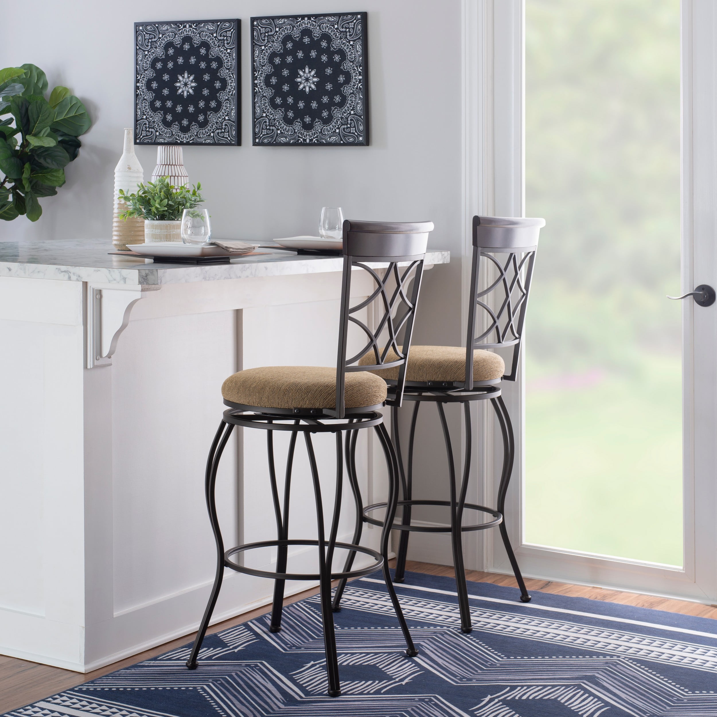 Linon Bryson 25″ Indoor Metal Bar Stools with Swivel, Brown/Light Brown Fabric