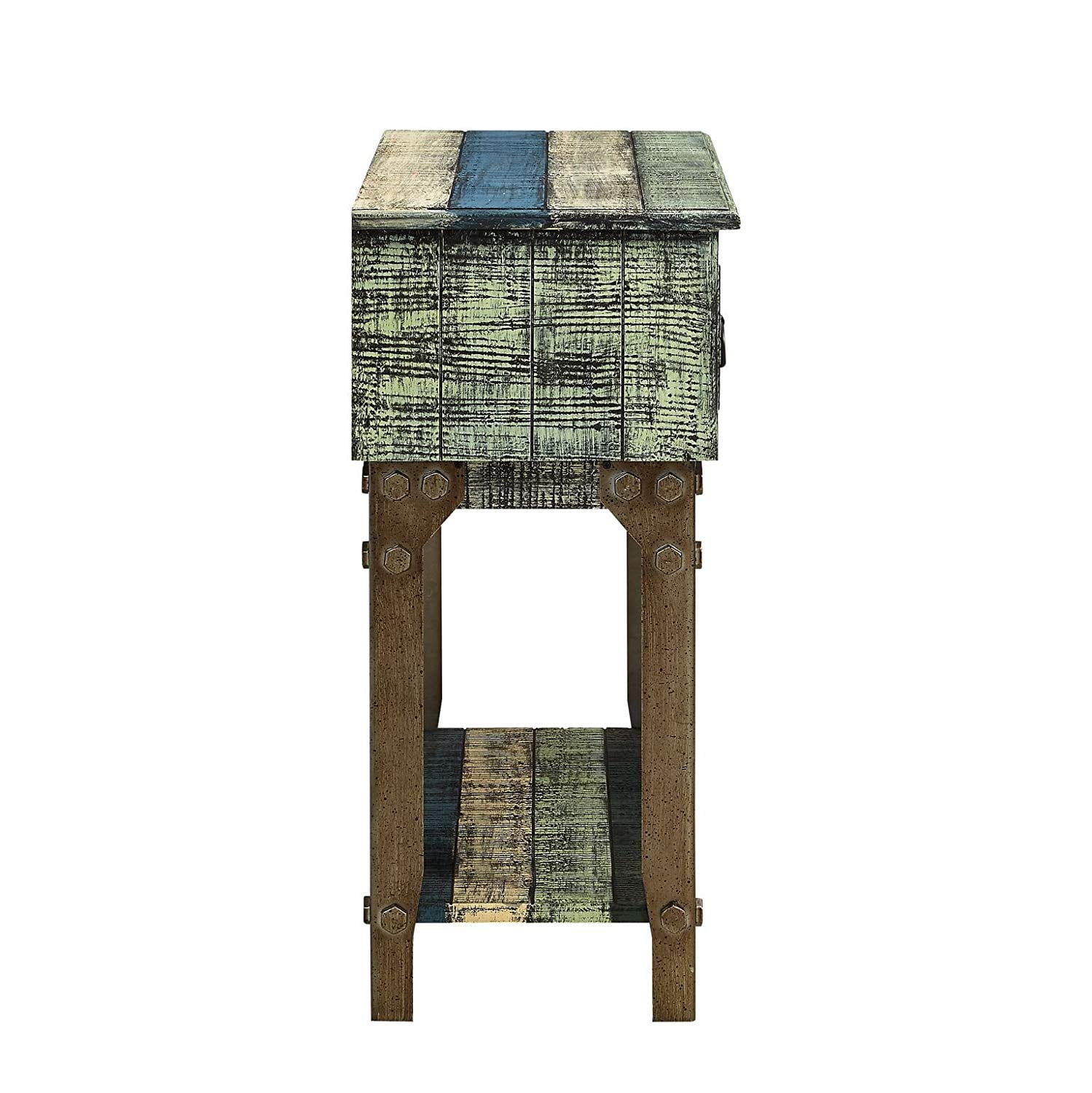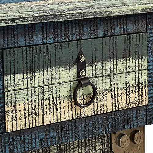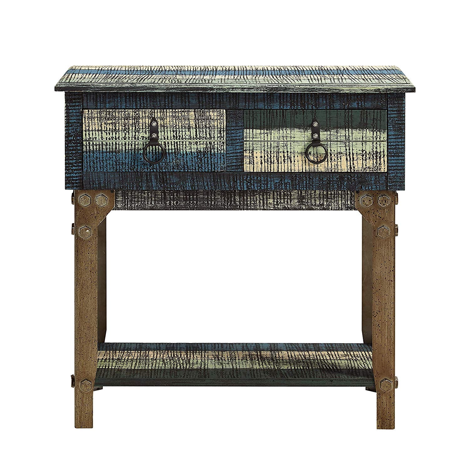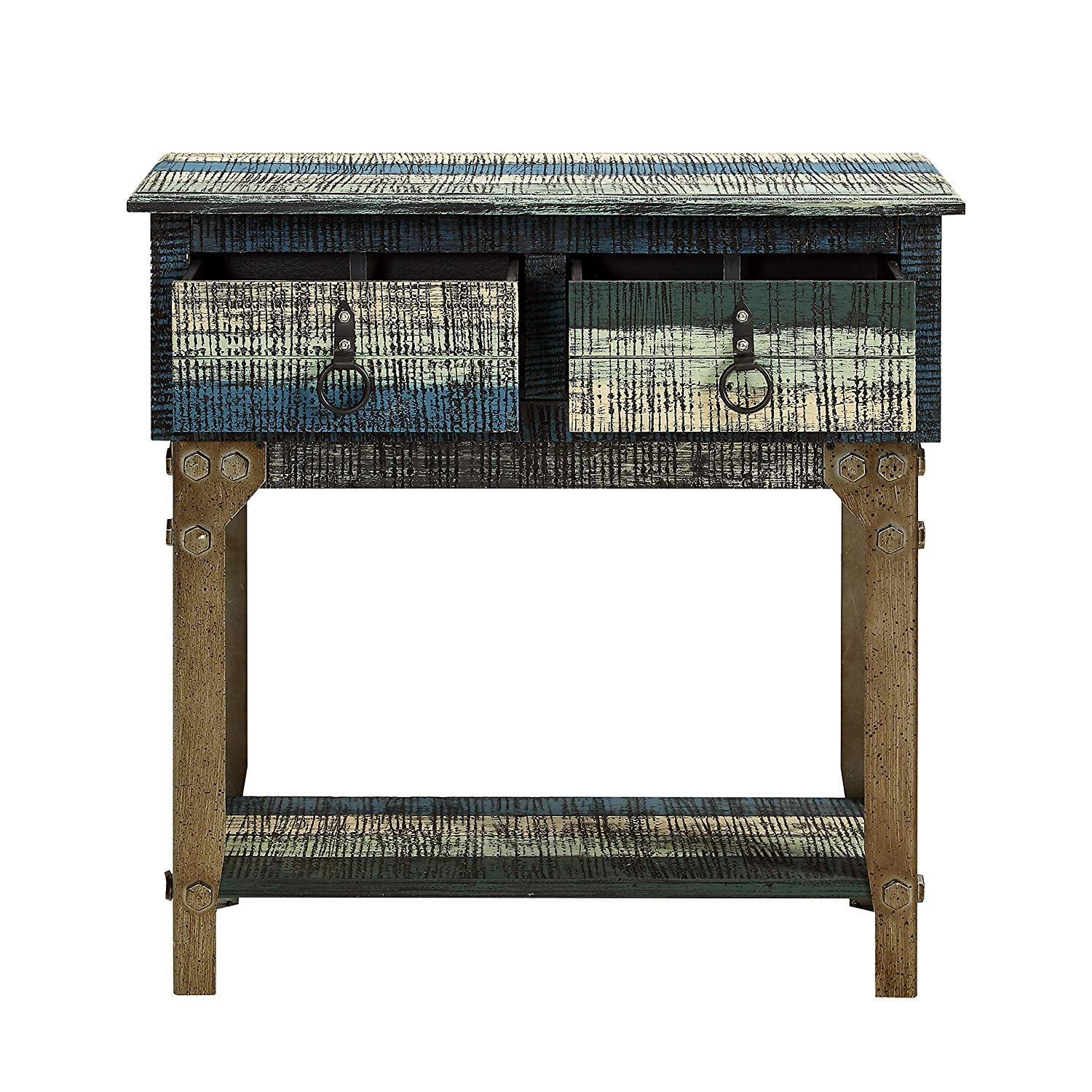 The Calypso Collection combines an antique, weathered look with a warm, rustic, industrial feel. Its distressed look is trendy, popular and full of unique character. The 2-Drawer Hall Console is a perfect addition to any area of your home. It features 2 deep upper drawers and a shelf below which provides ample storage space for a variety of items. Drawers feature black powder coated hardware. Fully assembled. Features: Crafted from Fir Wood, MDF and Iron Multi-Colored Hand Painted Finish Black powder coated hardware Antique, weathered look Trendy distressed look Features 2 deep upper drawers and a shelf Perfect addition to any area of your home. Specifications: Assembly Required: Leg Assembly Product Dimensions: 31.5″w x 14.625″d x 30.75″h Product Weight: 27.56 lbs Weight Capacity: 100 lbs Drawer Dimensions: 11.5″ x 11.12″ x 4.5″