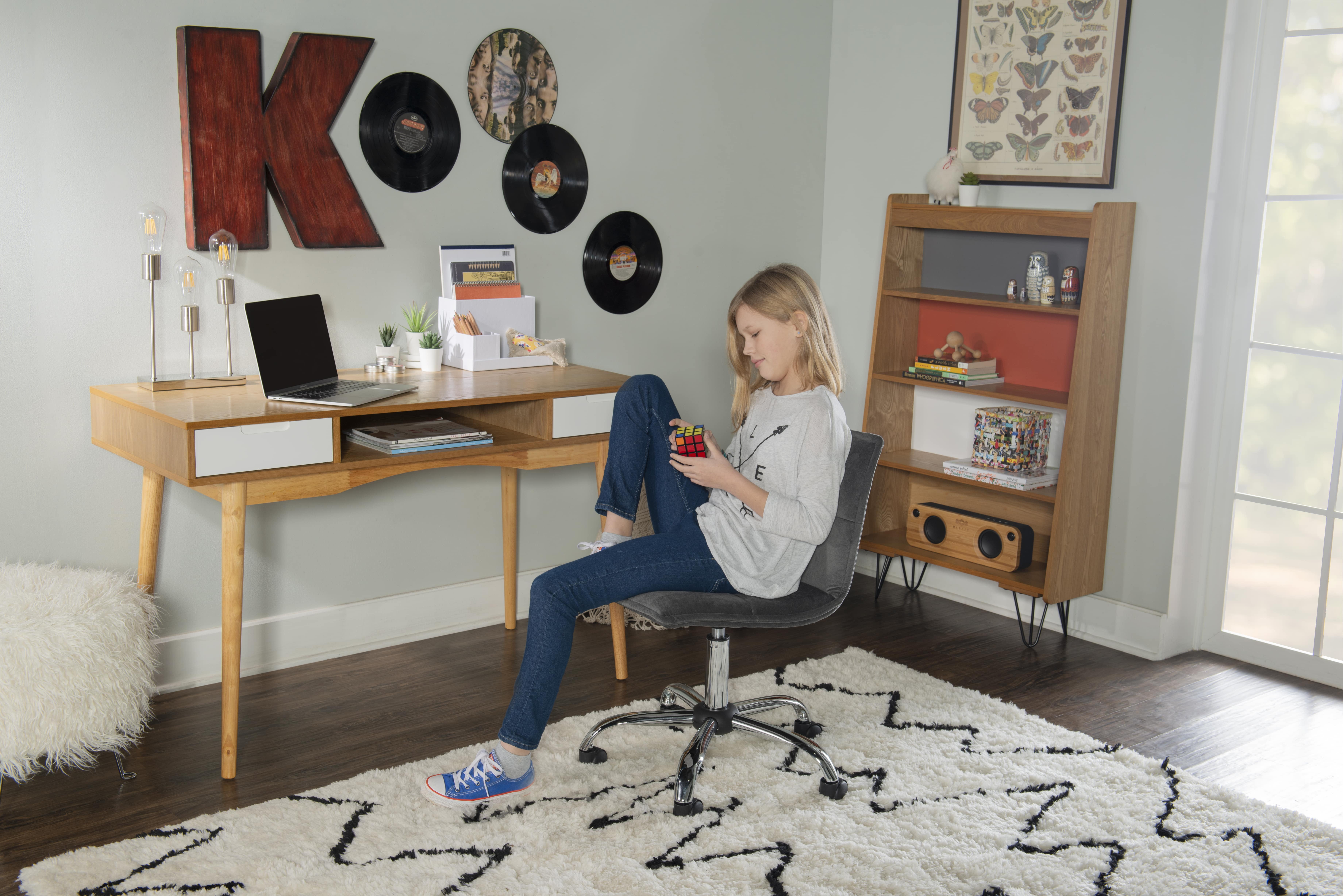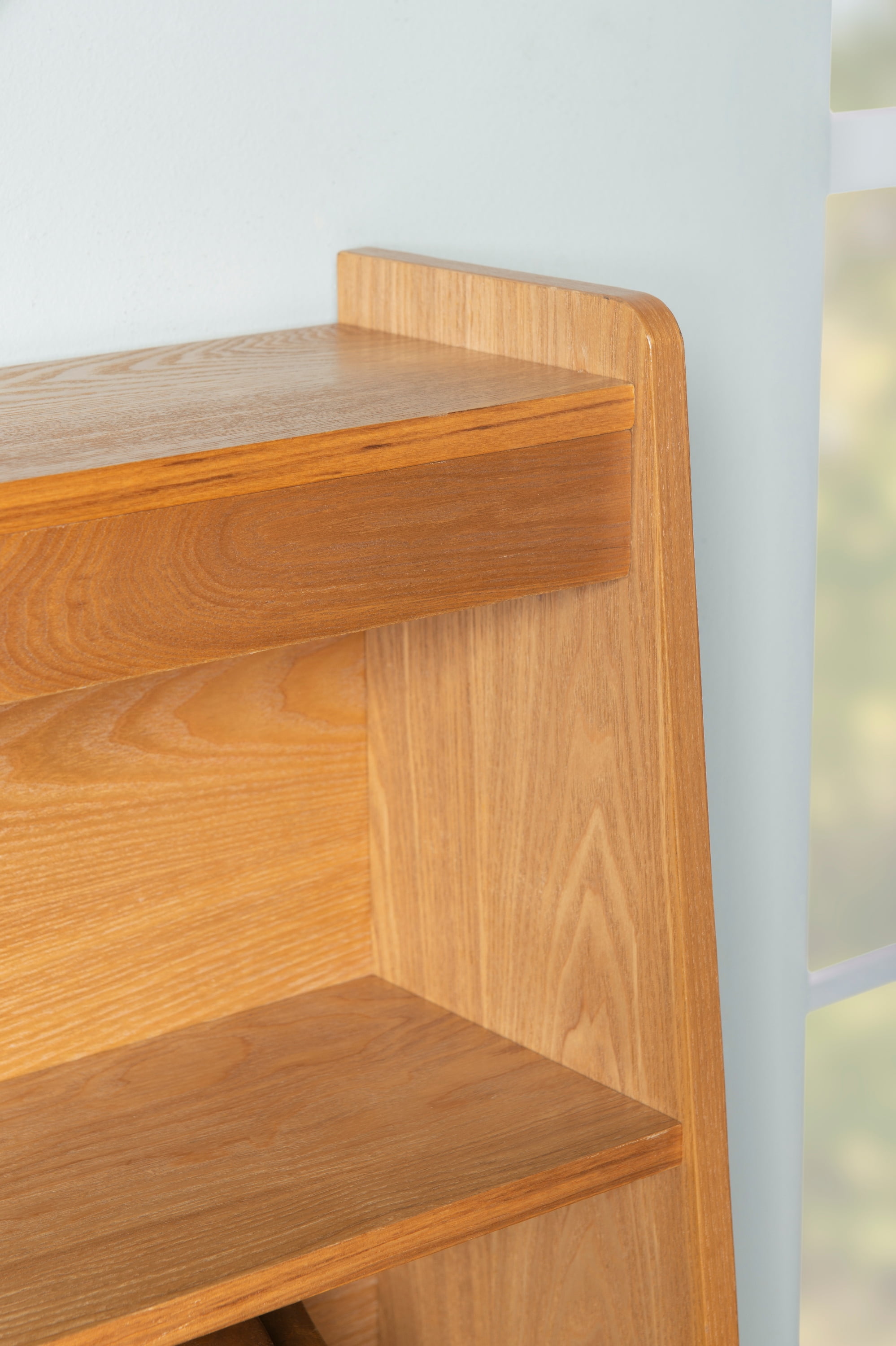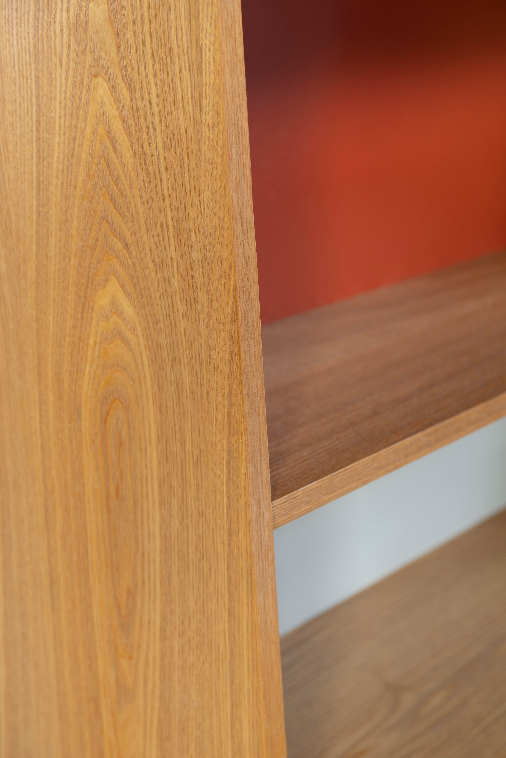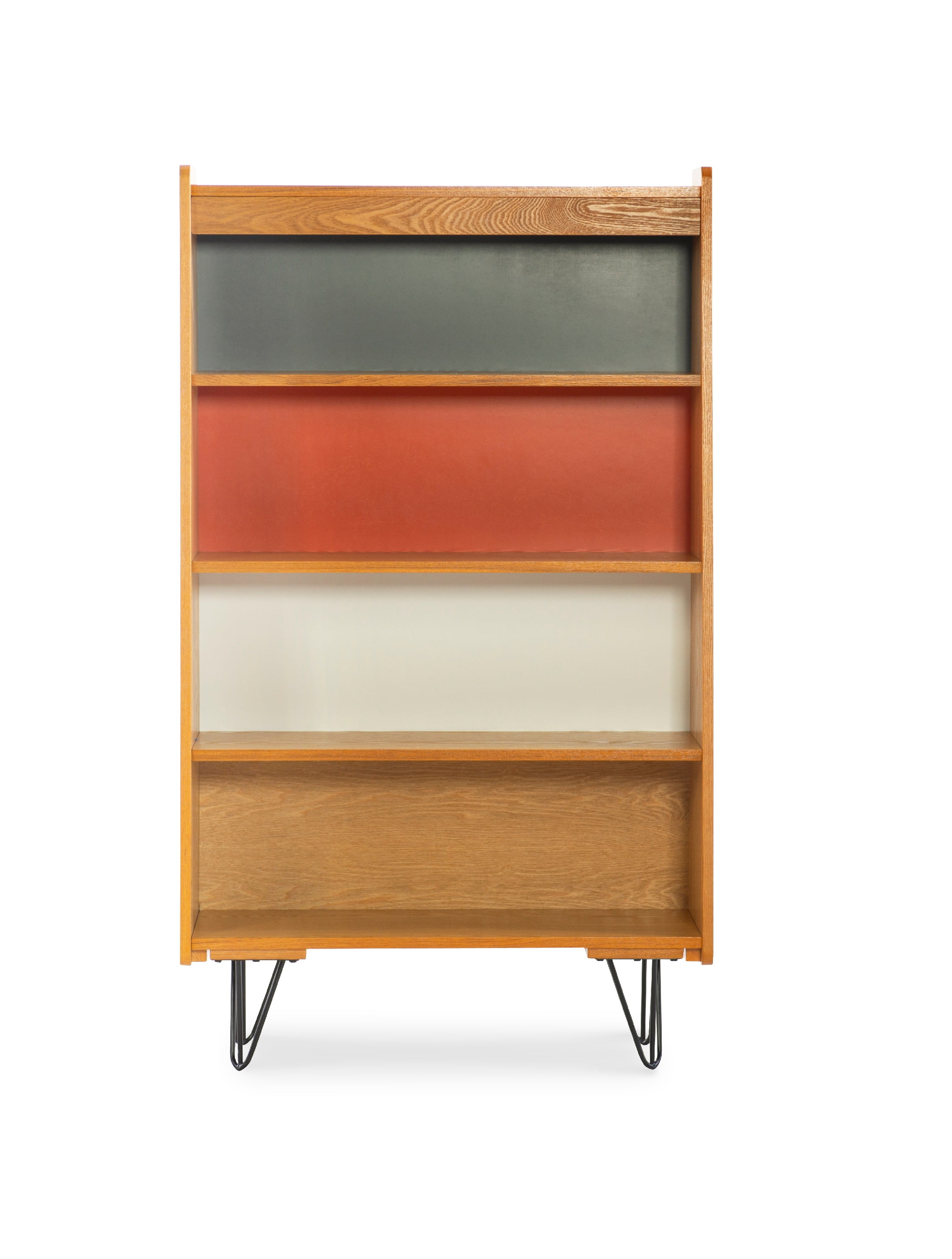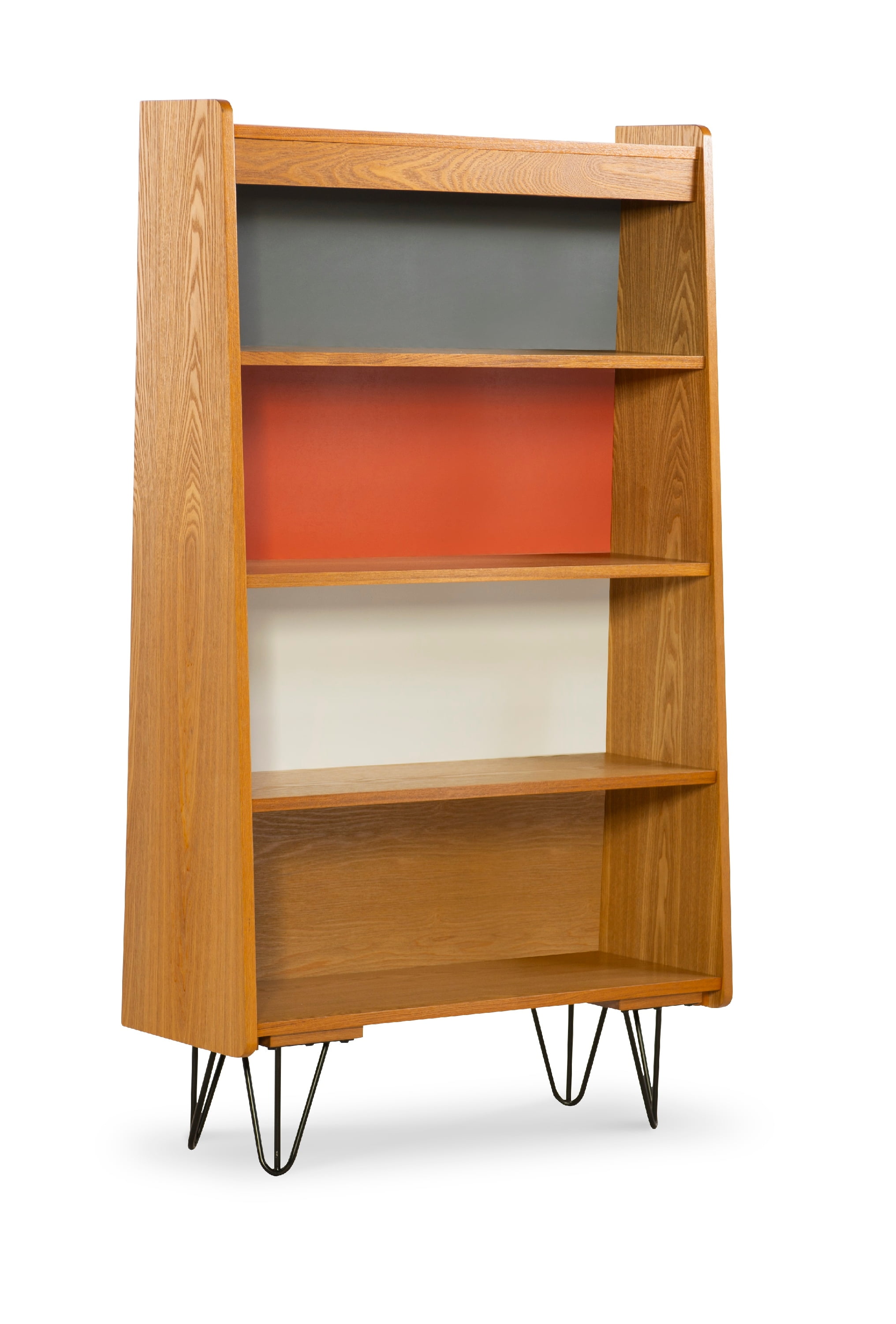 Add contemporary style and storage to your home with the perry bookcase. Four shelves provide ample storage and display space. White, orange and gray shelf backs add a pop of color to the ash veneer frame. Iron legs keep the piece sturdy.