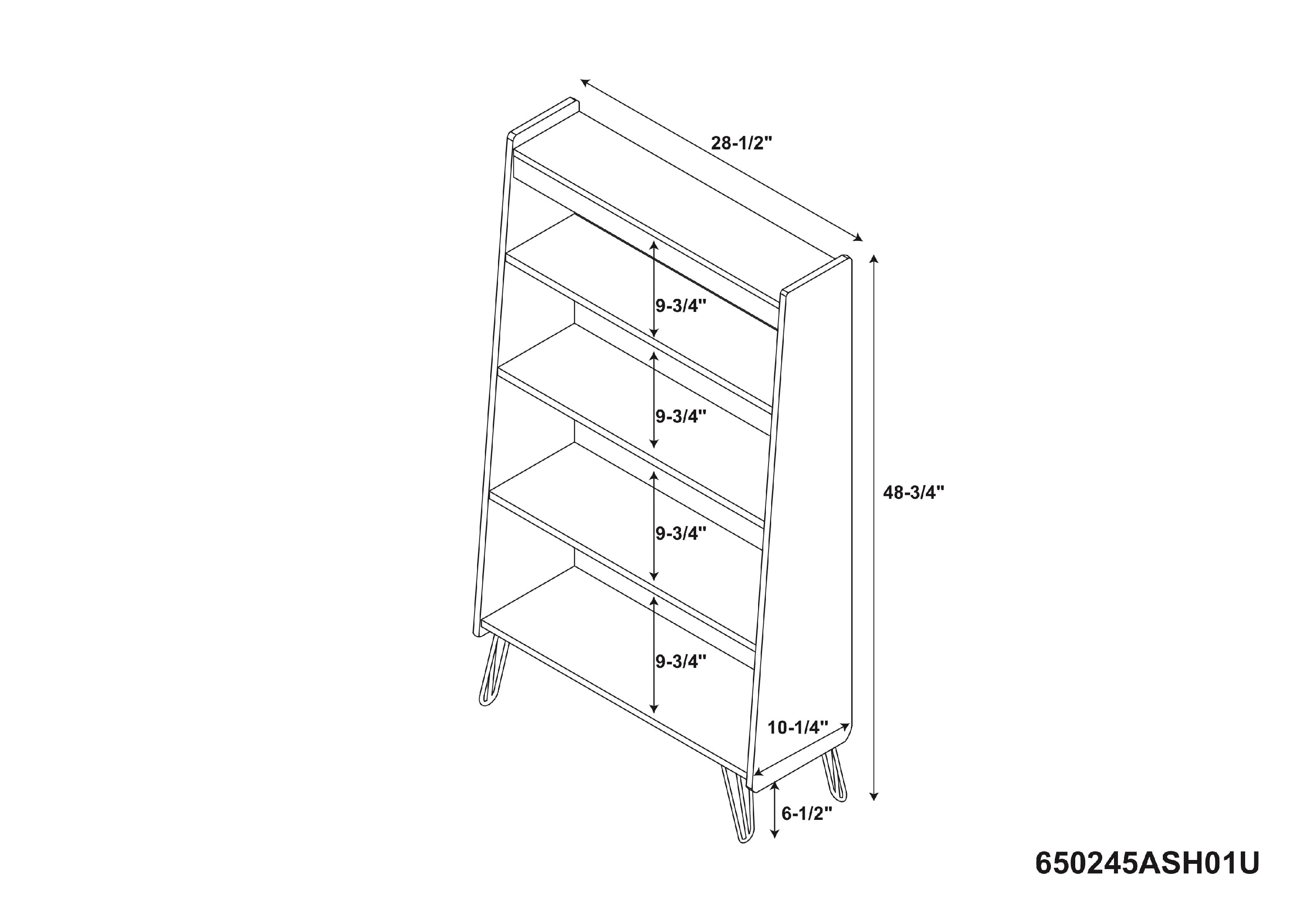 Contemporary design and style Four shelves provide ample storage space. Iron Legs Ash Veneer Frame Natural, Gray, Orange and White Finish Shelf 1 and 2: 27.36″x6.3″x9.65″ ; Shelf 3: 27.36″x8.27″x9.65″ Assembled Dimensions: 28.5″w x 10.25″d x 48.75″h Assembly Required Ships in 1 box Brand: Linon