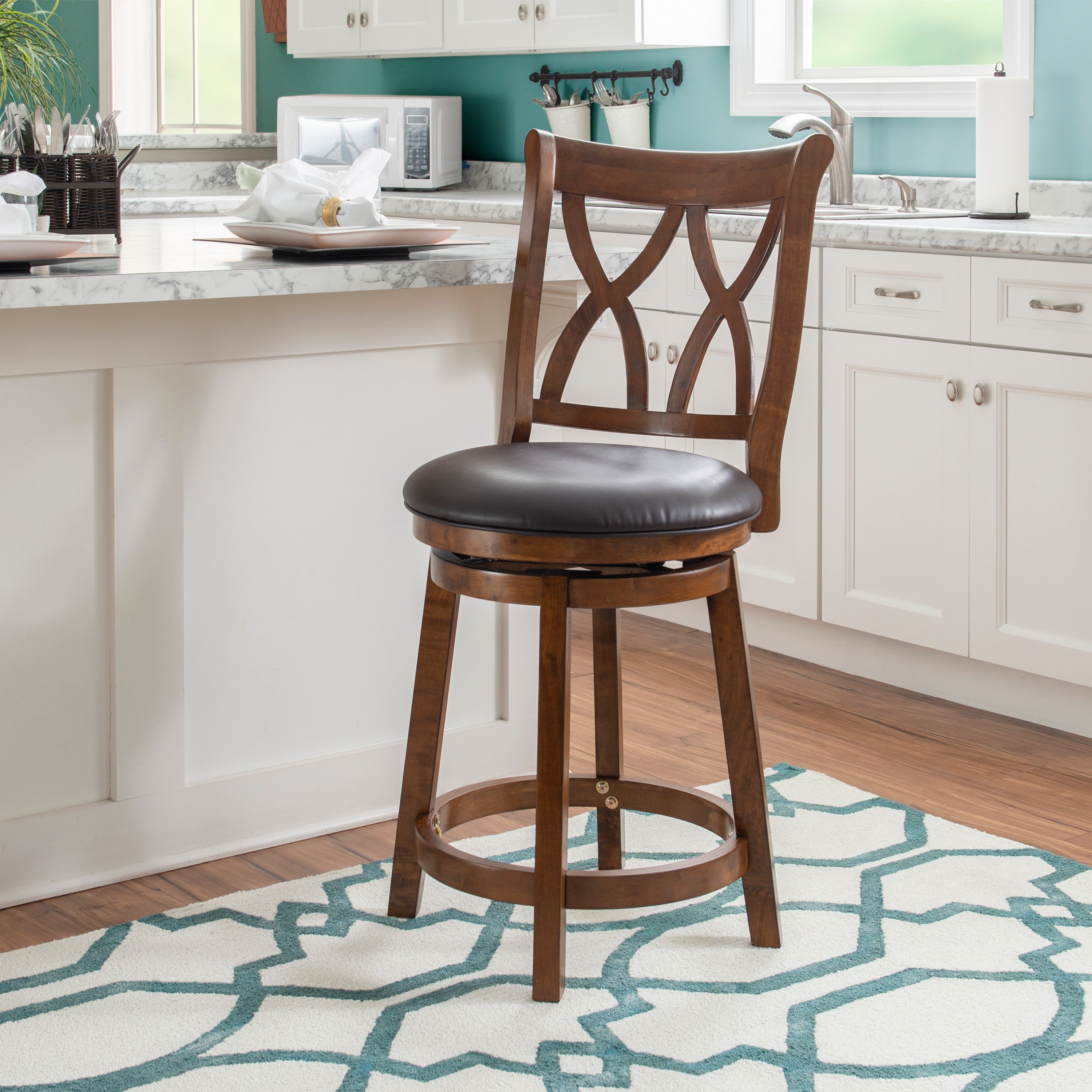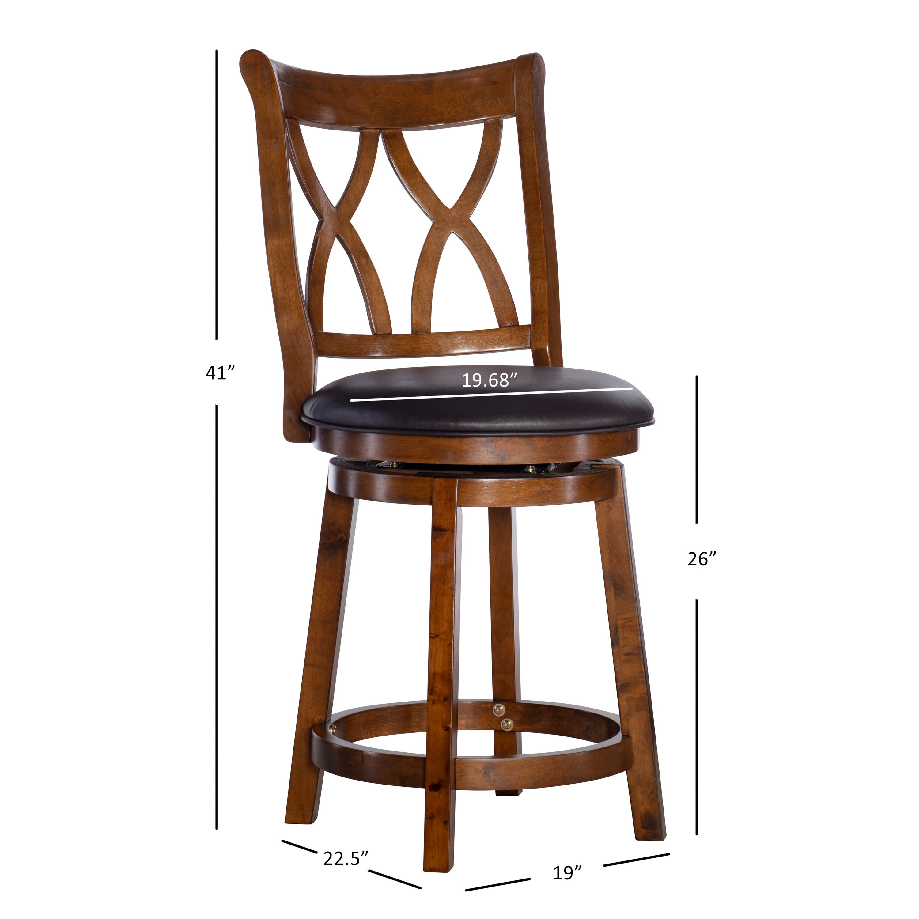 The right Big & Tall Counter Stool can suit just about anyone, and this robust, oversized piece of seating furniture can do just that. The back is curved and angled for greater comfort and the nicely cushioned seat, big enough to make everyone cozy, swivels a full 360 degrees. The double X back design is a stylish touch that provides support you can settle into, while the straight legs and circular brace sturdy the design. A perfect companion for a kitchen counter, island or counter height top table. Features: Crafted from Rubberwood and Plywood Rustic Oak Brown Finish Compatible with counters and counter height tables ranging 34″ to 36″ high Seat swivels 360 degrees so getting seated and following conversations is easy Black faux leather seat is cushioned, comfortable and easy to clean Circular wood brace acts as a footrest and sturdies the stool Counter Height Specifications: Assembly Required: Some Assembly Required Product Dimensions: 21″w x 24″d x 43.5″h Product Height: 28.67 lbs Seat Height: 23.5″ Seat Dimensions: 20″w x 20″d Weight Capacity: 275 lbs