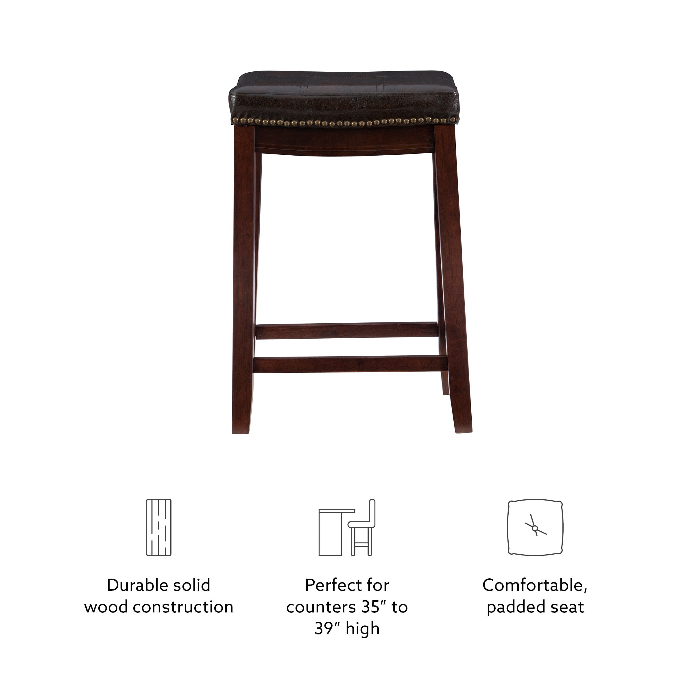 Sophisticated Faux Leather: Mottled brown faux leather upholstery with double-needle stitching for a refined look and easy maintenance. Sturdy Solid Wood Frame: Built from durable rubberwood with a rich brown stain for lasting strength and classic appeal. Antique Brass Nailhead Trim: Adds a timeless accent that enhances both traditional and modern decor styles. Ergonomic Saddle Seat: Contoured for comfort and designed for extended seating with a plush feel. Built-In Footrest: Supports relaxation while adding structural stability. Space-Saving Backless Design: Easily tucks under counters and tables when not in use. Perfect Counter Height: Designed for counters and islands ranging from 35” to 39” high with a 26.5” seat height. High Weight Capacity: Supports up to 350 lbs, ensuring durability and reliability.
