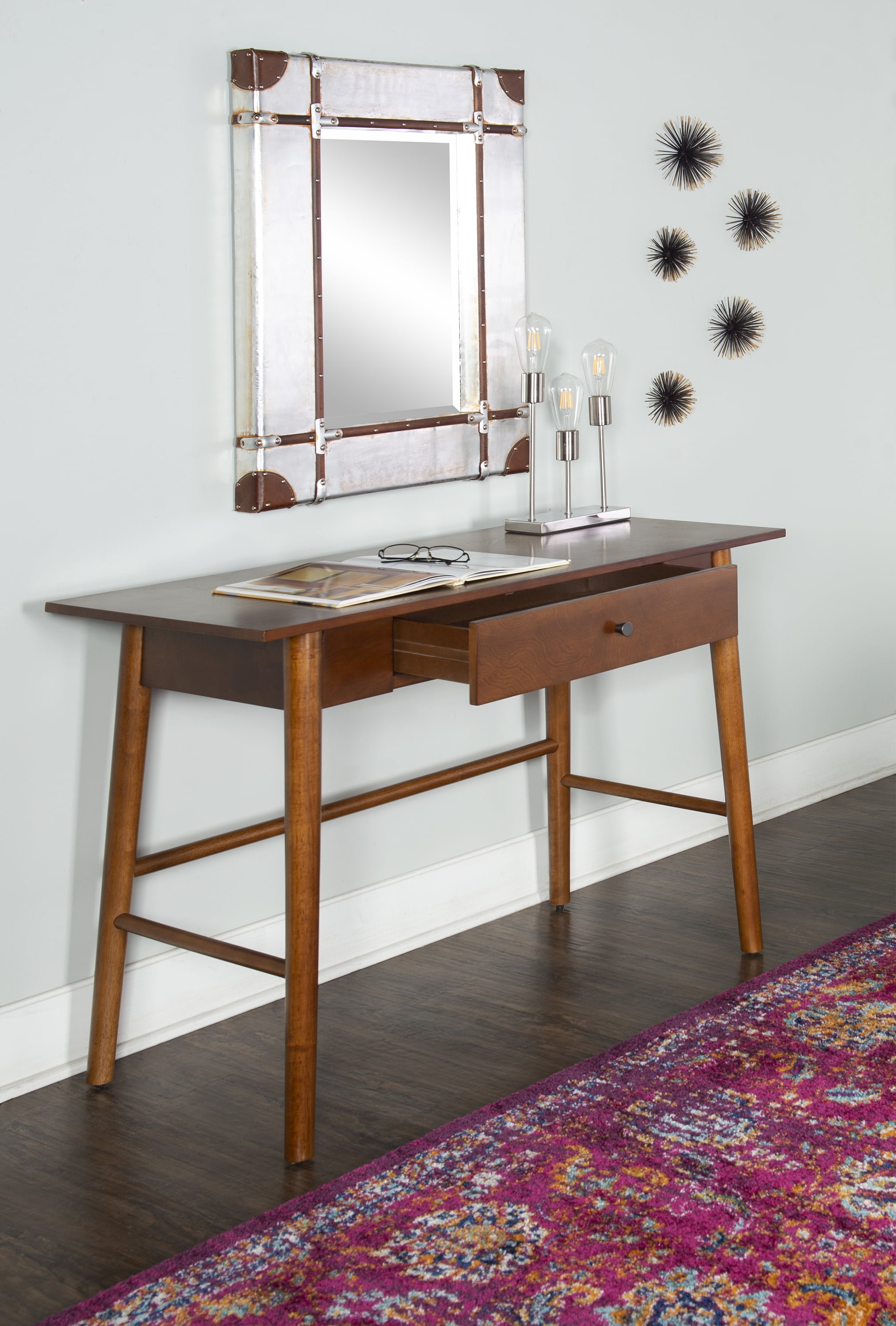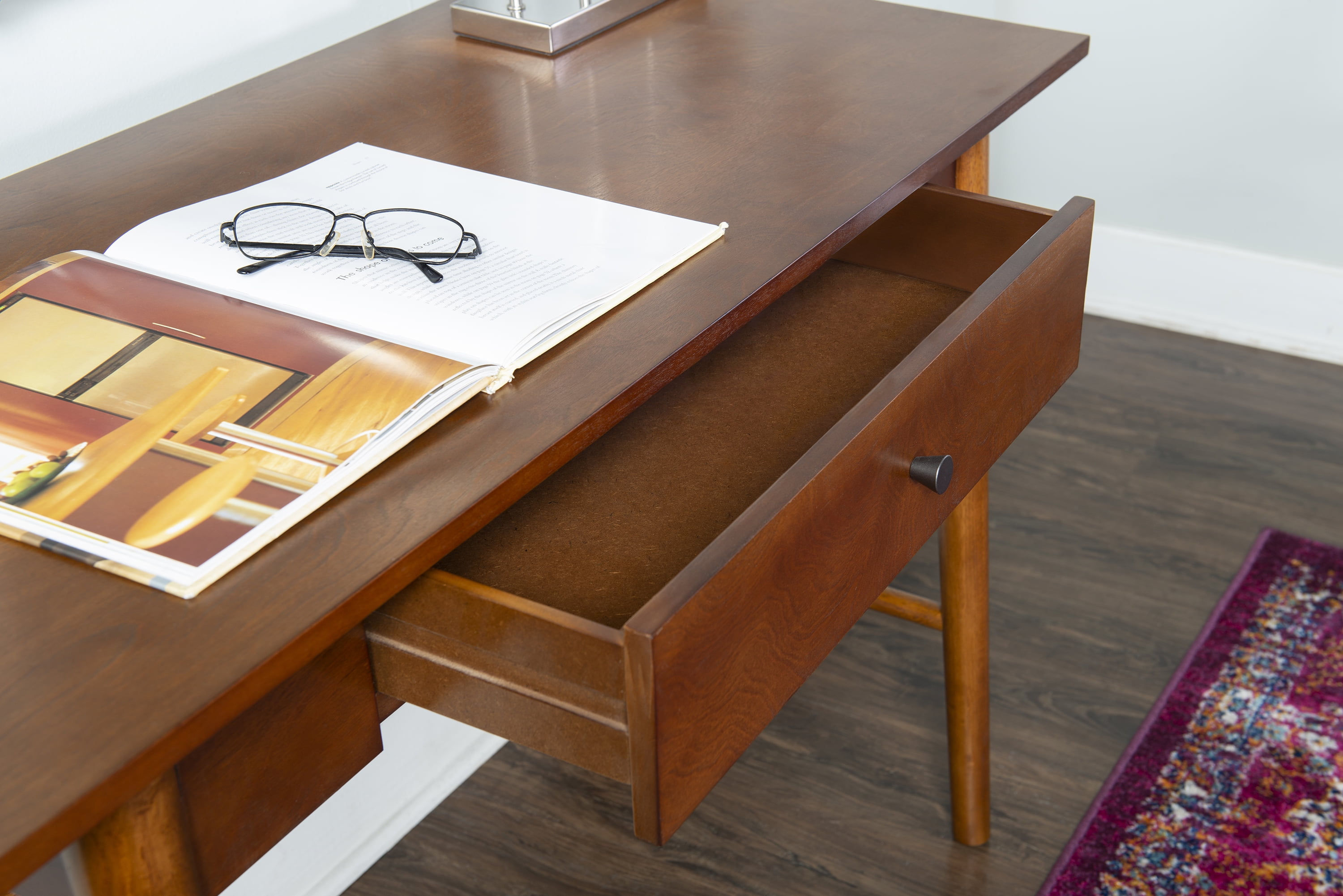 Charlotte Desk Add A Touch Of Mid-Century Modern Style To Your Home With Our Charlotte Desk. The Sleek Lined Design Is Finished In A Rich, Warm Brown. A Single Drawer Is Perfect For Providing Hidden Storage Space For Supplies. Perfect For A Home Office Or Work Area. Mid-Century Modern Style Single Drawer For Storage Sleek Lined Design Rich Brown Finish Sturdy And Durable Drawer Dimension: 20.67″ X 10.9″ – Material: Rubberwood, Solid Wood, Mdf, Birch Veneer – Finish Color: Walnut – Item Depth: 42 – Item Height: 30 – Item Width: 19 – Item Weight: 35.27 – Assembled Size: 42 x 19 x 30 – Finish Family: Brown