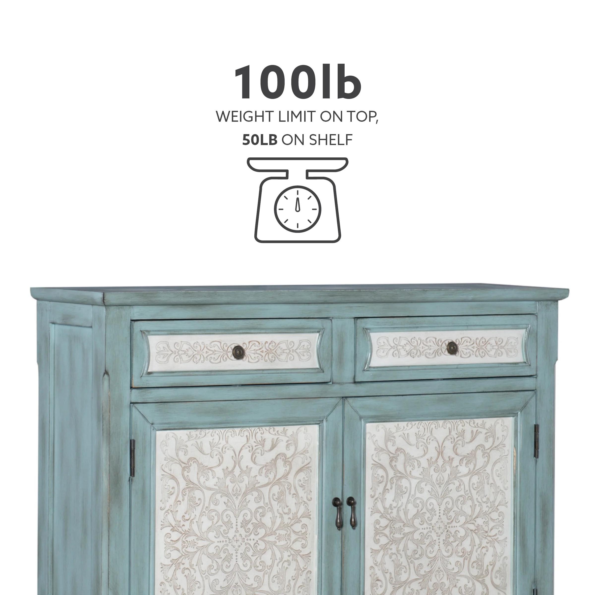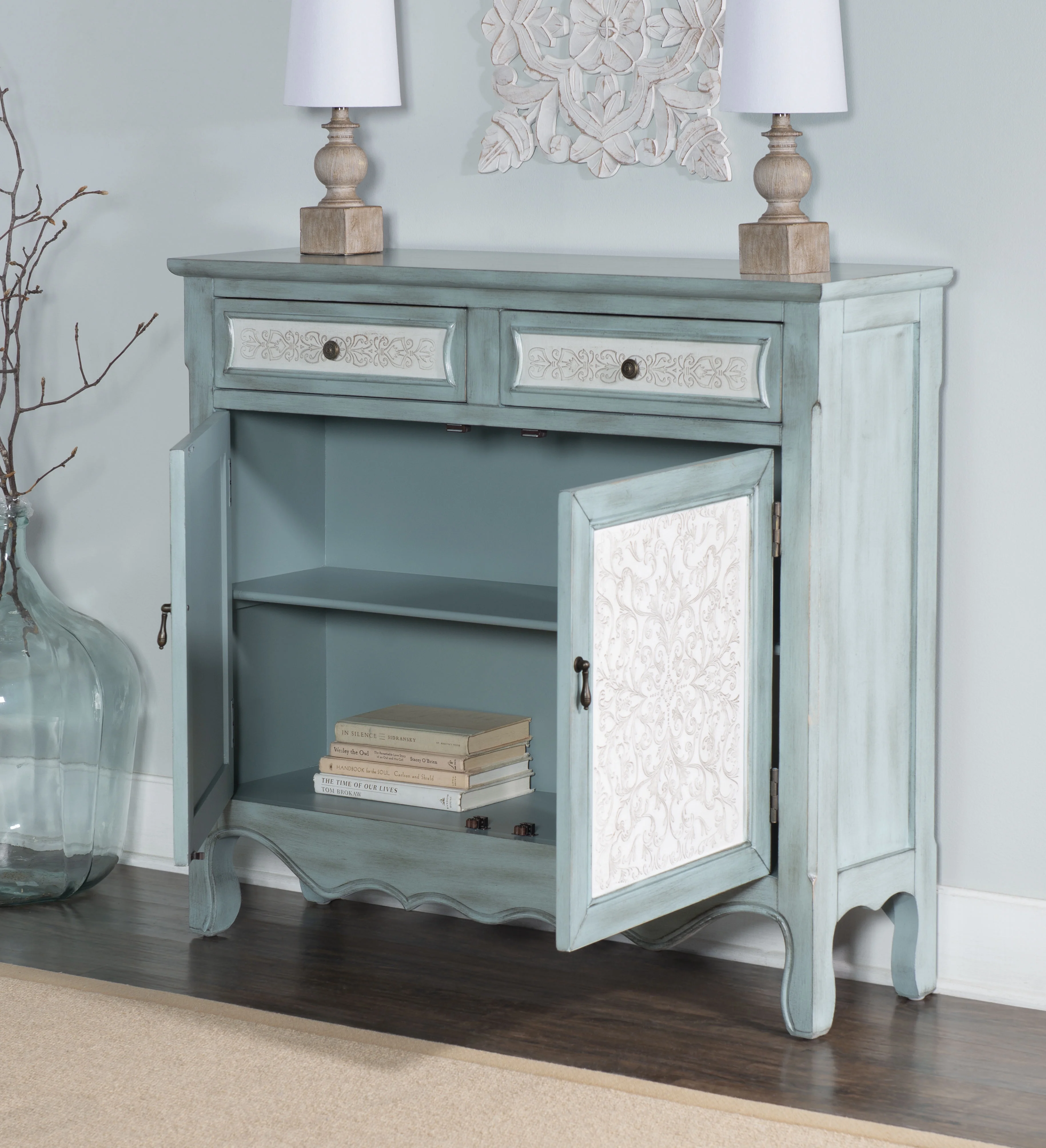 This antique blue slim line console adds sophistication and class to any room. The decorative curved bottom gives an extra touch of drama to the piece, and white panels with a raised decorative pattern adorn the front. Two drawers offer space to hide away accessories or keepsakes. The console opens with two doors to reveal storage space with a fixed shelf. This is the perfect piece to add to any entryway, hall, or living area. Features: Crafted from MDF and Solid Wood Antiqued Blue and White Finish White panels with raised decorate pattern adorn the front Two drawers offer space to hide away accessories or keepsakes Two doors open to storage area with a fixed shelf Narrow design confirms this console can fit perfectly in any space in the home as well as provide storage. Antique brass finished hardware Perfect for an entryway, hall or living area Drawers- 16.25″ x 8.75″ x 4.75″, Shelf – 37.75″ x 9″ x 0.5″, Inside Drawer 15″ x 8″x 3″ Felt lined drawers Specifications: Assembly Required: Fully Assembled Number of Drawers: 2 Product Dimensions: 40.25″w x 11″d x 36″h Product Weight: 56.23 lbs Weight Capacity: Top: 100 lbs, Shelf: 50 lbs Leg Dimensions: 2.75″