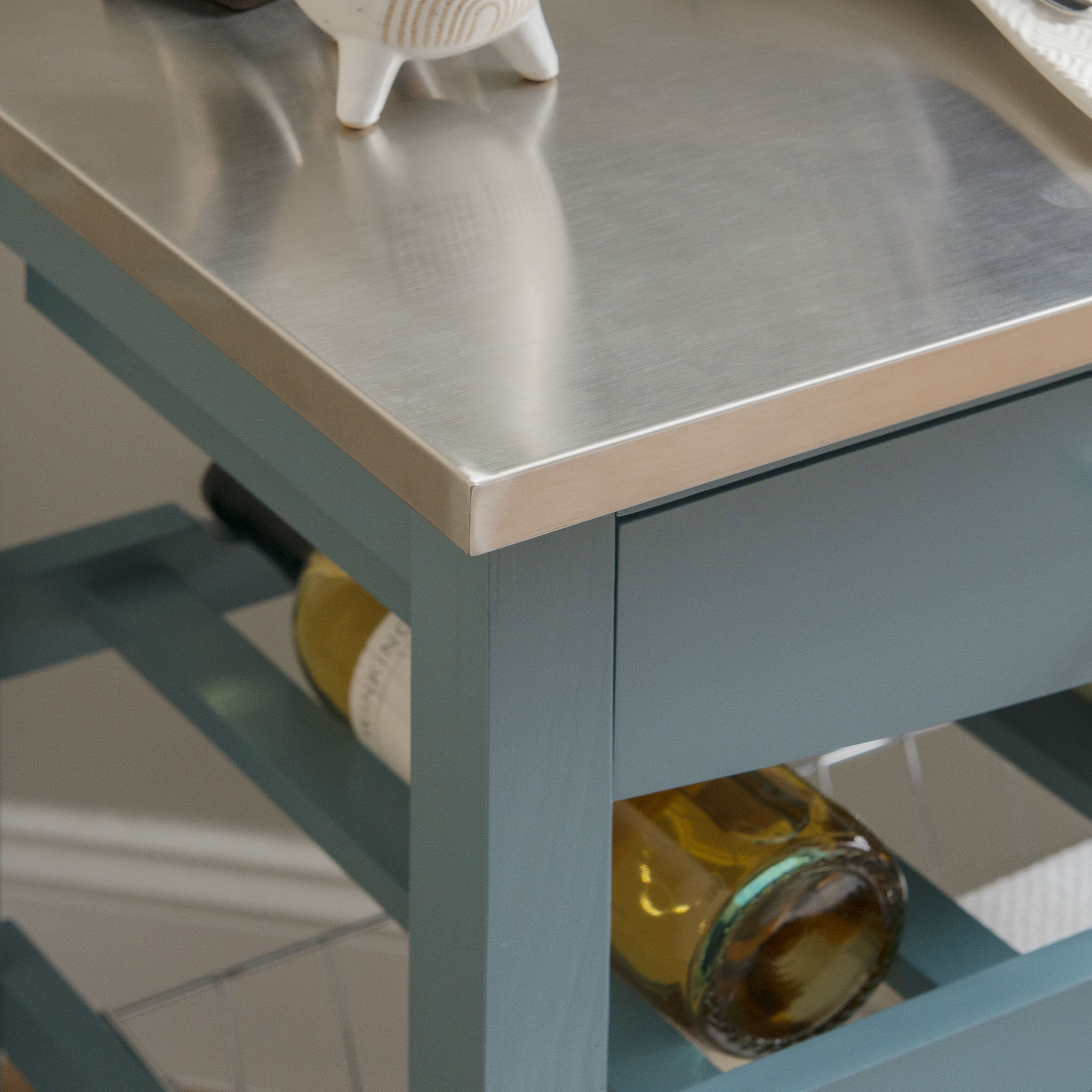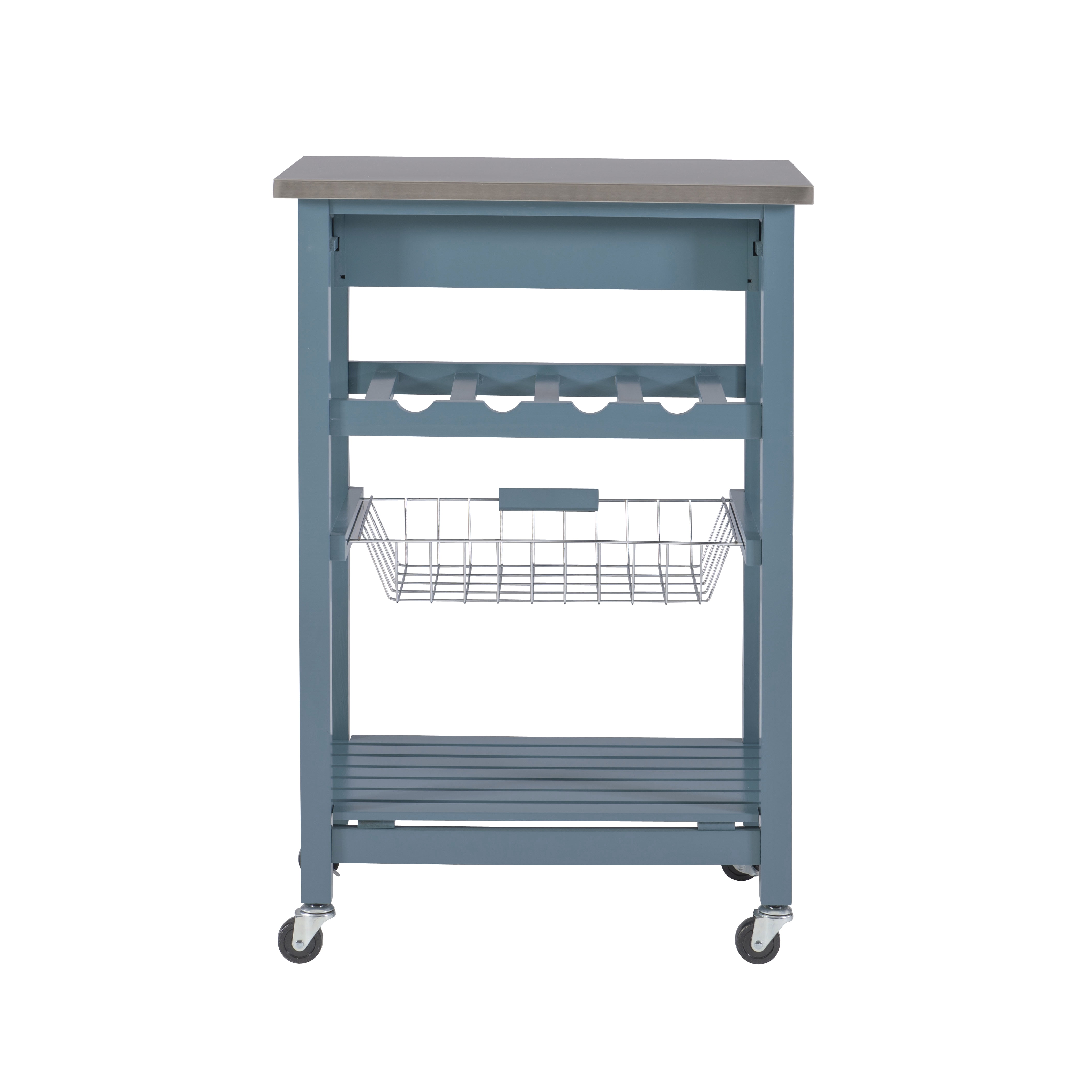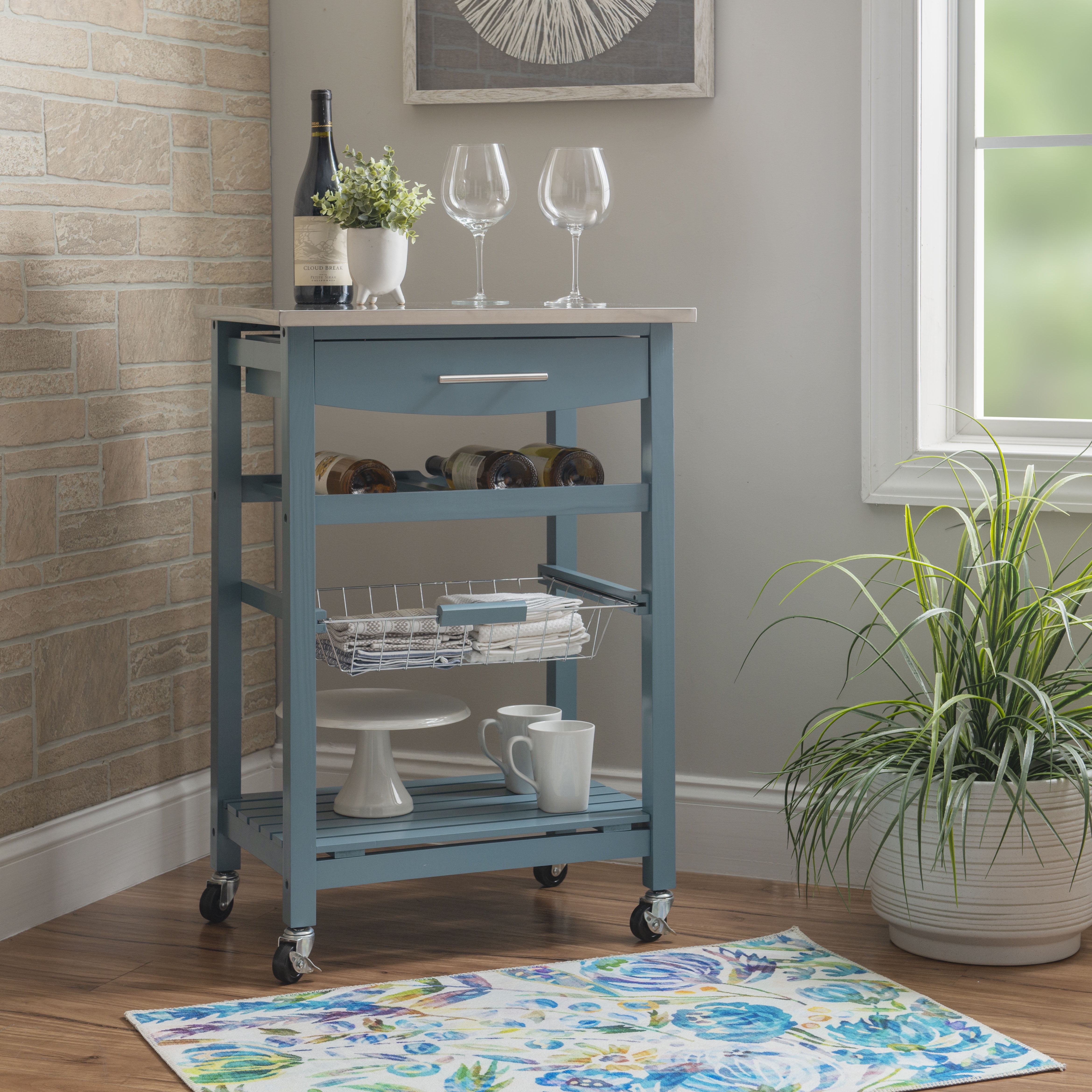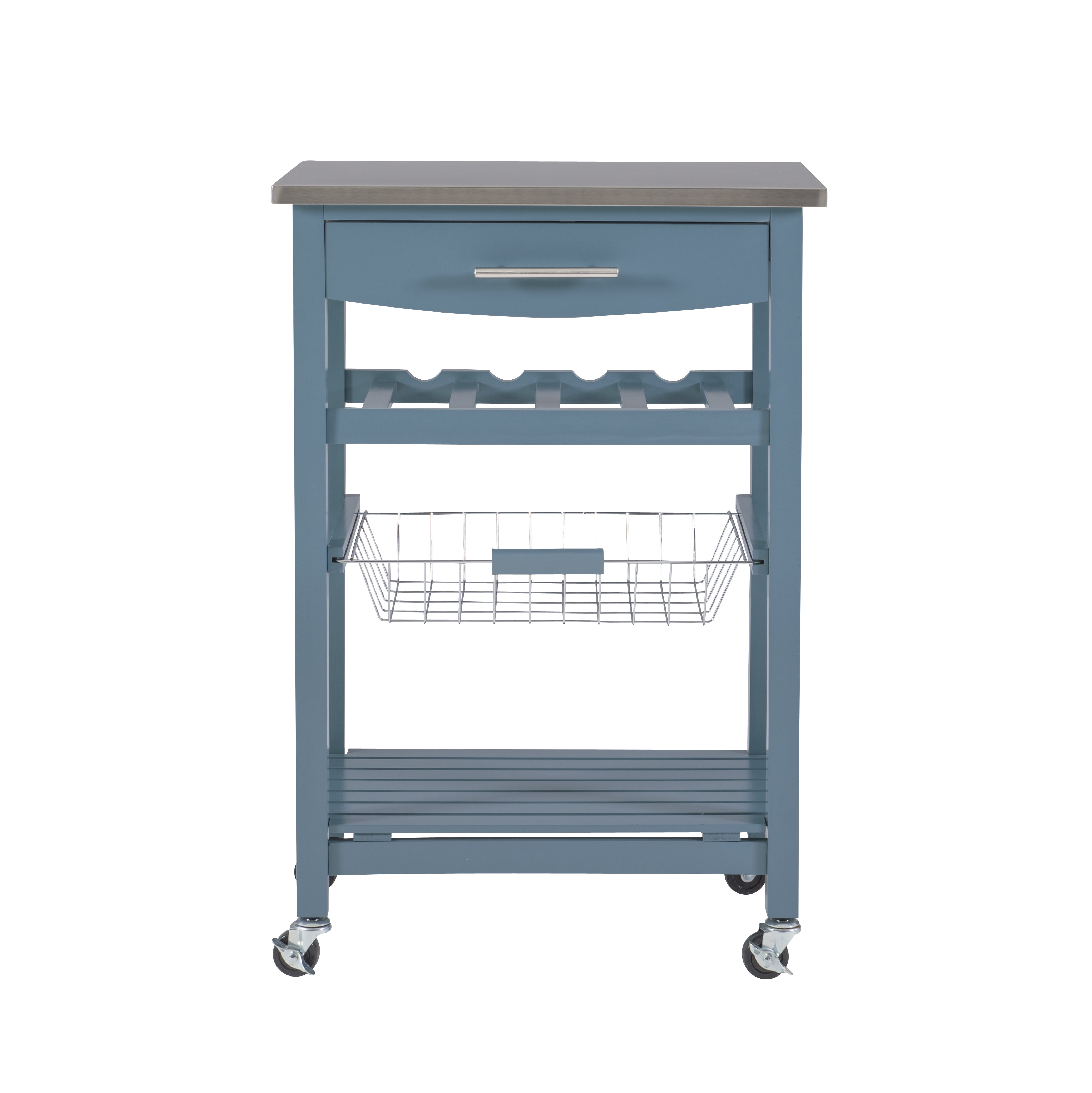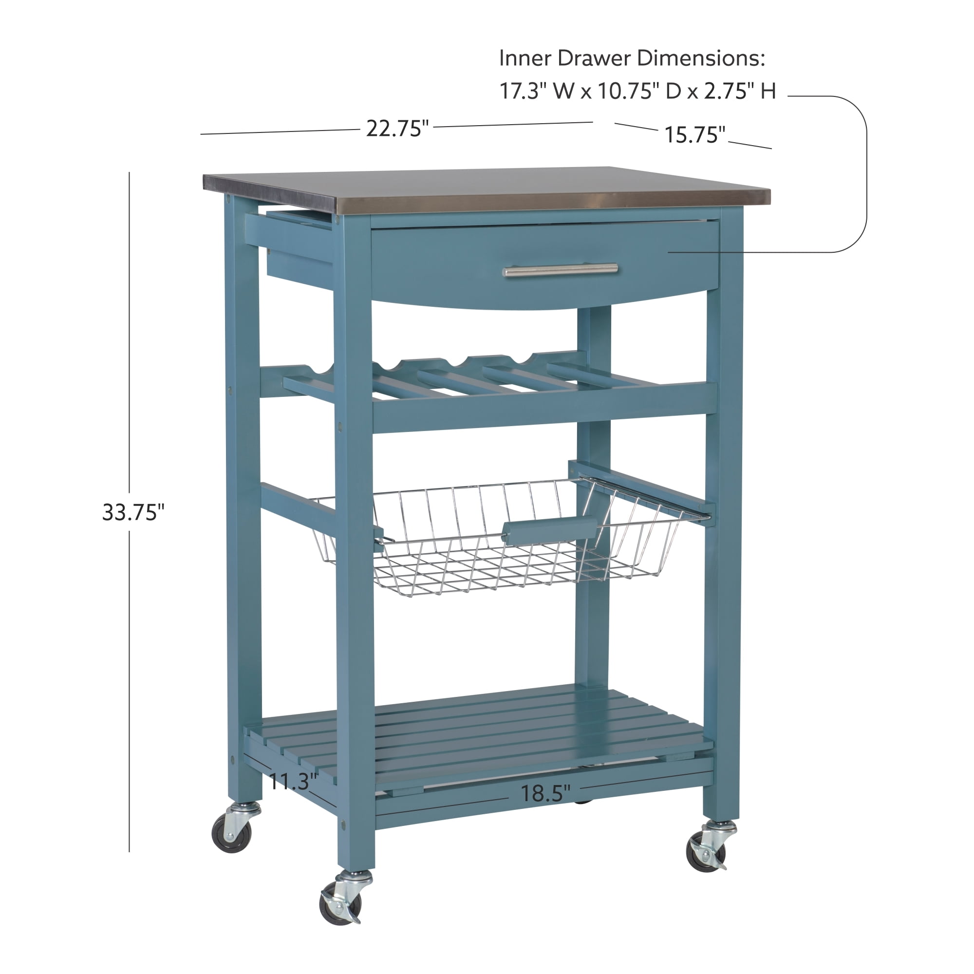 Prep meals and serve drinks in style with this mobile kitchen cart. Its top drawer, four bottle rack and bottom shelf provide ample storage for utensils, wine, dinnerware and more. Keep produce fresh in a pull out wire basket. The food safe, stainless steel top, suitable for a coffee maker or compact microwave, is easy to maintain. This farmhouse style cart gives a fresh appeal to any kitchen or entertainment setting. It glides wherever you need it on durable, locking casters, making your life easier! Assembled Dimensions: 22.75″ W x 15.75″ D x 33.75″ H. Product Weight: 23.14 lbs.