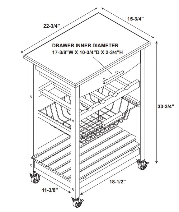 Stainless Steel Top Slide-out wire storage basket and one fixed shelf Four bottle wine storage rack Spacious pull-out storage drawer. Rolling, locking casters make for easy mobility around your kitchen. Drawer Interior Dimensions: 17.32″ x 10.83″ x 2.76″ Assembled Dimensions: 22.75″ W x 15.75″ D x 33.75″ H Product Weight: 23.14 lbs. Brand: Linon