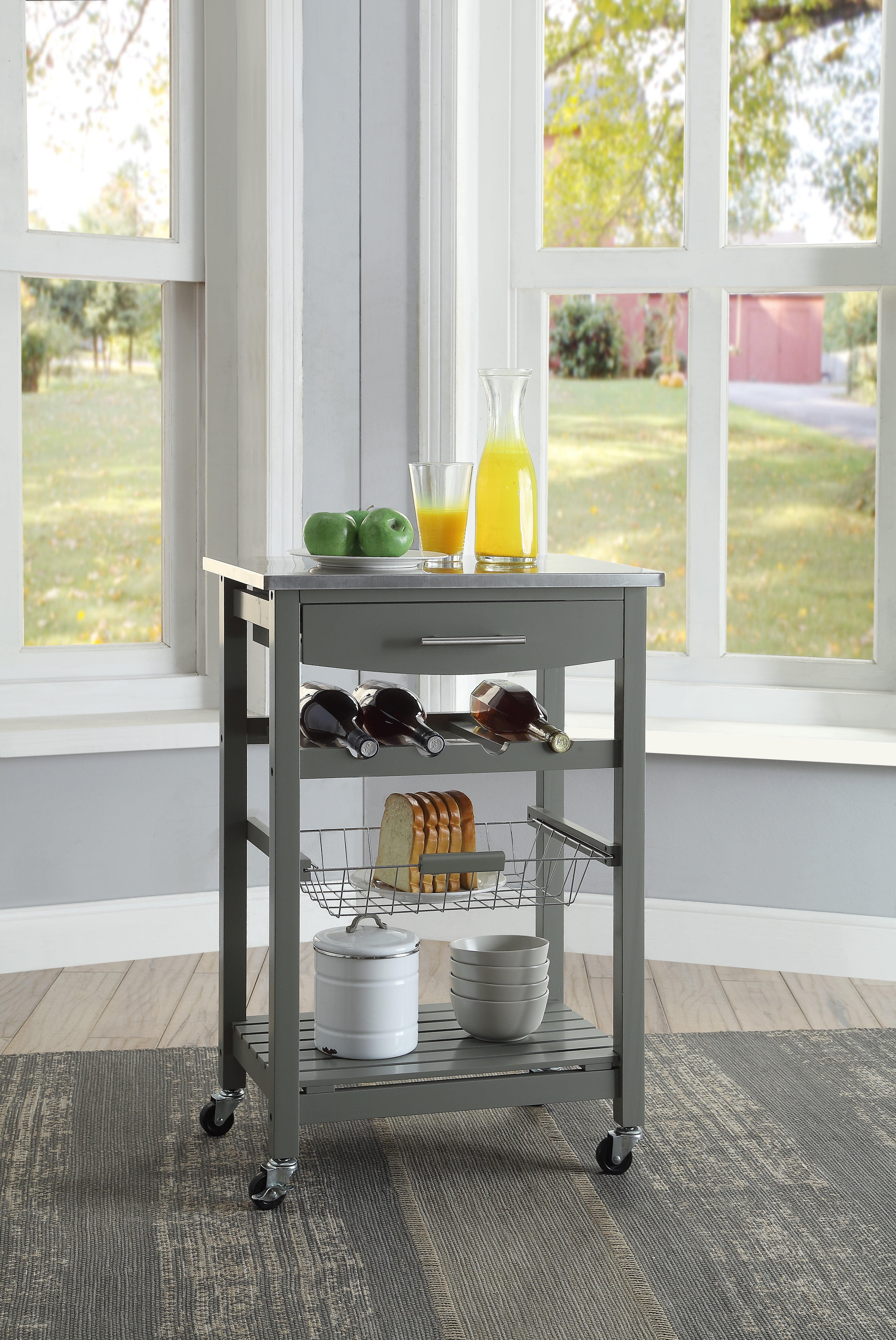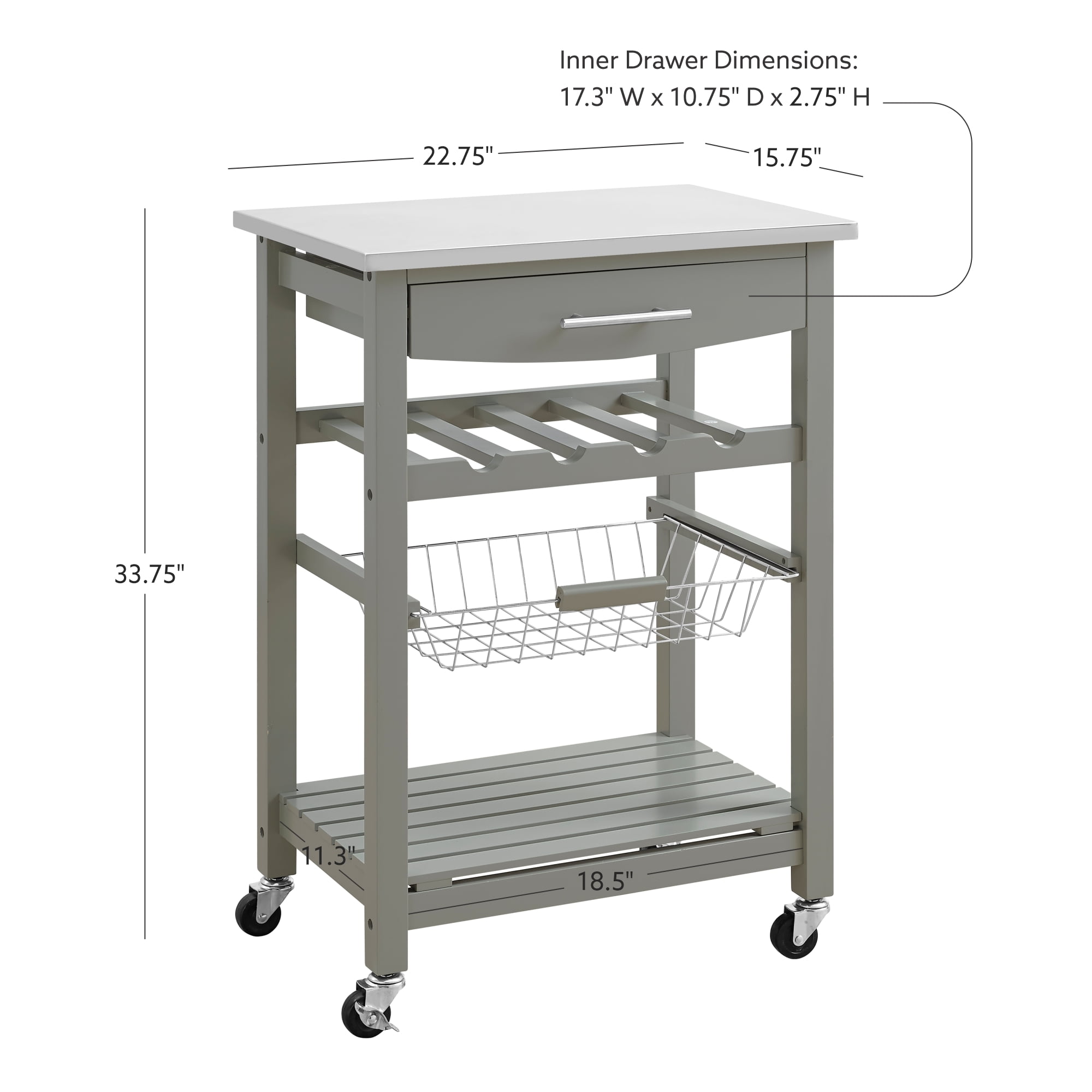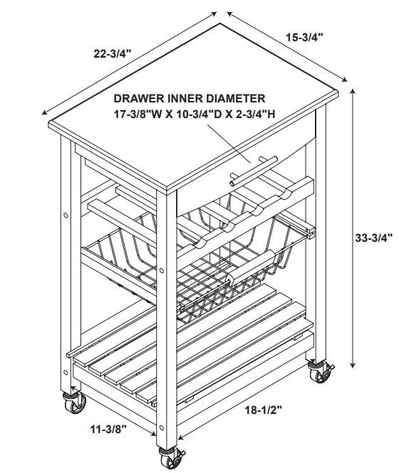 Stainless Steel Top Slide-out wire storage basket and one fixed shelf Four bottle wine storage rack Spacious pull-out storage drawer. Rolling, locking casters make for easy mobility around your kitchen. Drawer Interior Dimensions: 17.32 ” x 10.83 ” x 2.76 ” Assembled Dimensions: 22.75″ W x 15.75″ D x 33.75″ H Product Weight: 23.14 lbs. Brand: Linon