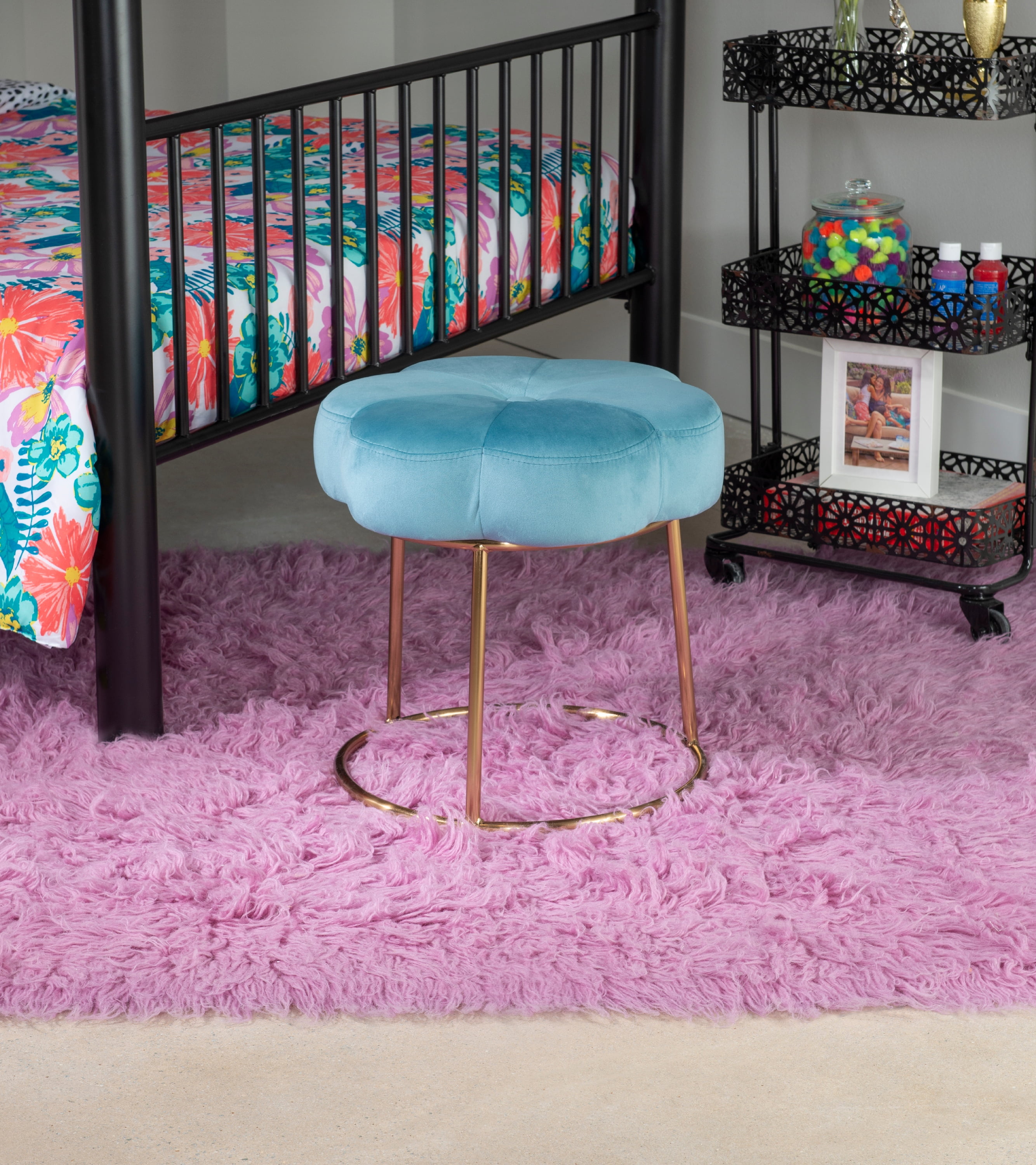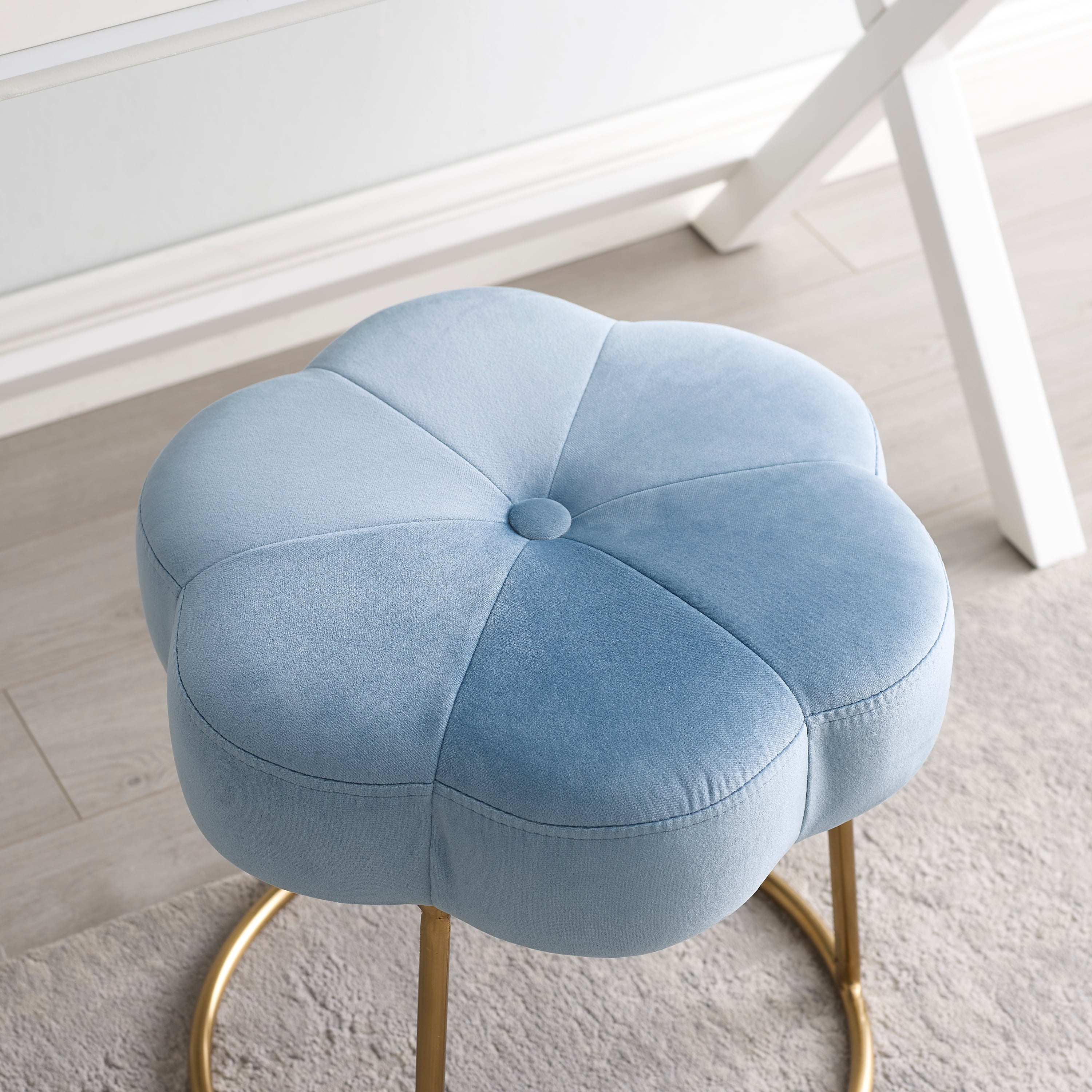 Inspired by boho design, a perfect pairing of minimal lines while still conveying a luxurious style. Plush light blue velvet is used to create this subtle floral shape that offers soft padding for comfort. The foundation is an elegant gold color plated base. Sitting 17.75 Inches off the floor, this happy stool can fit under a make up vanity, bathroom prep table, desk or really, anywhere. Adds a welcomed pop of color to any room. Multiple colors to mix and match.