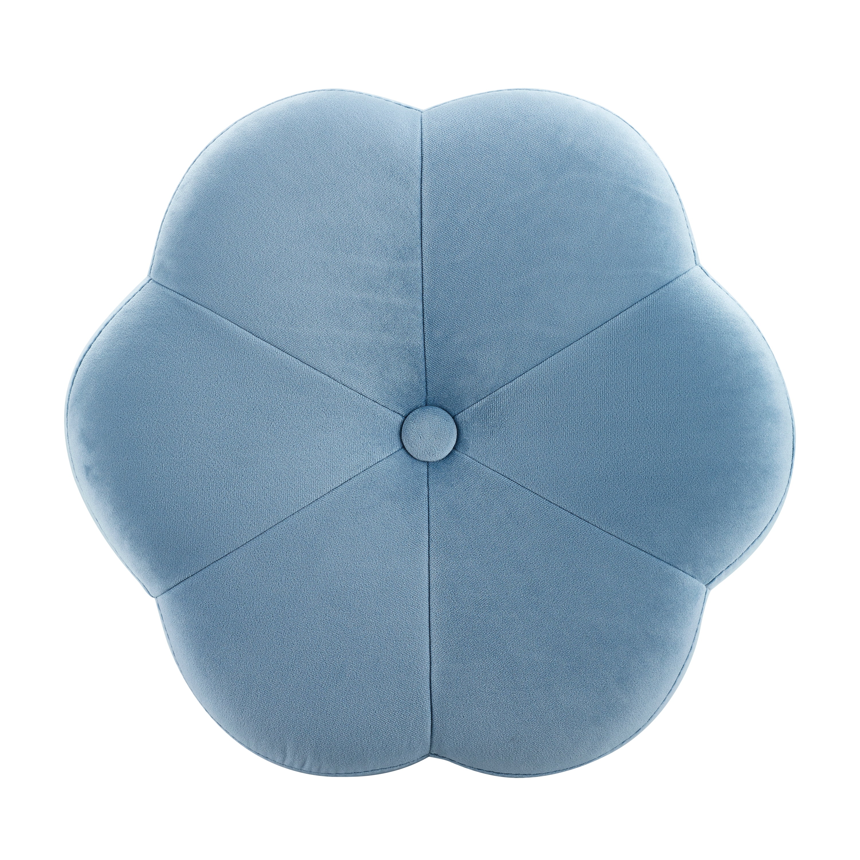 Floral inspired shape in light blue plush velvet fabric Gold plated round tubing base Padded seat Weight capacity 225 lbs Seat dimension 17.75inw x 17.75ind Seat height 17.75in Fully assembled