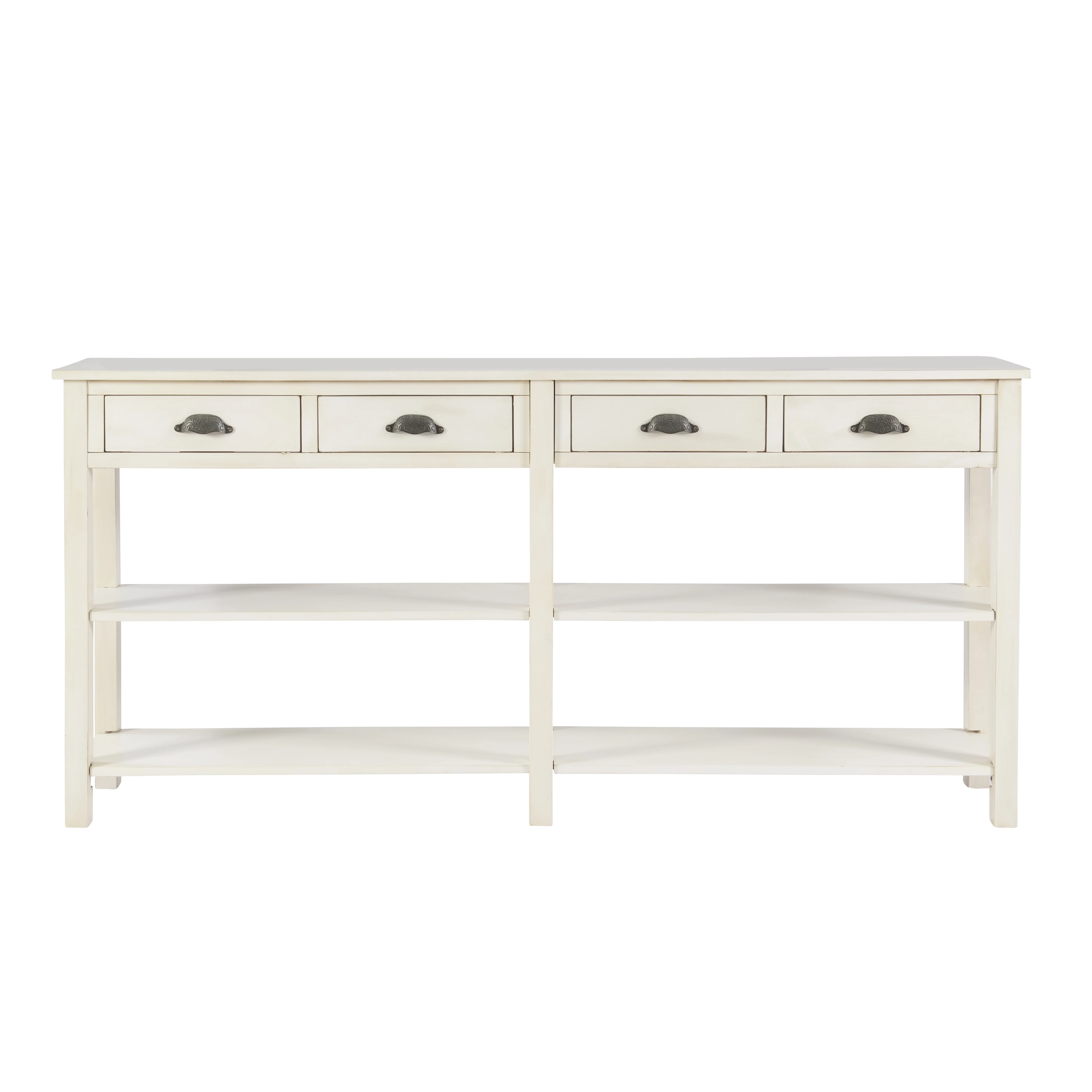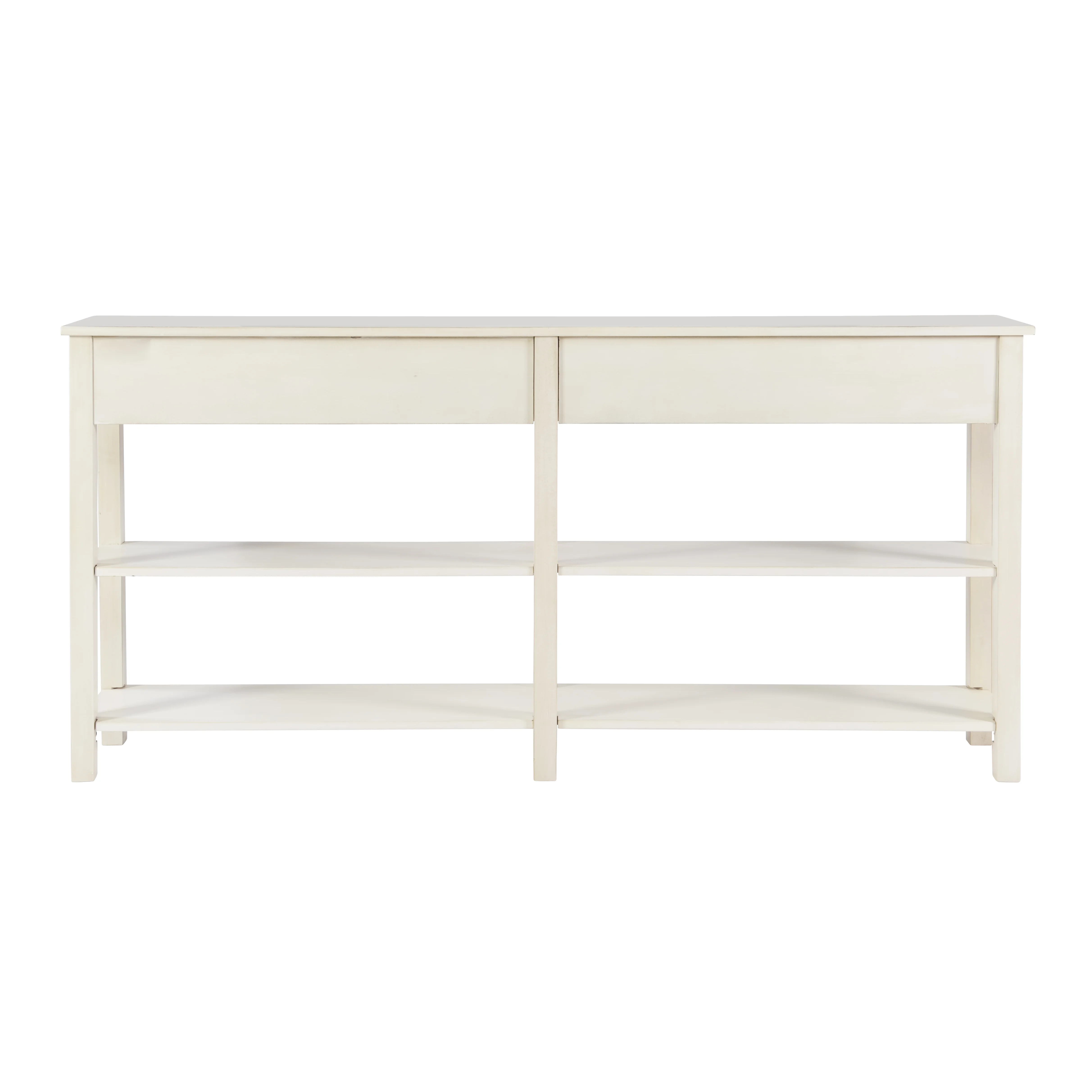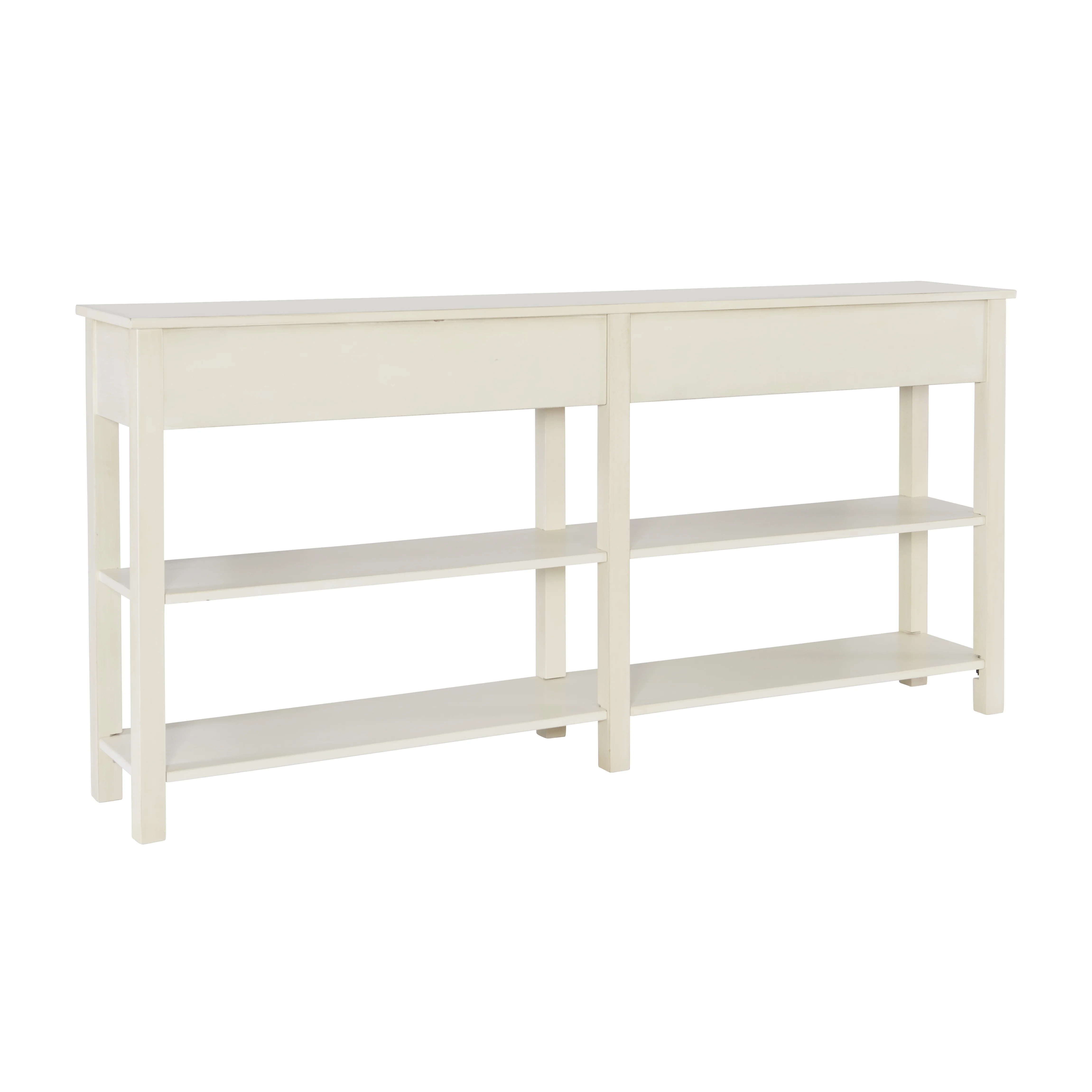 Crafted from Birch Wood and Plywood Cream White Finish Antique finish & cast antique bronze drawer pulls Light, airy look Farmhouse style extended console table Generous shelf space Wide space to display items