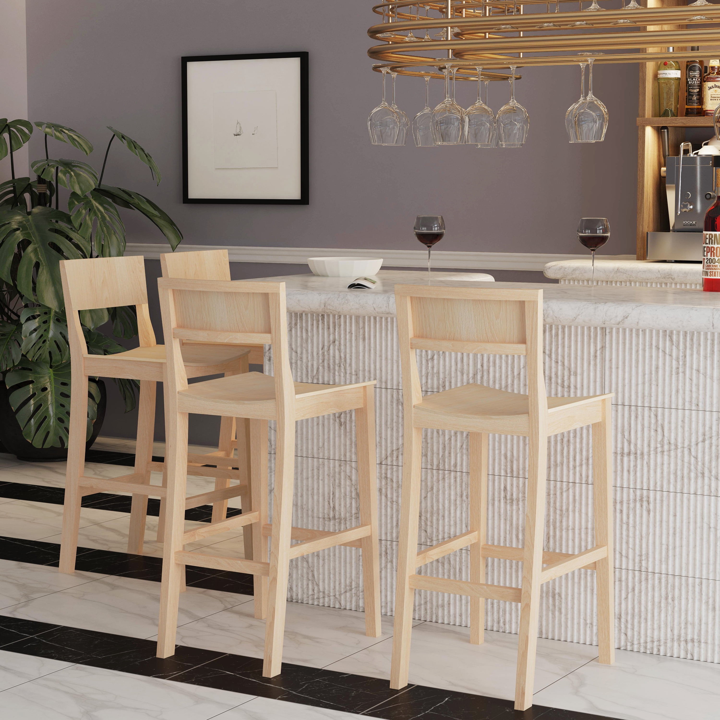 Arrives in a set of two Solid rubberwood construction provides ensured stability and durability Unfinished frame readily allows for customization to best fit your dream dining ensemble Seat height of 30″ is perfect for bars 40″ to 43″ high Supports up to 350 lbs. Arrives with some assembly required Dimensions: 17 L X 21 D X 41.50 H Ships in 1 box