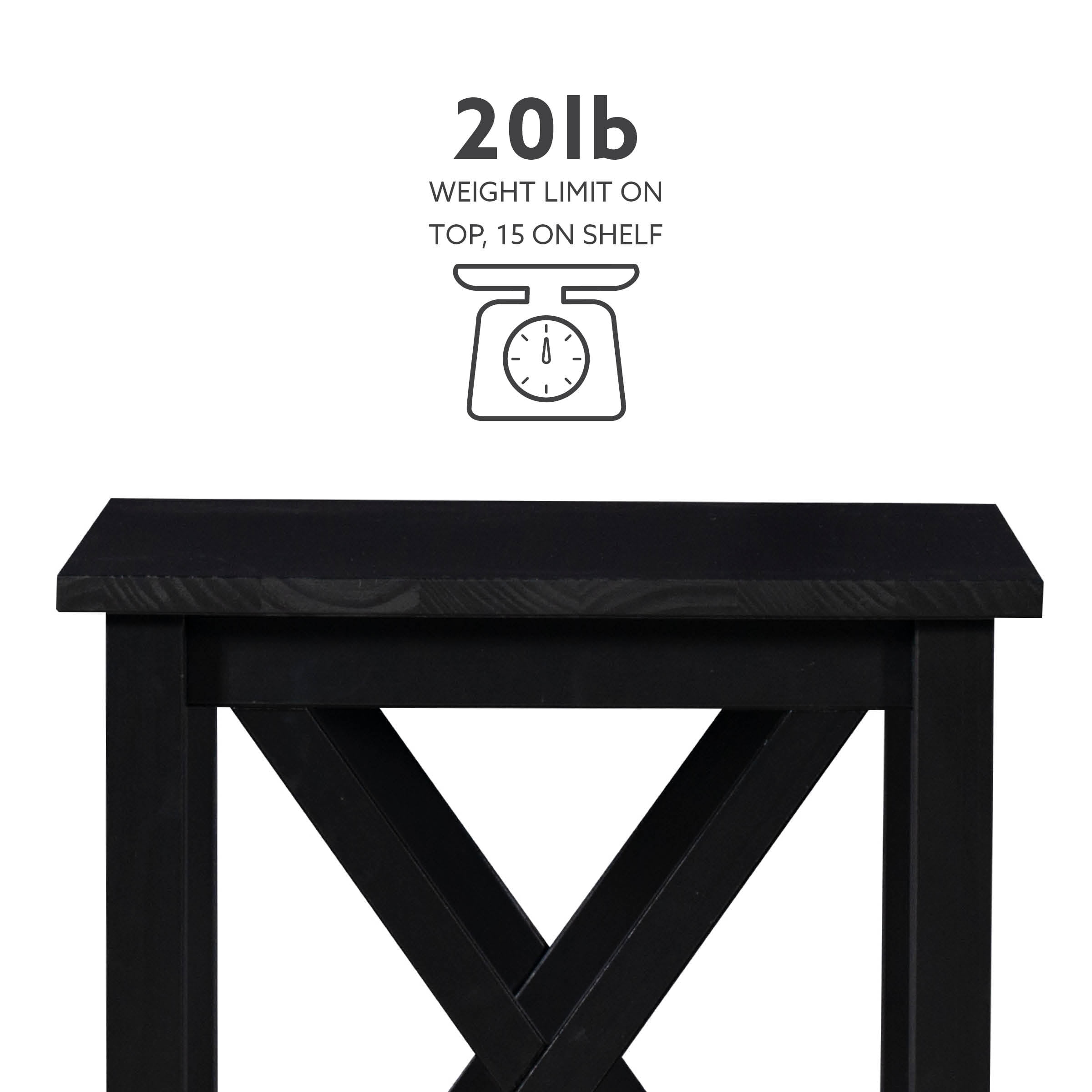 Black finish Two, multipurpose display surfaces Modern farmhouse design that compliments any style Sturdy construction, crafted from solid pine. Black finish will easily coplement any home’s décor Classy X design on sides Suited for any room Use as a side table or night stand Top: 20″ x 17.12″ Assembled Dimensions: 20″w x 17.12″d x 22″h Weight Limit: 20 lbs. (top); 15 lbs (bottom) Part of a collection Easy to assemble Ships in one box