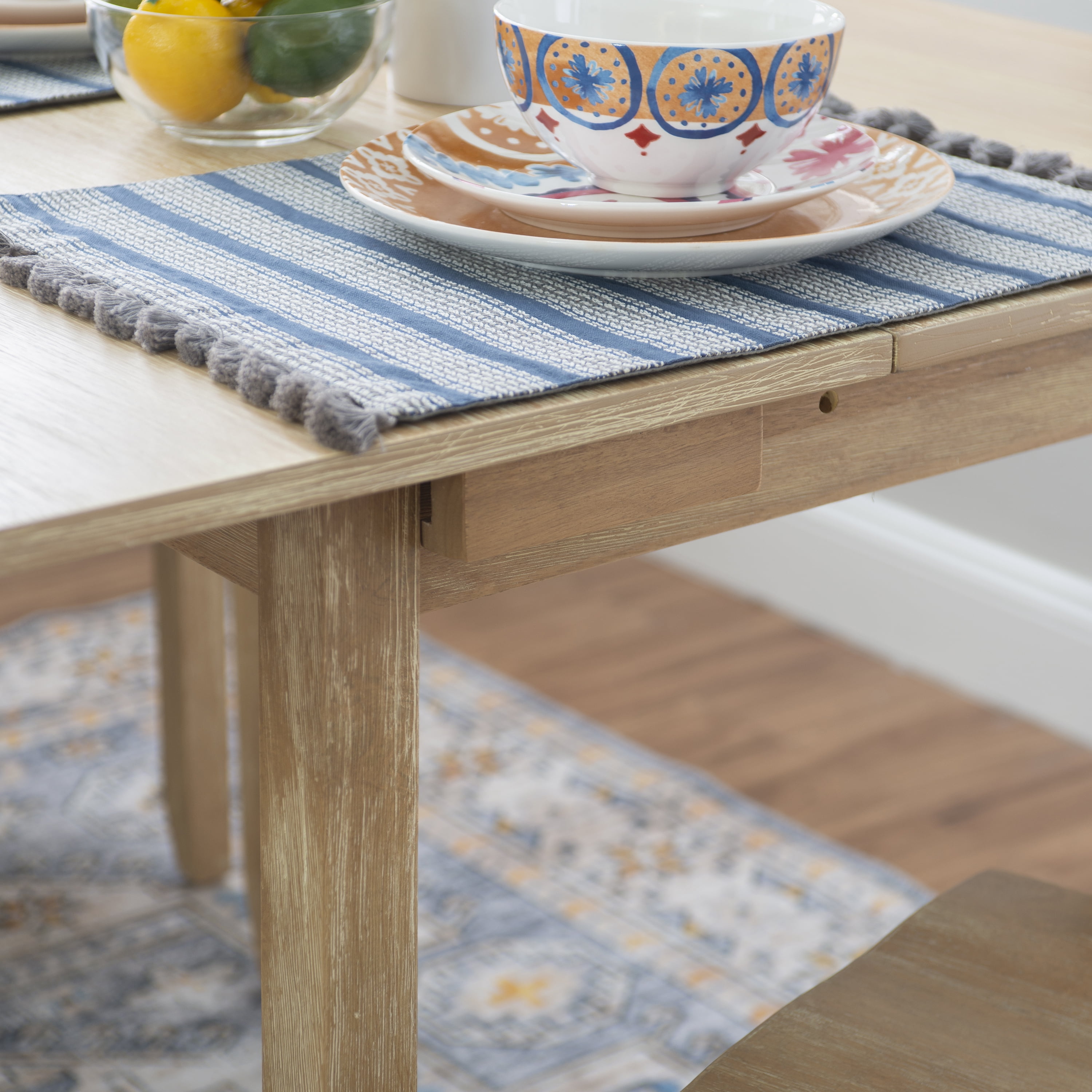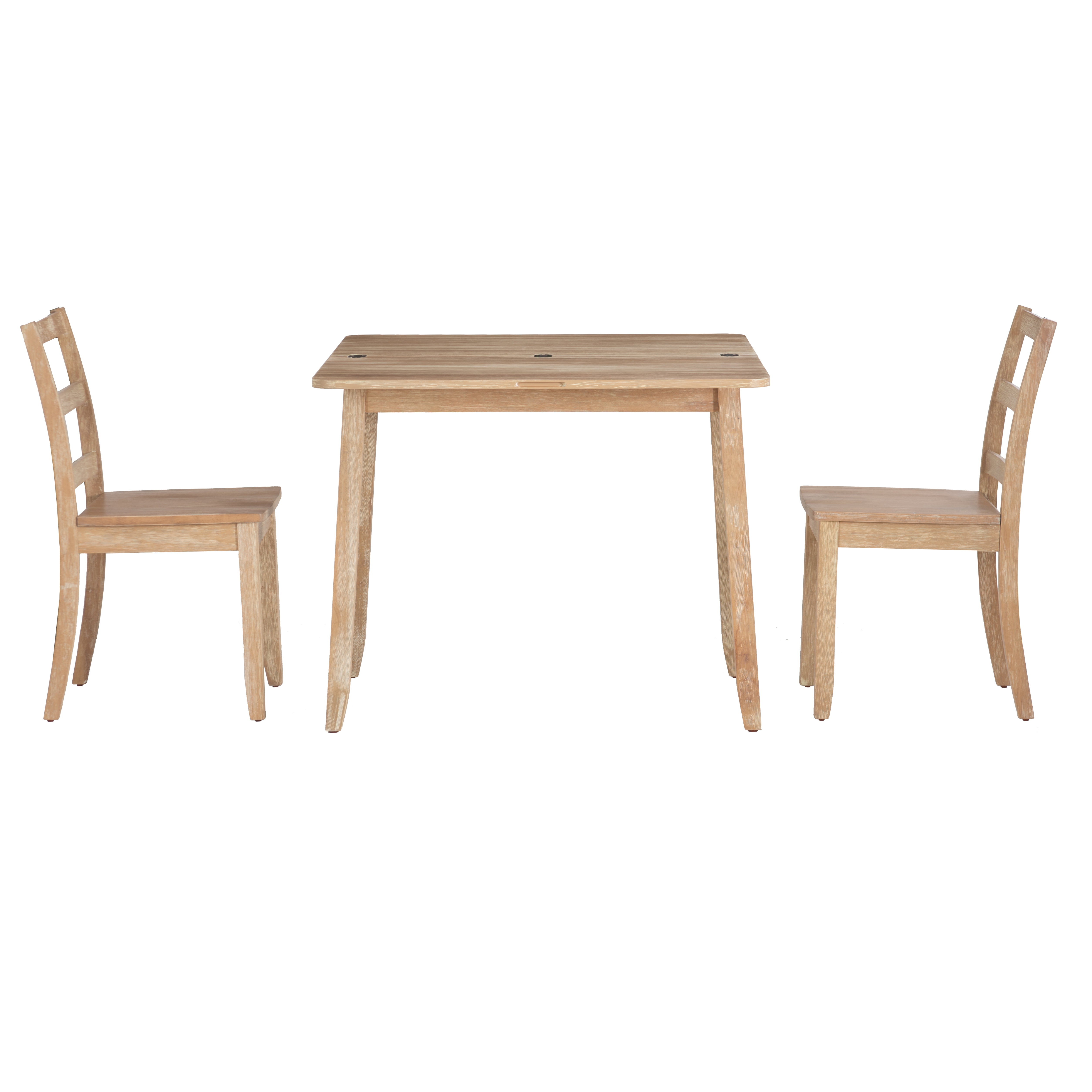 Set includes 2 chairs and 1 table Table top easily opens and doubls in surface area Hidden storage area under the top is perfect for placemats, napkins and cutlery Perfect for small space living, apartments and dorm rooms Multi function use for dining, working, studying, playing board and card games Constructed from durable solid rubber wood Finished in a warm rustic gray Easy assembly required Assembled Dimensions: 36″ W x 39.5″ D x 30″ H Ships in one box