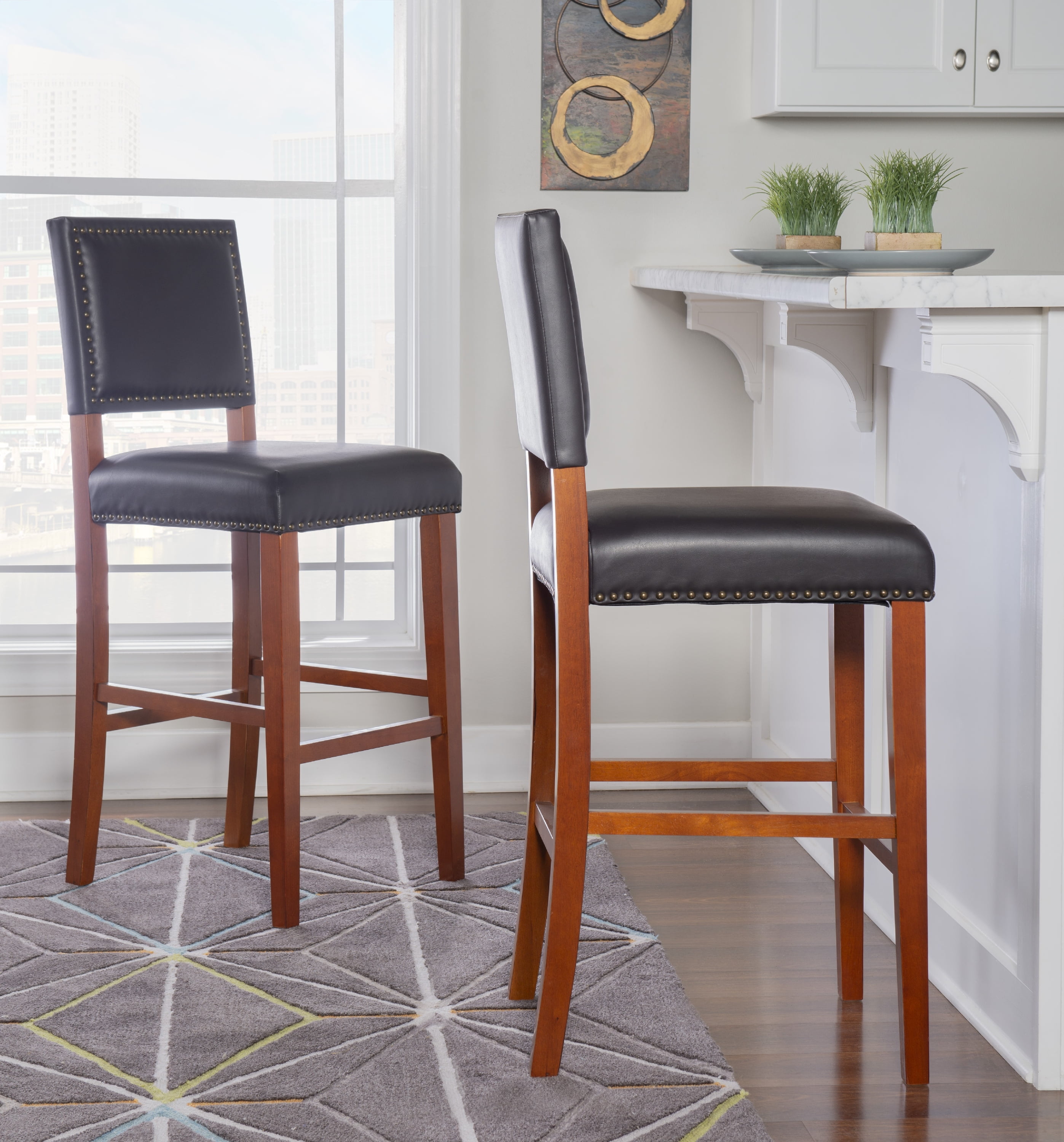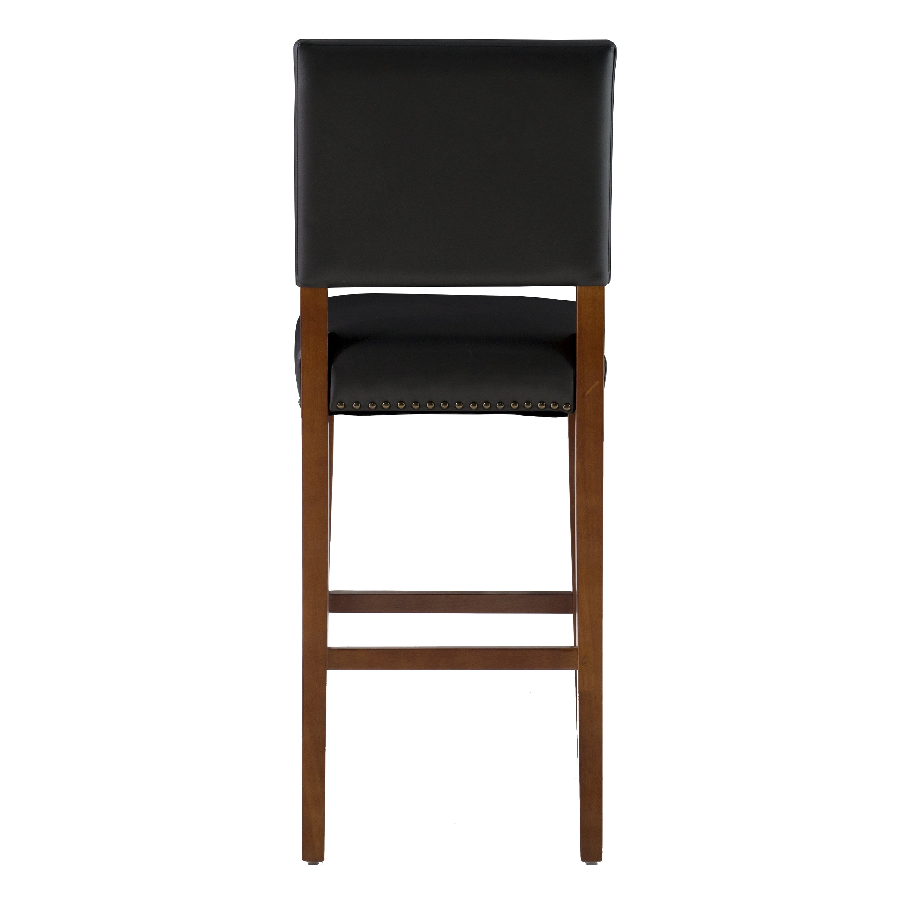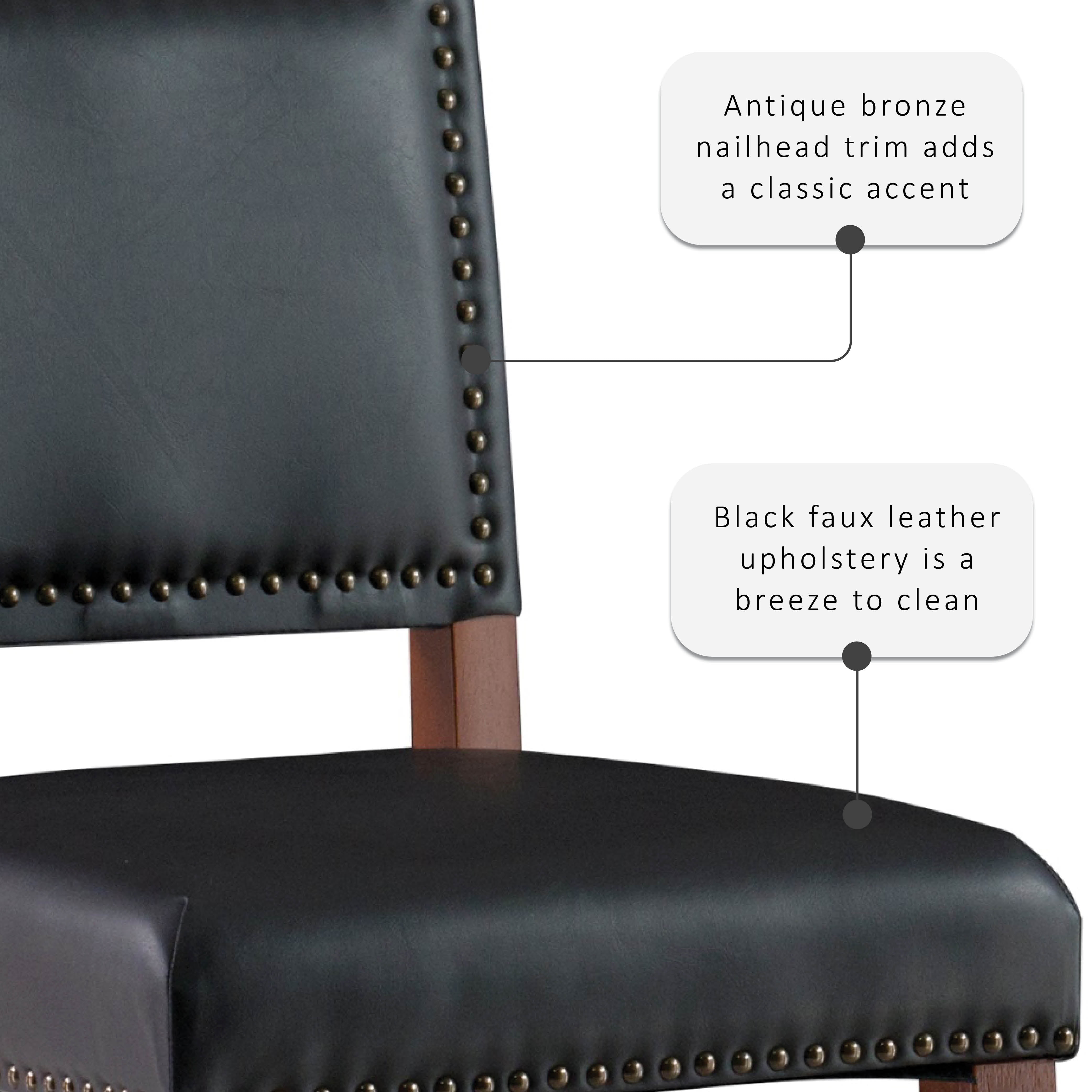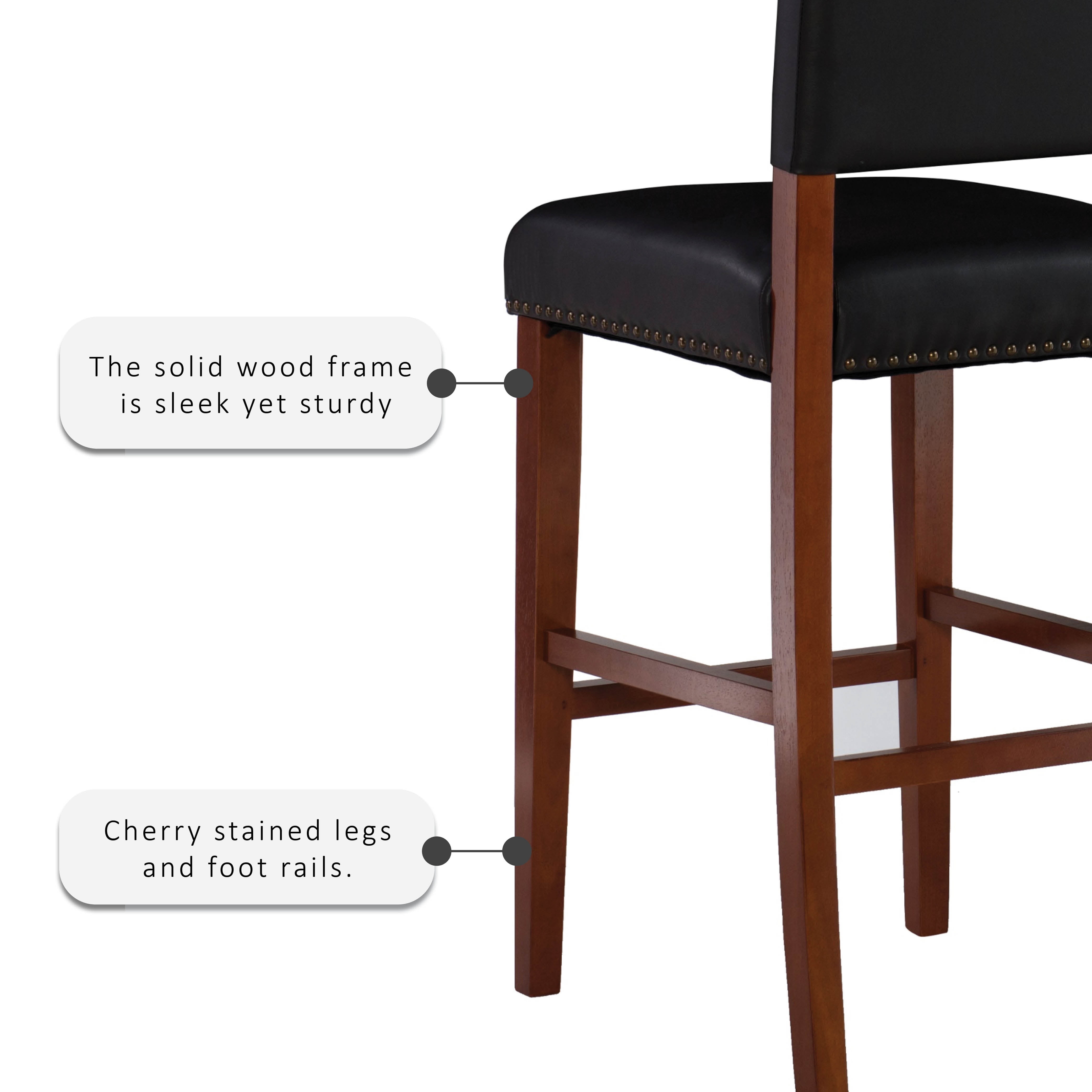 Accent your kitchen with this transitional Linon Dawn 30″ Bar Stool. Ideal for casual drinks and dining around a bar, or games at a pub height table, this stool works best with bars with heights of 41″ to 43″ H. The solid wood frame is sleek yet sturdy with cherry stained legs and foot rails. Black faux leather upholstery is a breeze to clean and comfortably cushioned. Antique bronze nail head trim adds a classic accent. Place several around your bar to make a stunning statement.