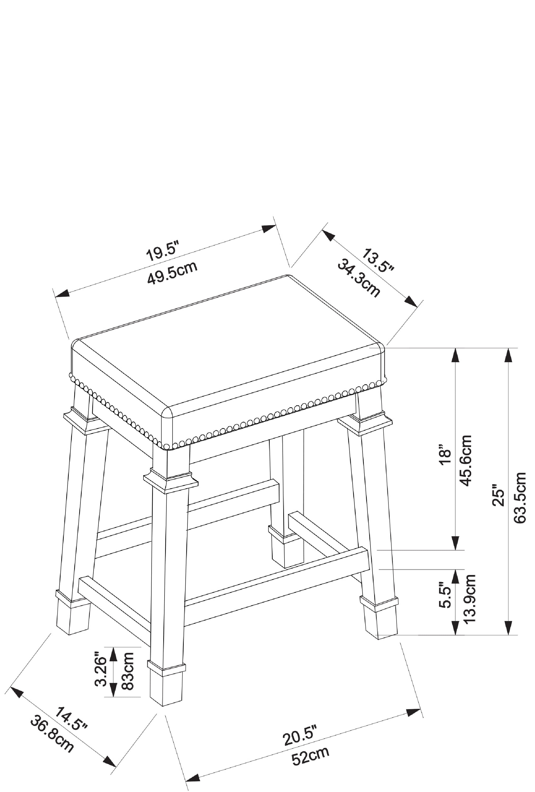 Decorative Wood Trim on Legs Black Finish Black and White Tweed Fabric Seat Shiny Silver Nailheads Seat height 25″ Weight Limit: 275 lbs Assembled Dimensions: 20.47″w x 14.5″d x 25″h Ships in 1 box