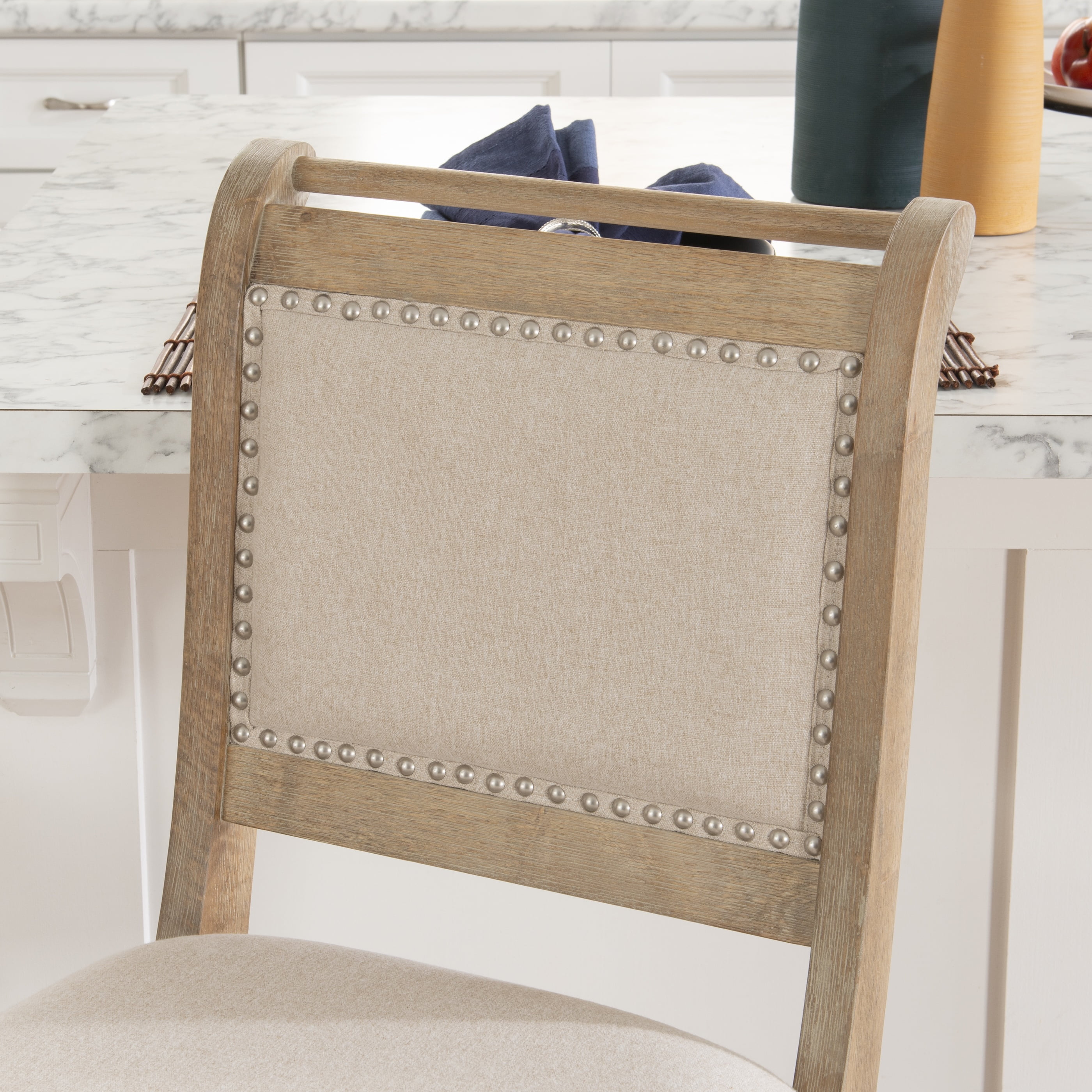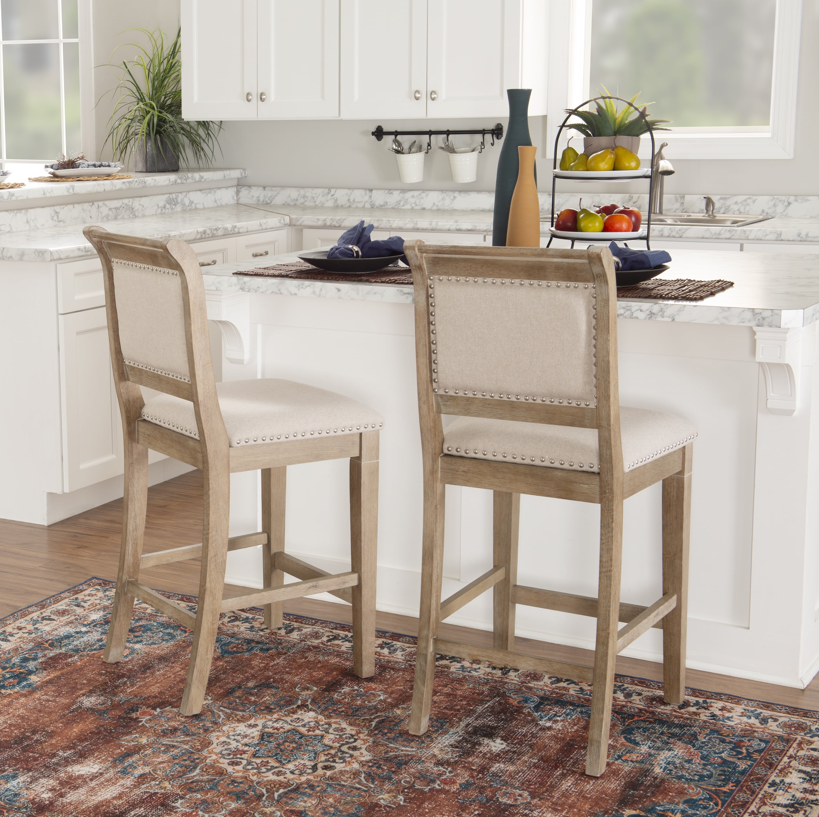 Counter Height Brushed Silver Nailheads Rustic Wash Finish Stripe Upholstery Footrails Provide Stability – Footrest Distance to Floor: 8″, Footrest Distance to Seat: 18″ Back Height: 20″, Back Width: 18″ Ships in 1 box Assembly Required