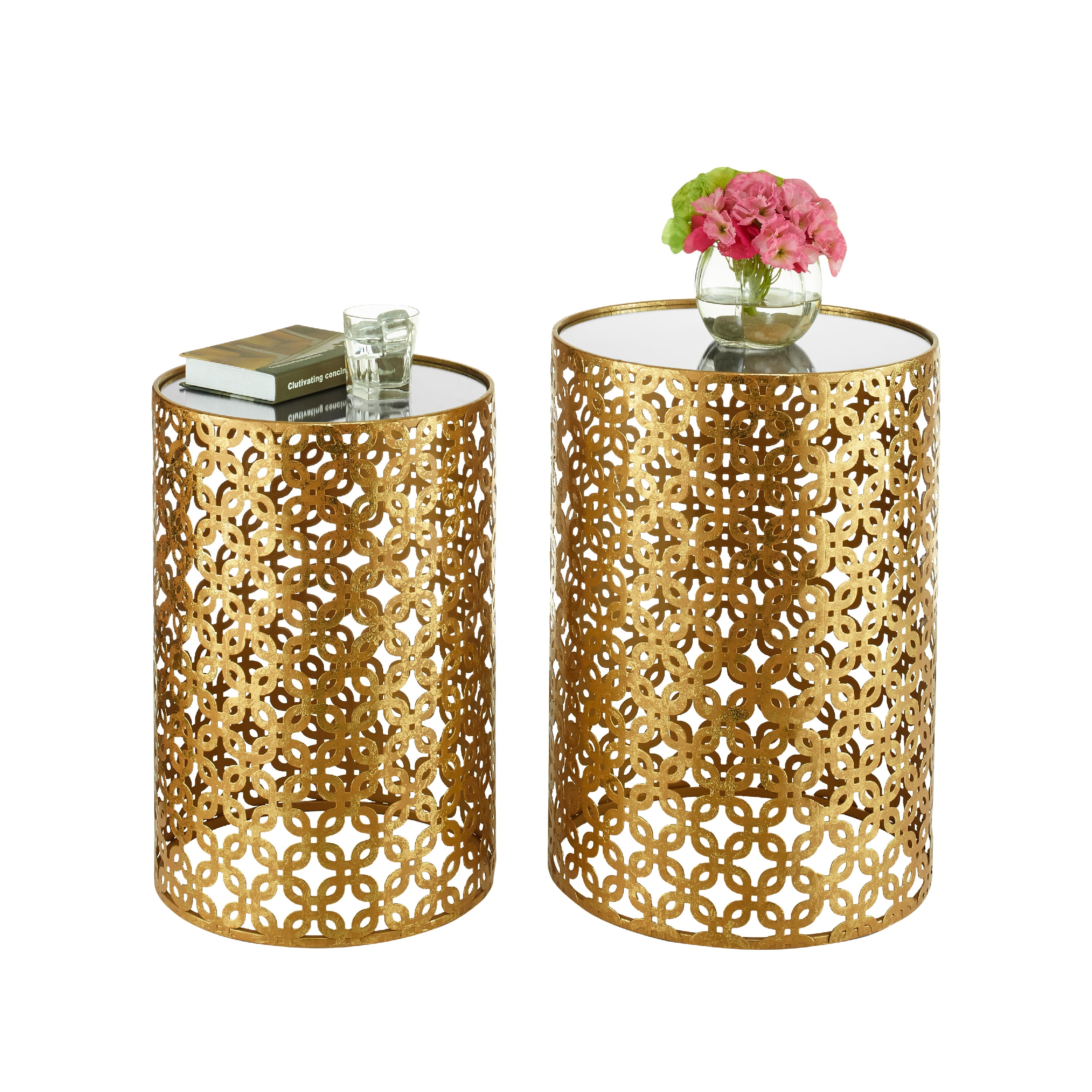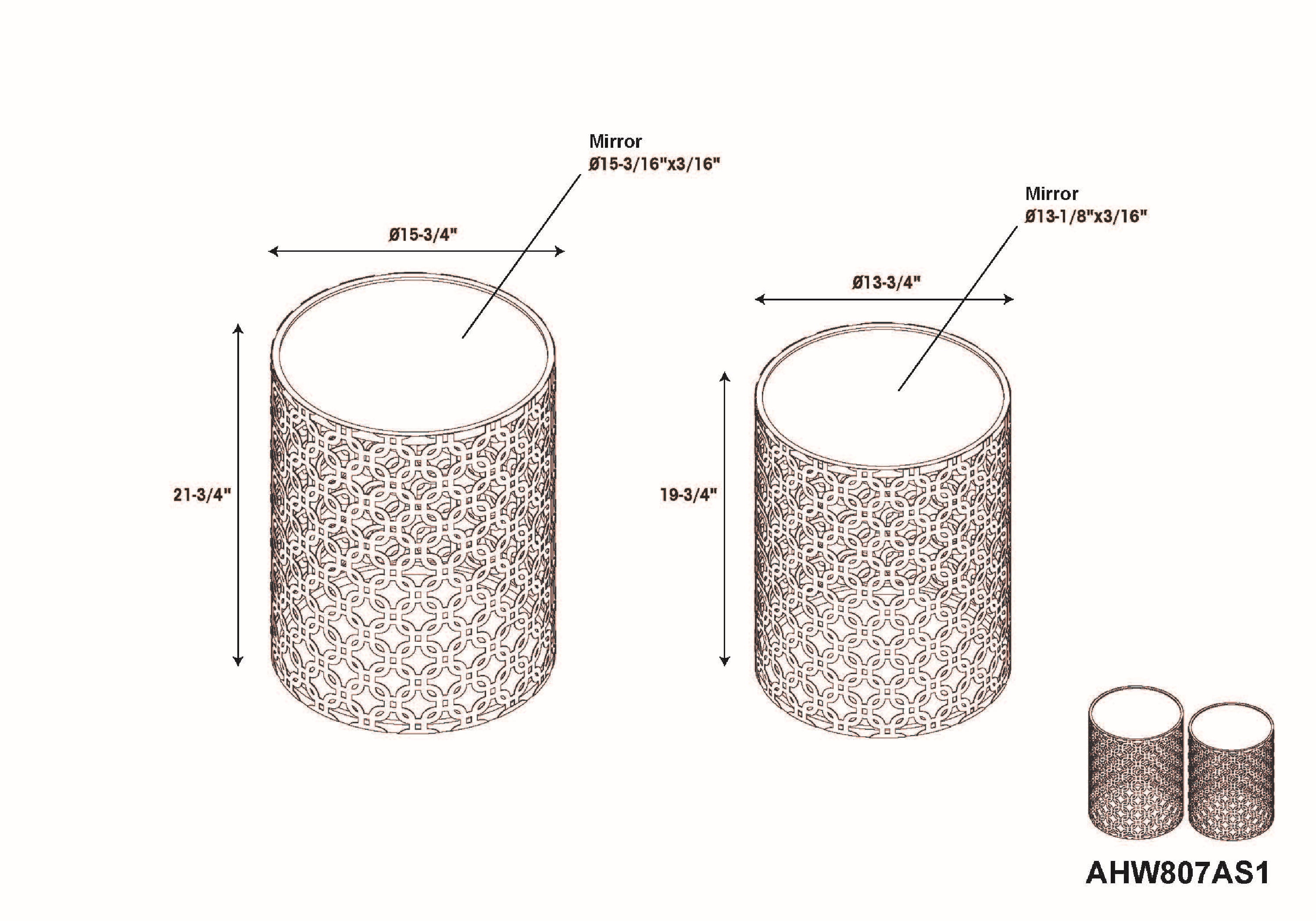 Glamorous Design and Style Gold Leaf Finish Mirrored Table Tops Set of Two Decorative pierced metal design Not Food Safe Weight of Large: 7.26 lbs, Weight of Small: 5.5 lbs Large: 15.75″ w x 15.75″ d x 21.75″ h ; Small: 13.75″ w x 13.75″ d x 19.75″ h Assembled Dimensions: 15.75″ w x 15.75″ d x 21.75″ h Fully Assembled Ships in 1 box