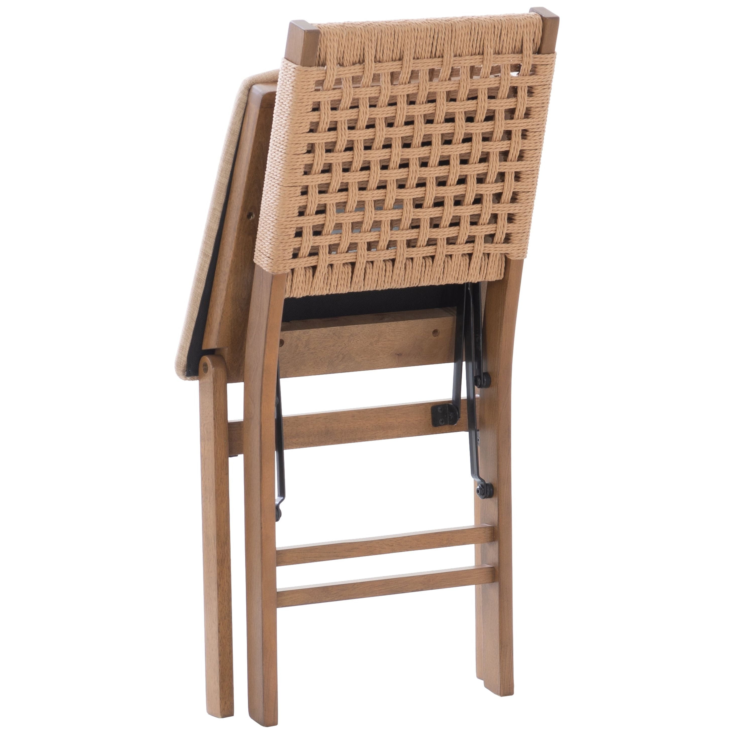 Arrives in a set of 2 Folds into compact configuration for efficient storage Solid rubberwood construction ensures long term durability and stability Woven paper rope backs in natural hues offer an open and airy look in a nod to classic midcentury Scandinavian design Brown stain pairs seamlessly with surrounding decor and clear finish offers extra protection and shine Linen look poly fabric upholstery on seats is soft to the touch and a breeze to maintain Metal hardware offers ease of use and extra stability 19″ seat height perfect for tables 28″ to 30″ high Supports up to 225 lbs Arrives with some assembly required Assembled Dimensions: 17″ W x 20″ D x 32.75″ H Ships in 1 box