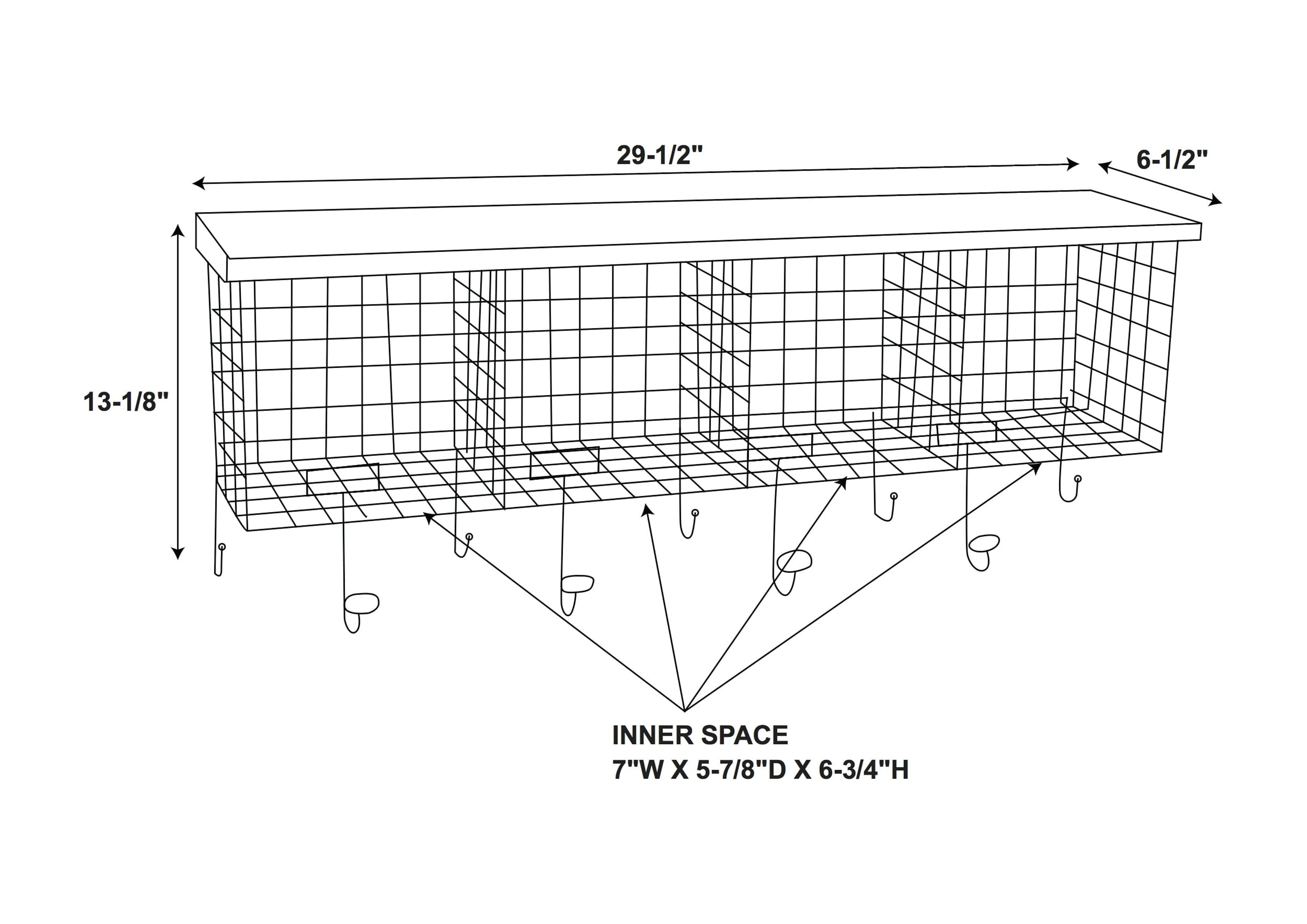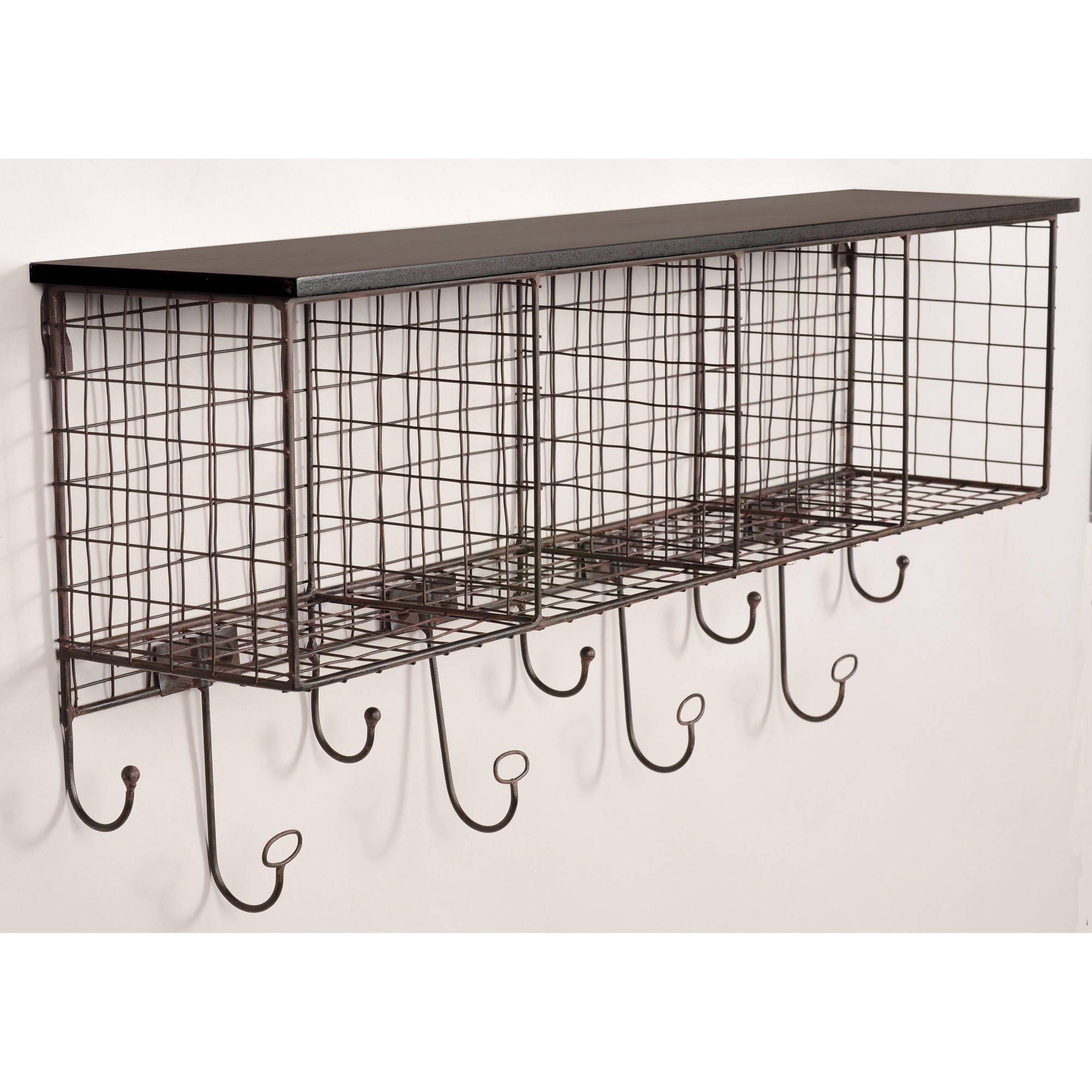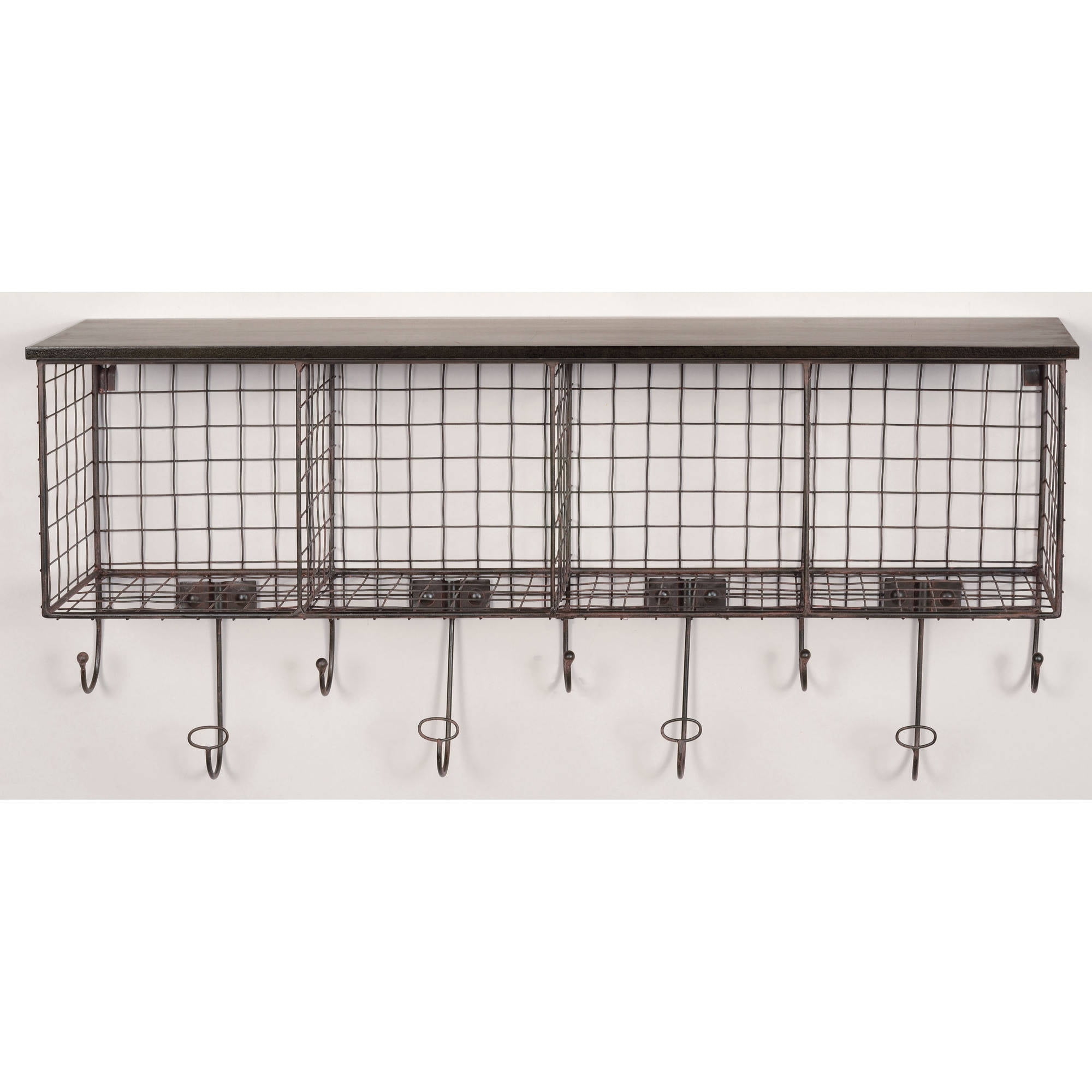 The Four Cubby Wall Shelf will add storage to an area while saving valuable floor space. Four grid style metal cubbies provide room for storing and displaying a variety of items. Nine storage hooks allow you to hang coats and bags. A black distressed top provides an additional area to display items. Perfect for an entry, office or hallway. Features: Crafted from Steel and MDF Black Finish Hangs on the wall for space saving storage. Perfect for an entry, hall or office. Grid Metal Black MDF Distressed Top Nine Storage Hooks Four Storage Cubbies Cubes measure approximately 7″x7″ Specifications: Assembly Required: Some Assembly Required Product Dimensions: 29.5″w x 6.5″d x 12.5″h Product Weight: 5.5 lbs Weight Capacity: Top 20 lbs. Bin 10 lbs. Hook 5 lbs.