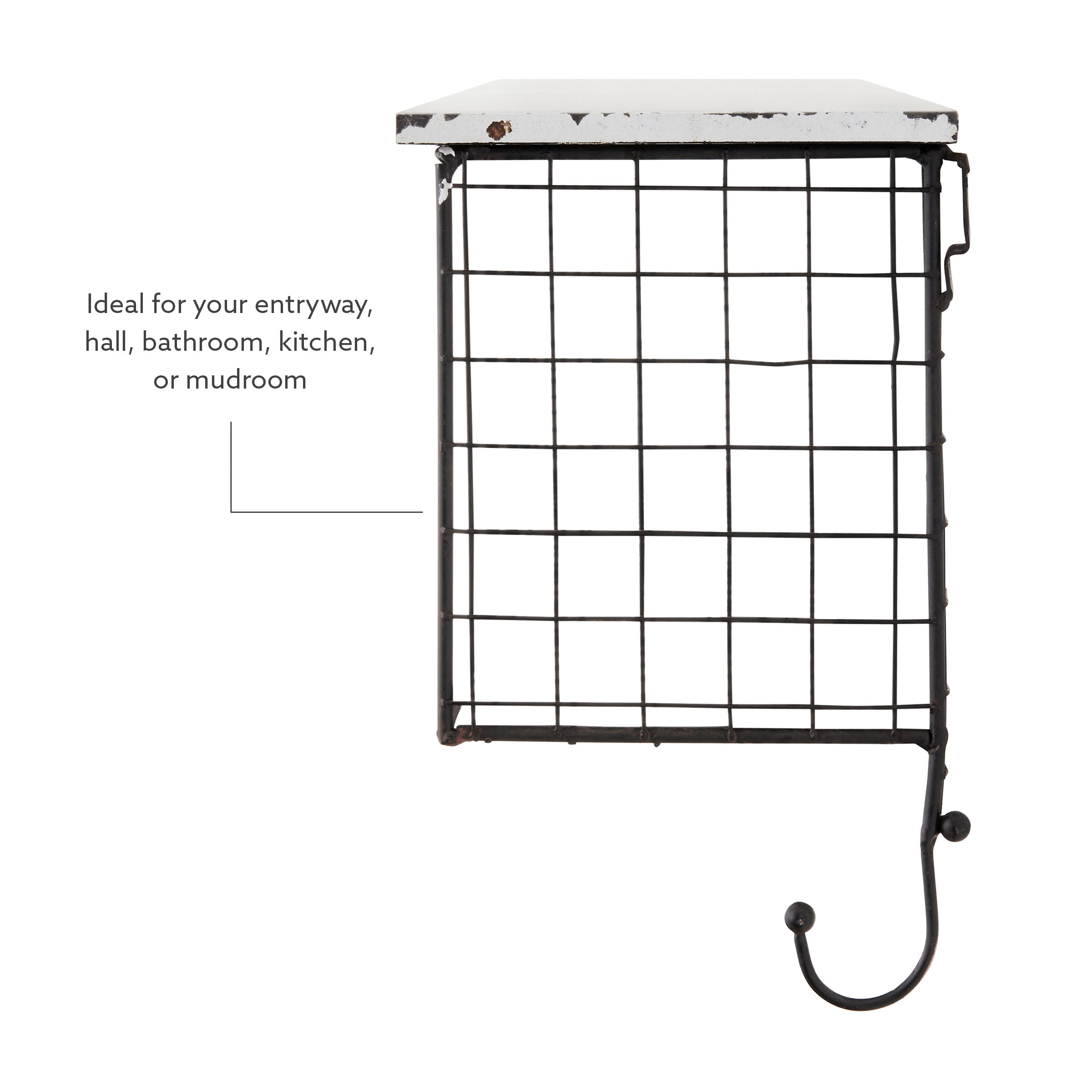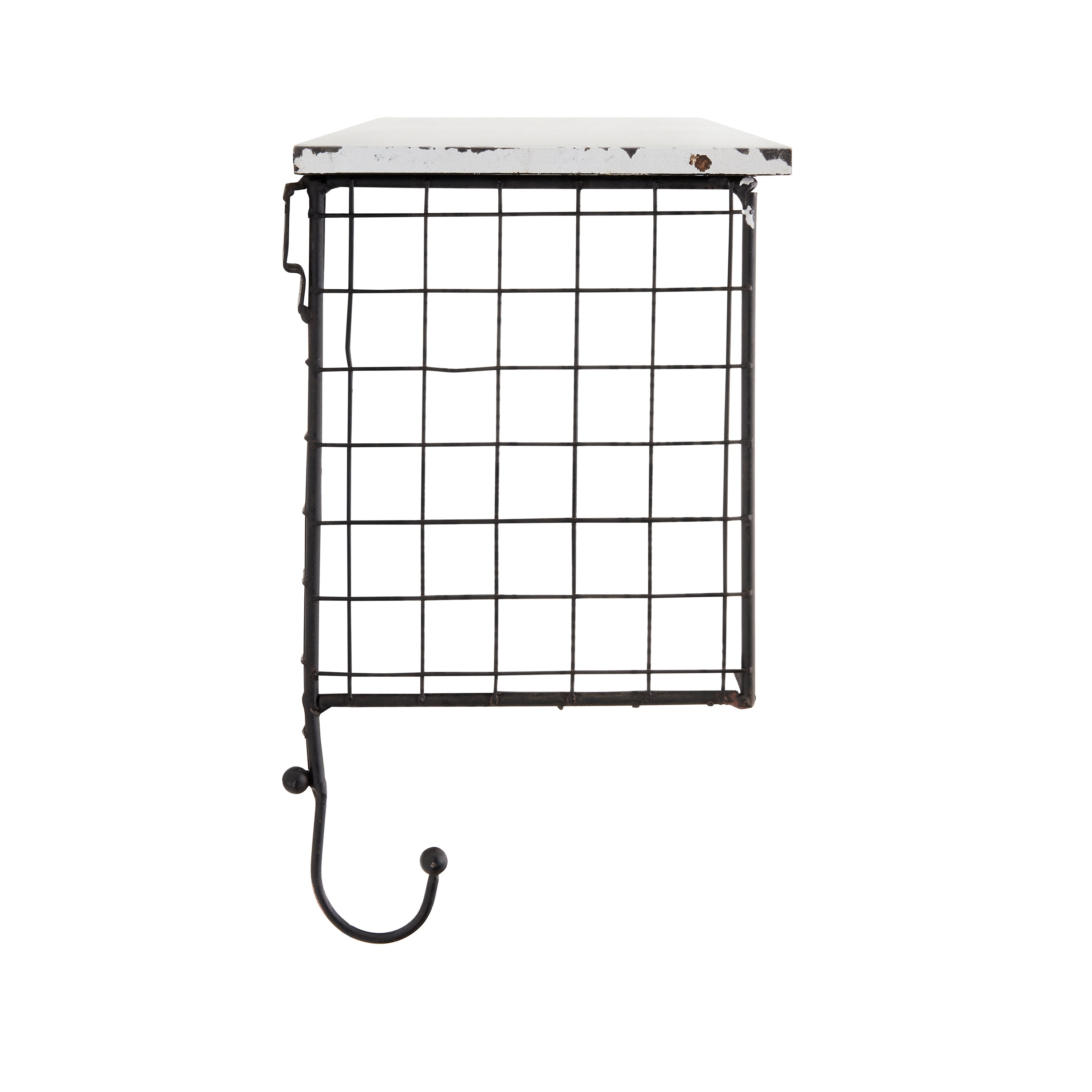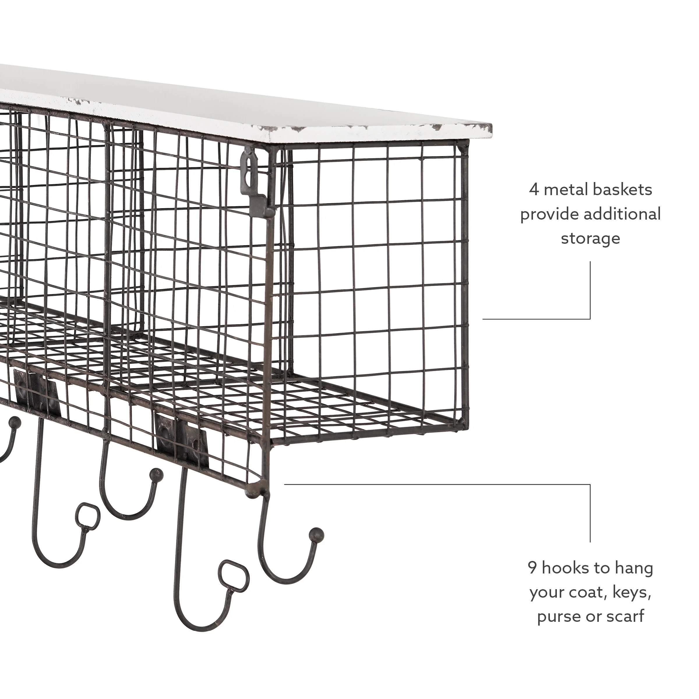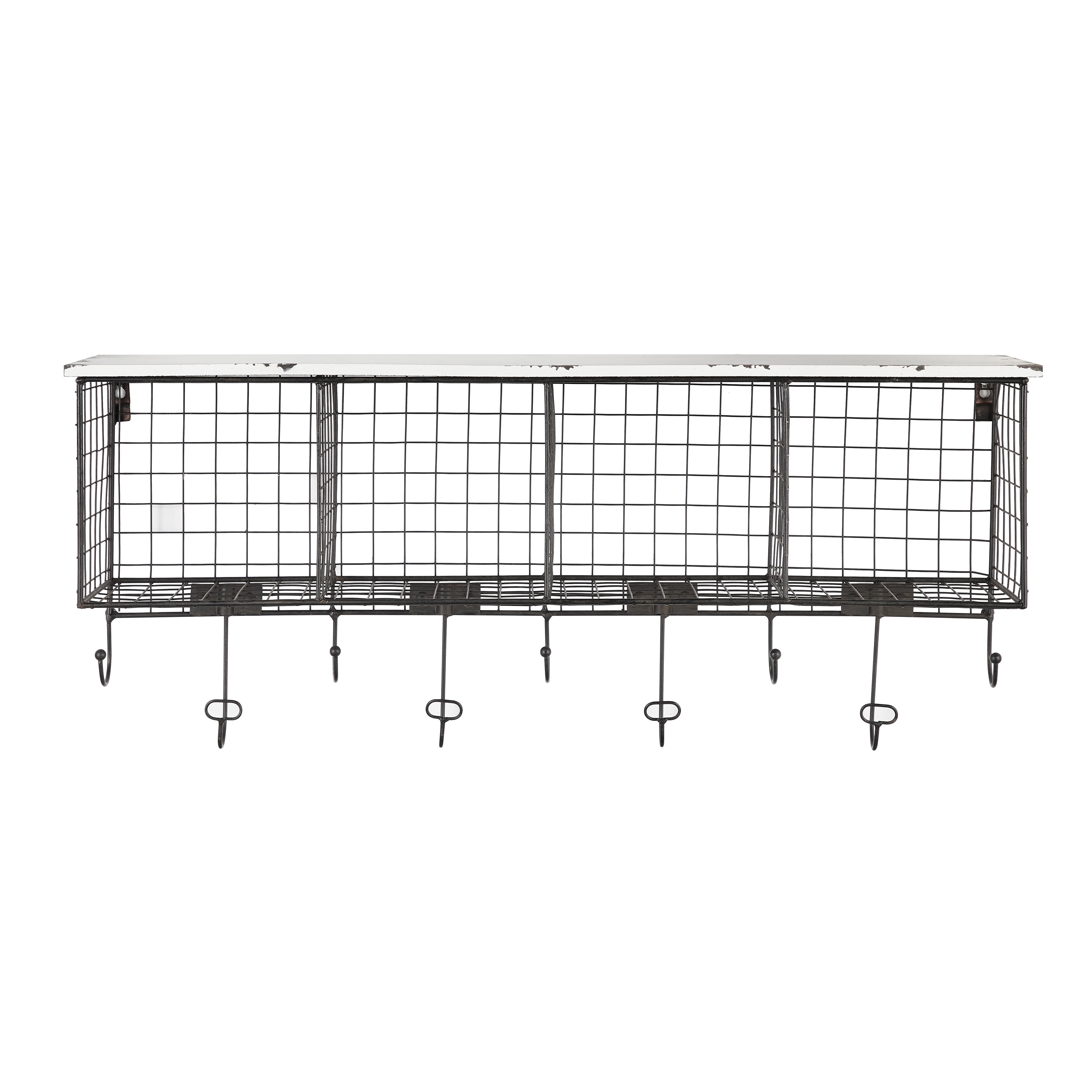 Color: White Bullet Feature 3: Grid metal Bullet Feature 2: Perfect for an entry hall or office. Bullet Feature 1: Hangs on the wall for space saving storage Bullet Feature 7: 100 percent metal wrought iron Bullet Feature 6: Four storage cubbies Bullet Feature 5: Nine storage hooks Bullet Feature 4: White mdf distressed top Weight (lbs.): 5.50 lb Length (in.): 6.5 Width (in.): 29.5 Height (in.): 12.5