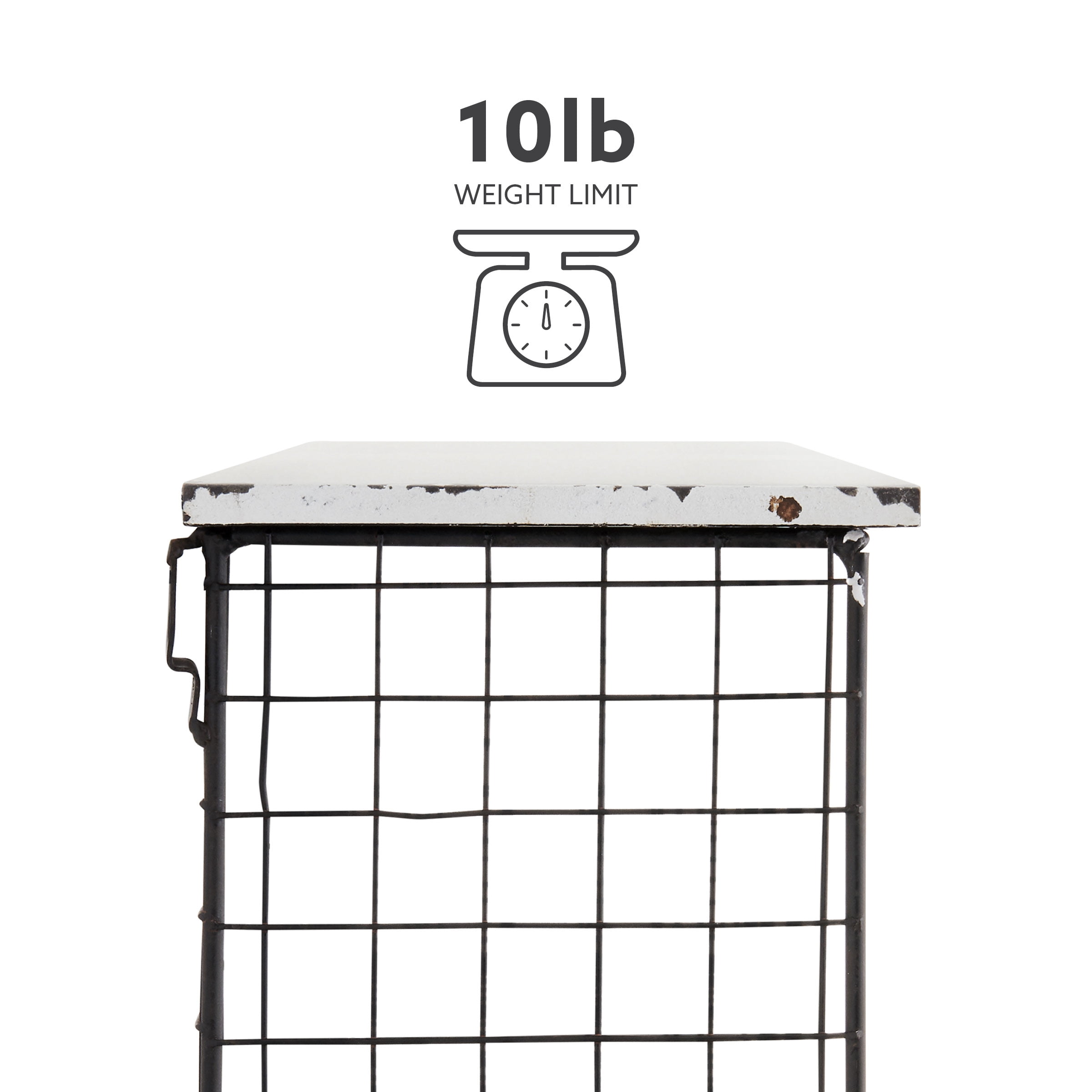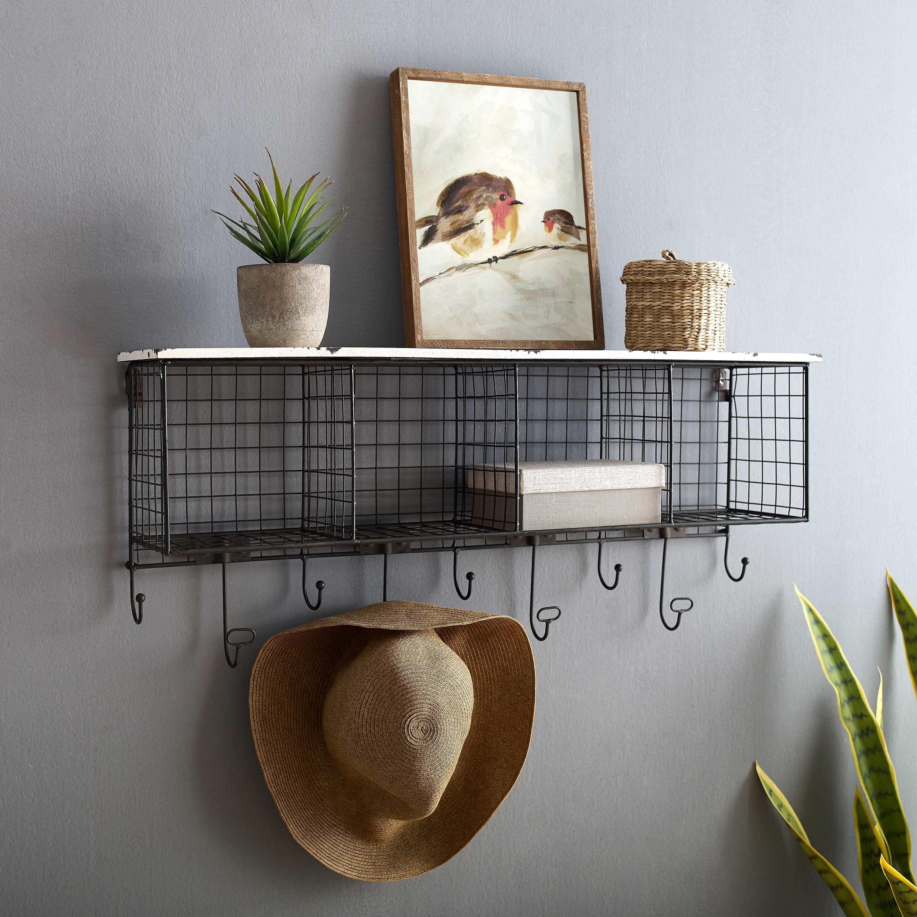 The Four Cubby Wall Shelf will add storage to an area while saving valuable floor space. Four grid style metal cubbies provide room for storing and displaying a variety of items. Nine storage hooks allow you to hang coats and bags. A white distressed top provides an additional area to display items. Perfect for an entry, office or hallway. Features: Crafted from Steel and MDF Black and White Finish Hangs on the wall for space saving storage. Perfect for an entry, hall or office. Grid Metal White MDF Distressed Top Nine Storage Hooks Four Storage Cubbies Specifications: Assembly Required: Some Assembly Required Product Dimensions: 29.5″w x 6.5″d x 12.5″h Product Weight: 5.5 lbs Weight Capacity: Top 20 lbs. Bin 10 lbs. Hook 5 lbs.