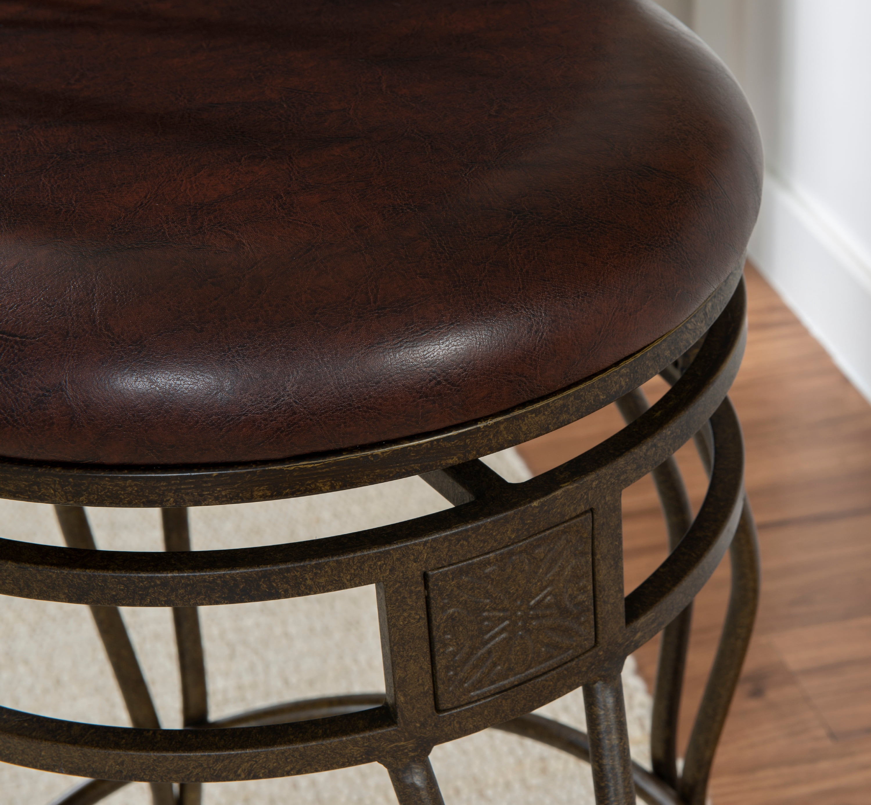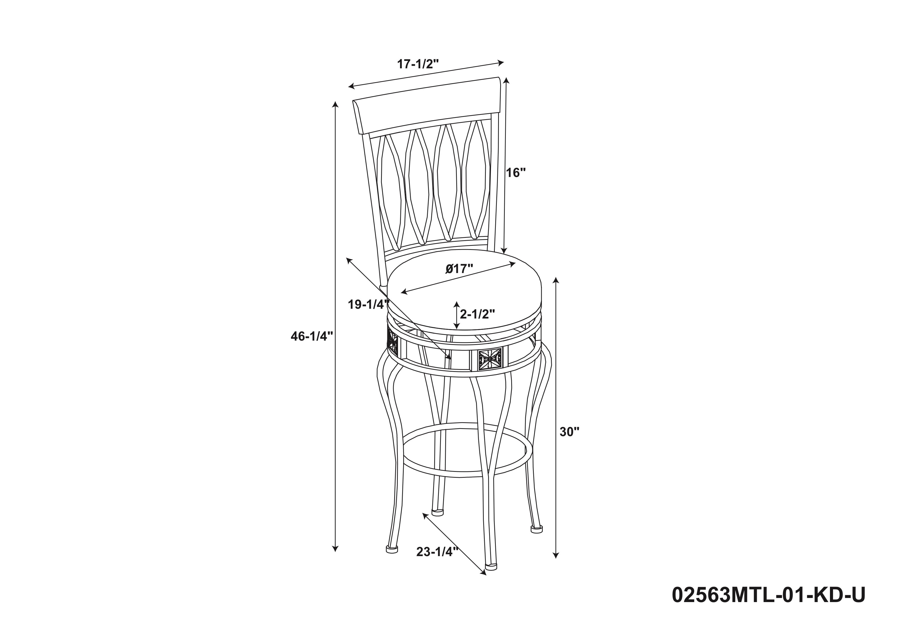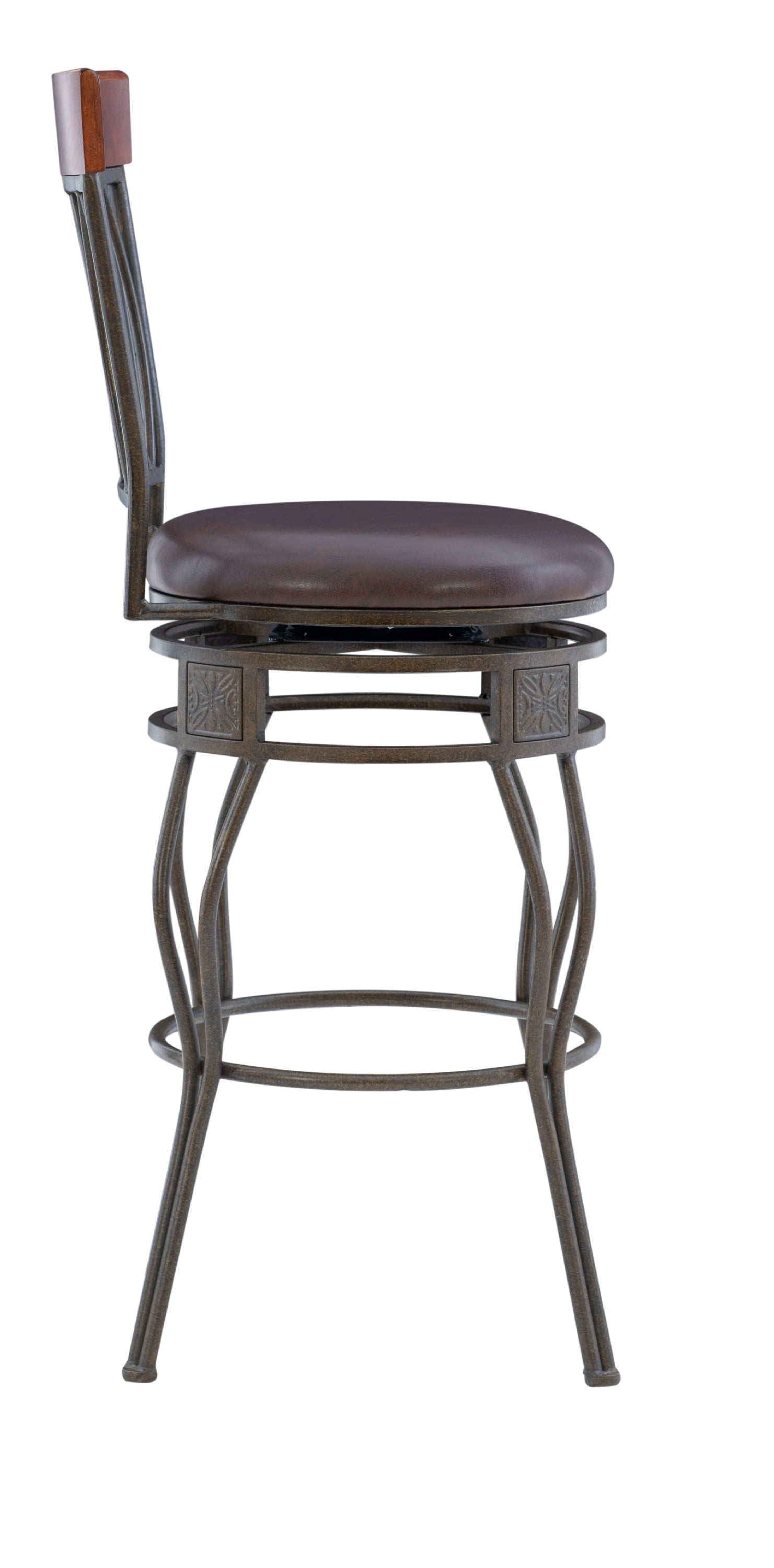 Matte Bronze finish Wipe clean Brown PVC Vinyl seat cover The cushion is piled high for extra comfort Crafted of metal and highlighted with subtle curves 30″ seat height, Seat Dimensions: 16.5″ x 16.5″ x 2″ Swivel seat Weight Limit: 275 lbs Assembled Dimensions: 17.5″w x 21.5″d x 46″h Ships in 1 box