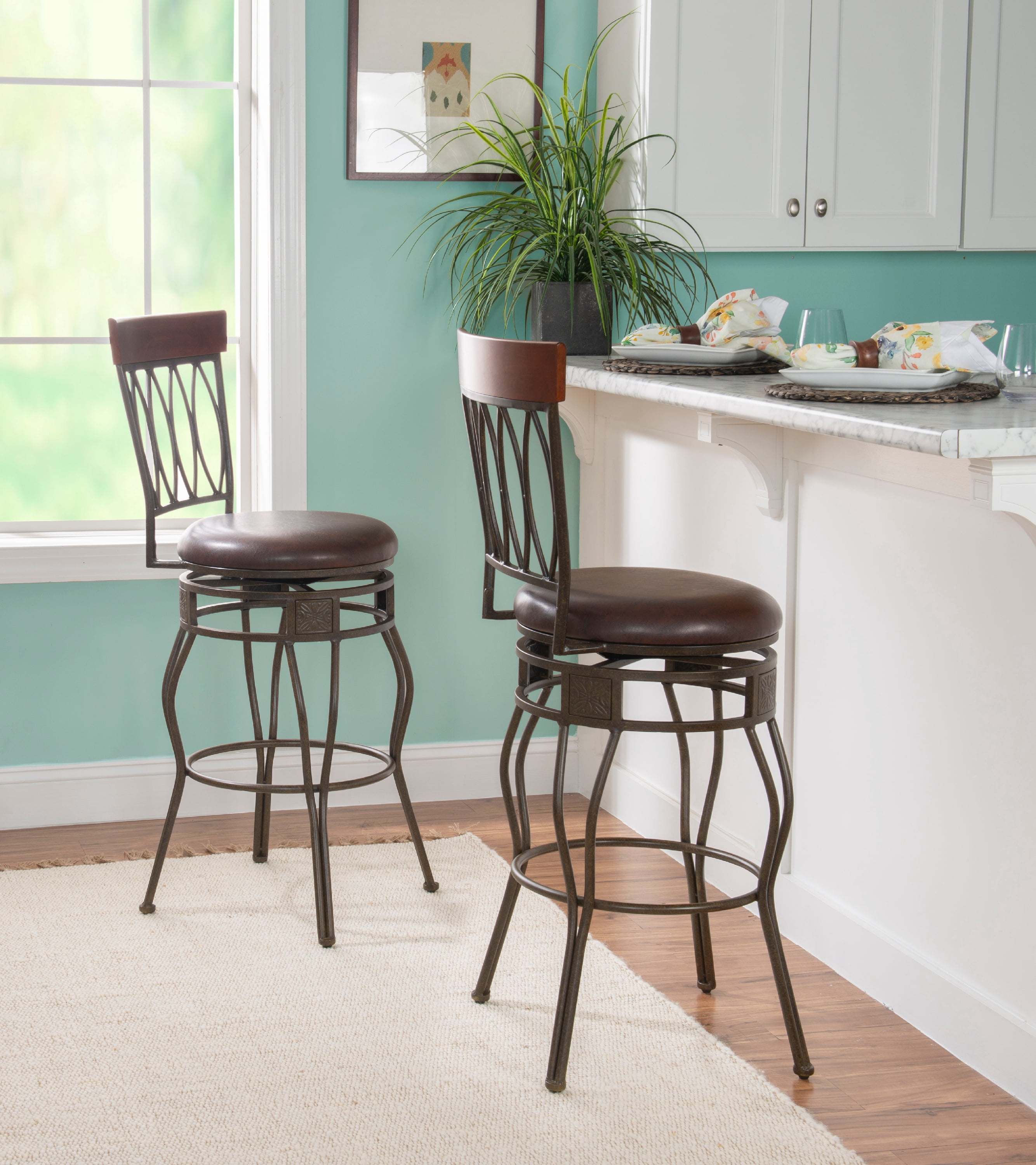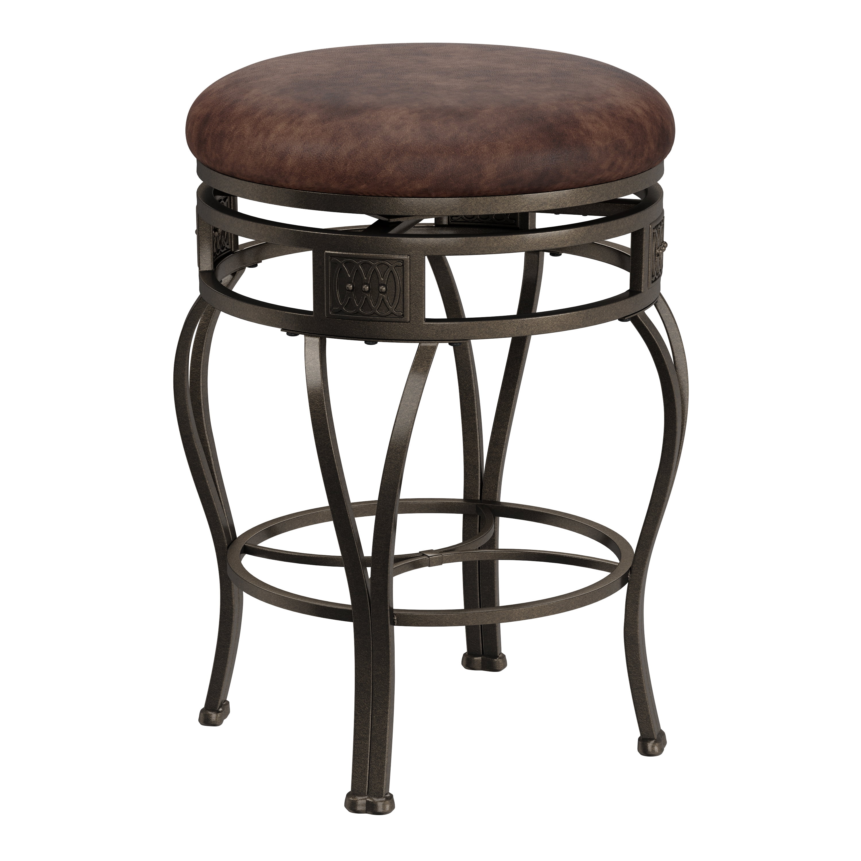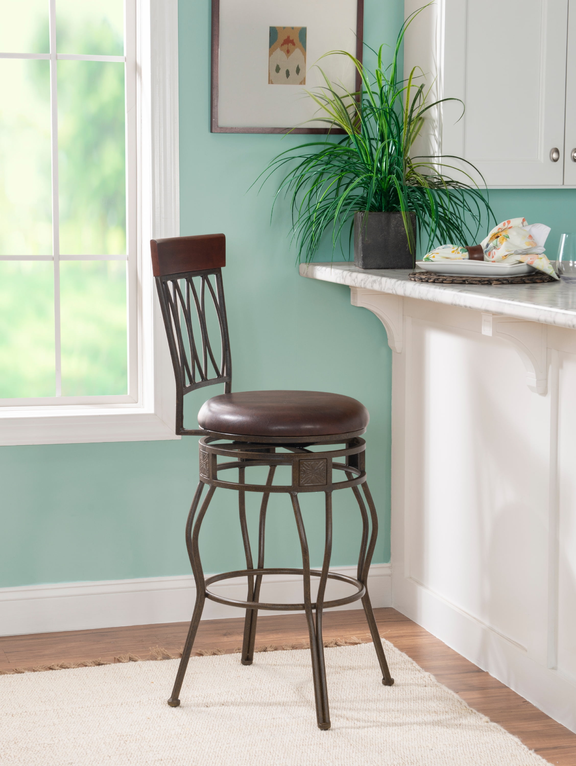 Matte Bronze finish Wipe clean Brown PVC Vinyl seat cover The cushion is piled high for extra comfort Crafted of metal and highlighted with subtle curves 30″ seat height, Seat Dimensions: 16.5″ x 16.5″ x 2″ Swivel seat Weight Limit: 275 lbs Assembled Dimensions: 17.5″w x 21.5″d x 46″h Ships in 1 box