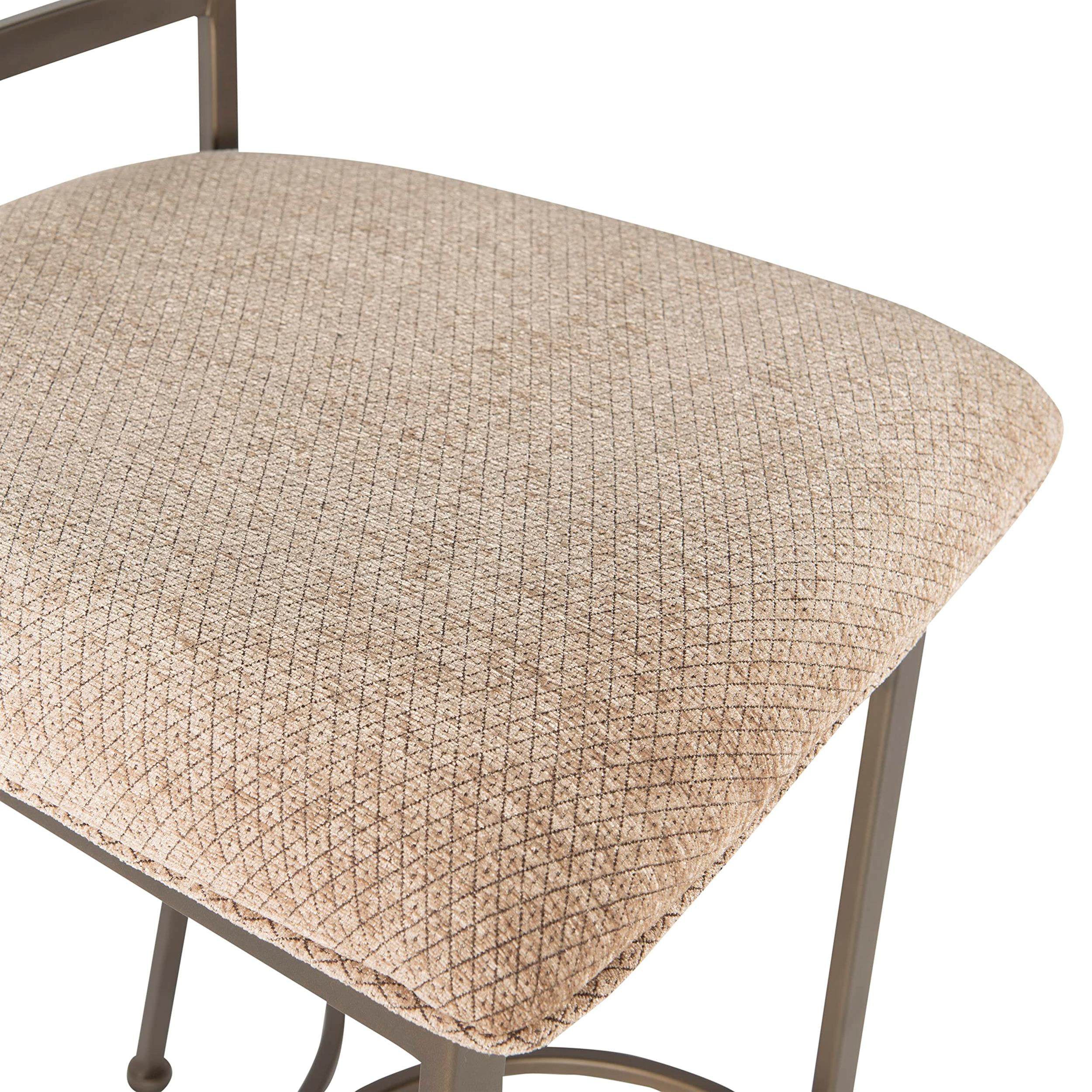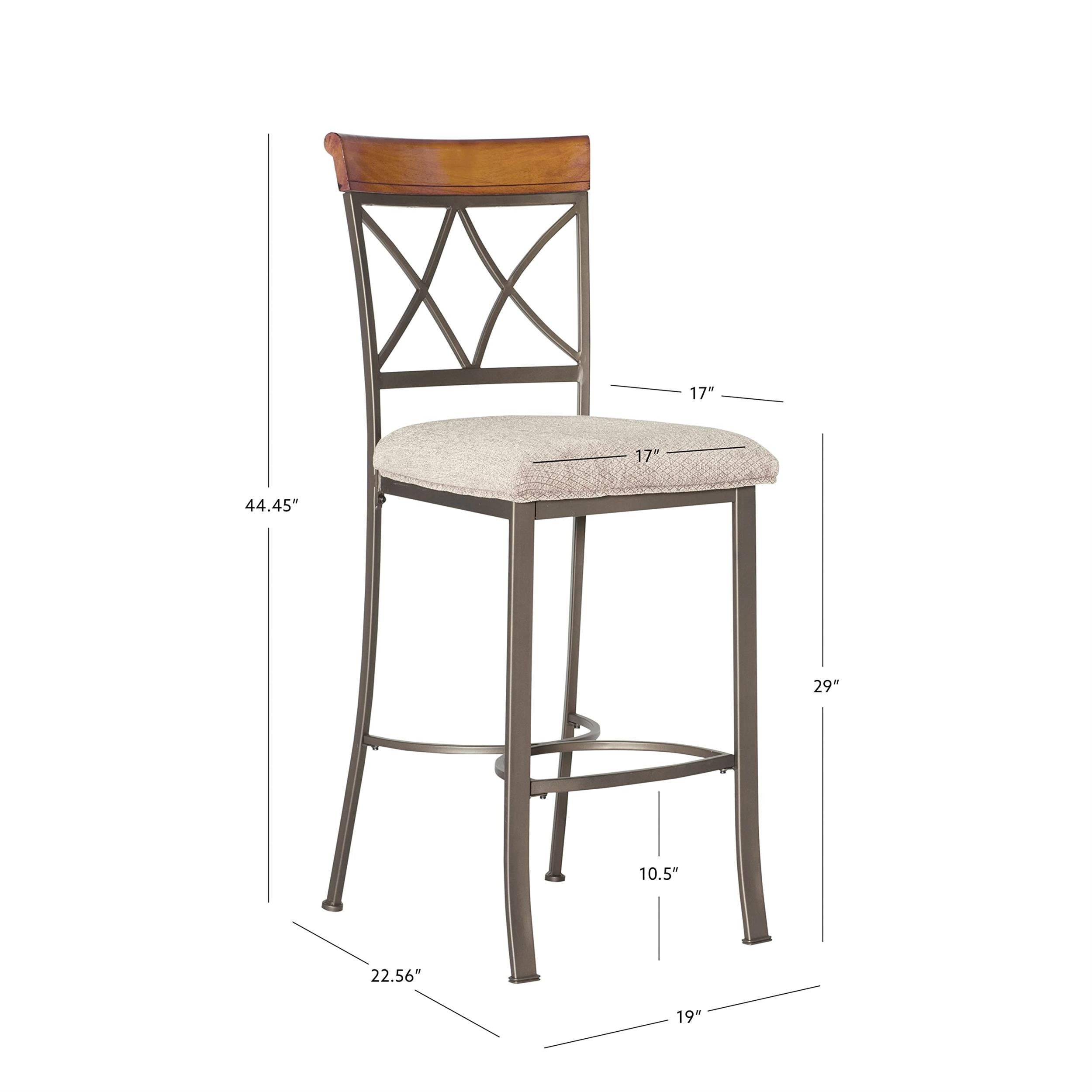 The 3-Piece Hamilton Pub Set is sure to add interest and ample table space. The Pub Table features an interesting curve and scroll designed bottom. The Bar Stools feature a diamond shaped back and slight curved legs. Finished in “Brushed Faux Medium Cherry” wood with “Matte Pewter and Bronze” steel frame. Some assembly required Features: Crafted from Steel, MDF with Birch Veneer, Particleboard, Oak, Foam and Fabric Brushed Faux Medium Cherry Wood Finish Matte Pewter and Bronze Metal Finish Diamond Pattern Taupe/Beige 100% Polyester Upholstery Curve and Scrool Design Three Piece Set includes one table and two stools This item will ship in multiple cartons. Cartons may arrive separately Specifications: Assembly Required: Some Assembly Required Product Dimensions: Pub Table: 36″ dia. x 40″ tall; Bar Stool: 19″ x 23.25″ x 44.5″ tall Product Weight: Table: 42.44 lbs, Stools: 18.07 lbs Seat Height: 29″ Weight Capacity: Table: 300 lbs